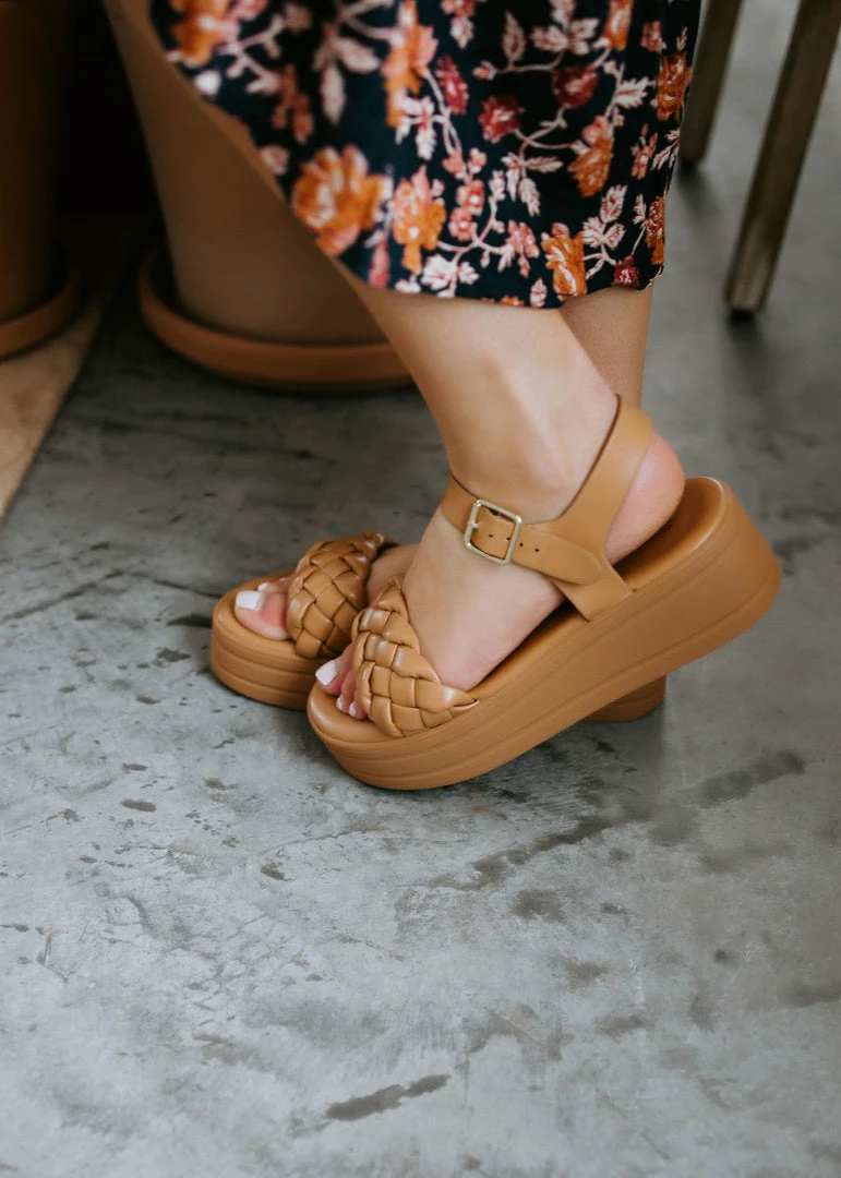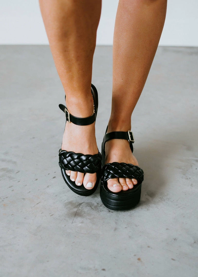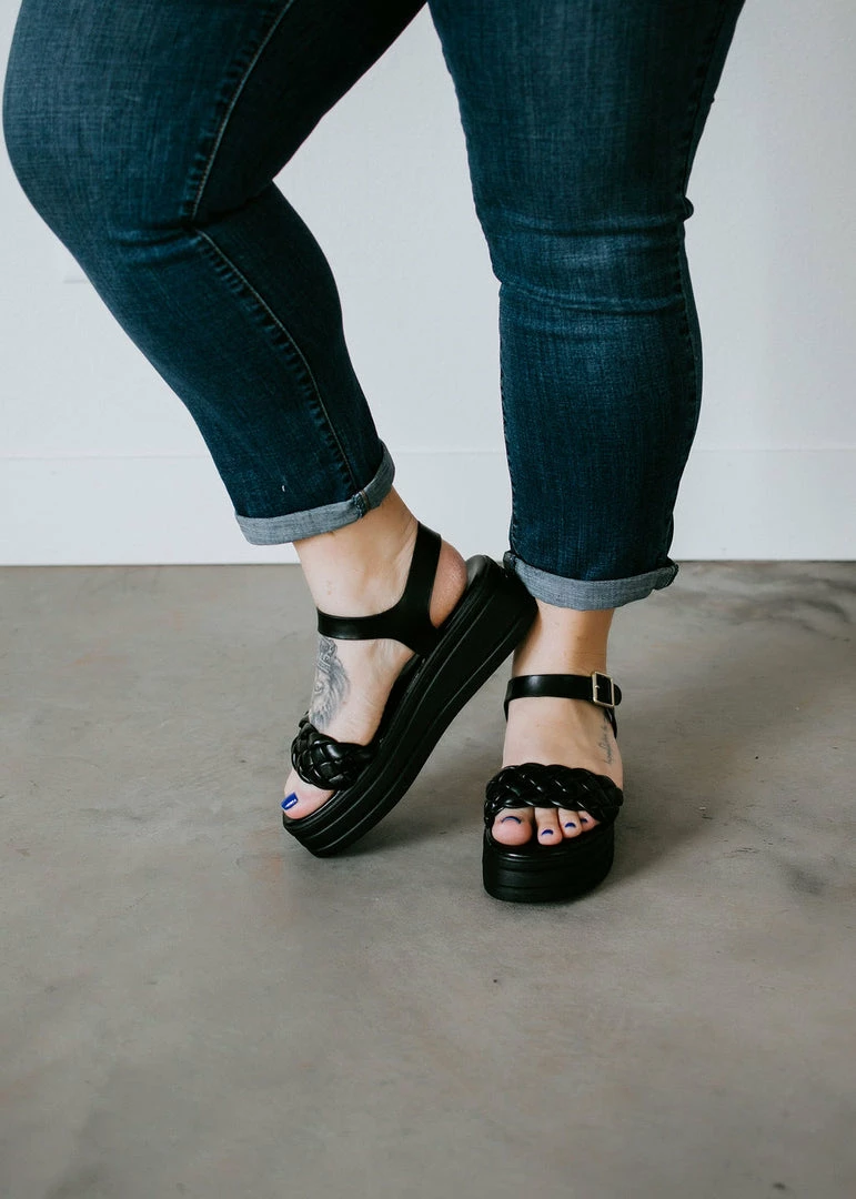 This platform sandal gives us the boost we need to spring into the new season! Features a puffy braided strap secures a faux leather sandal with a ankle buckle closure.
