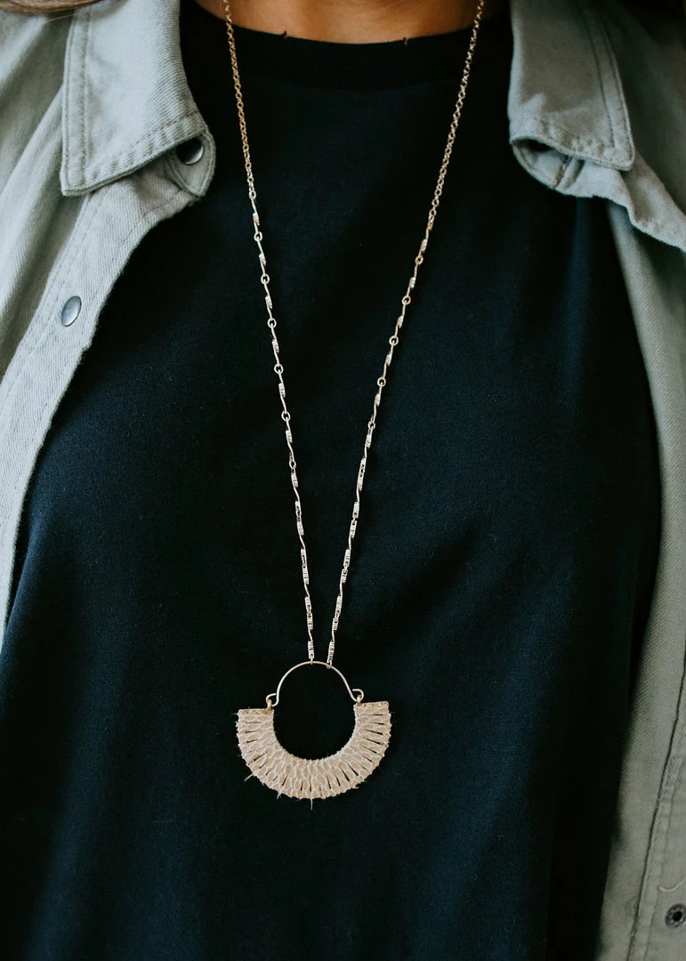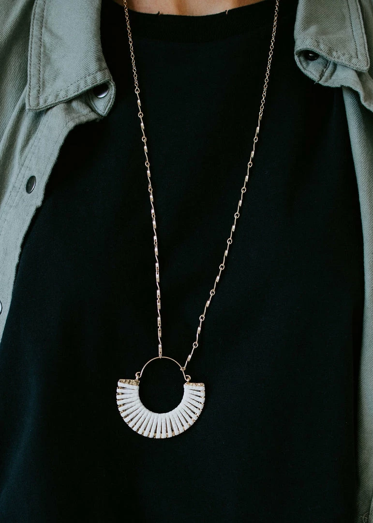 Incoming trend alert! This must-have necklace features a faux leather pendant suspended from a chic chain. Perfect for all your special summer events!