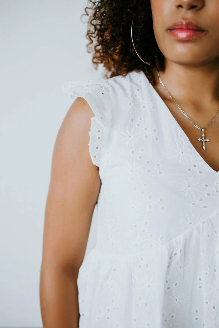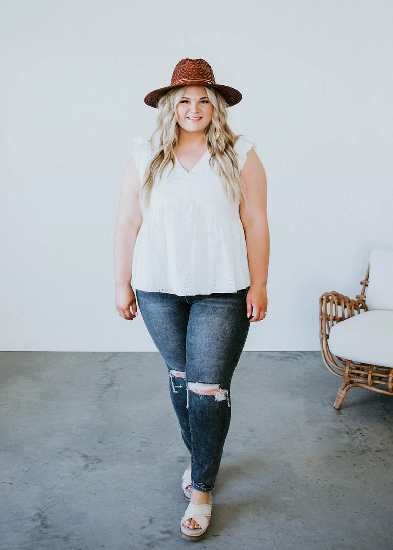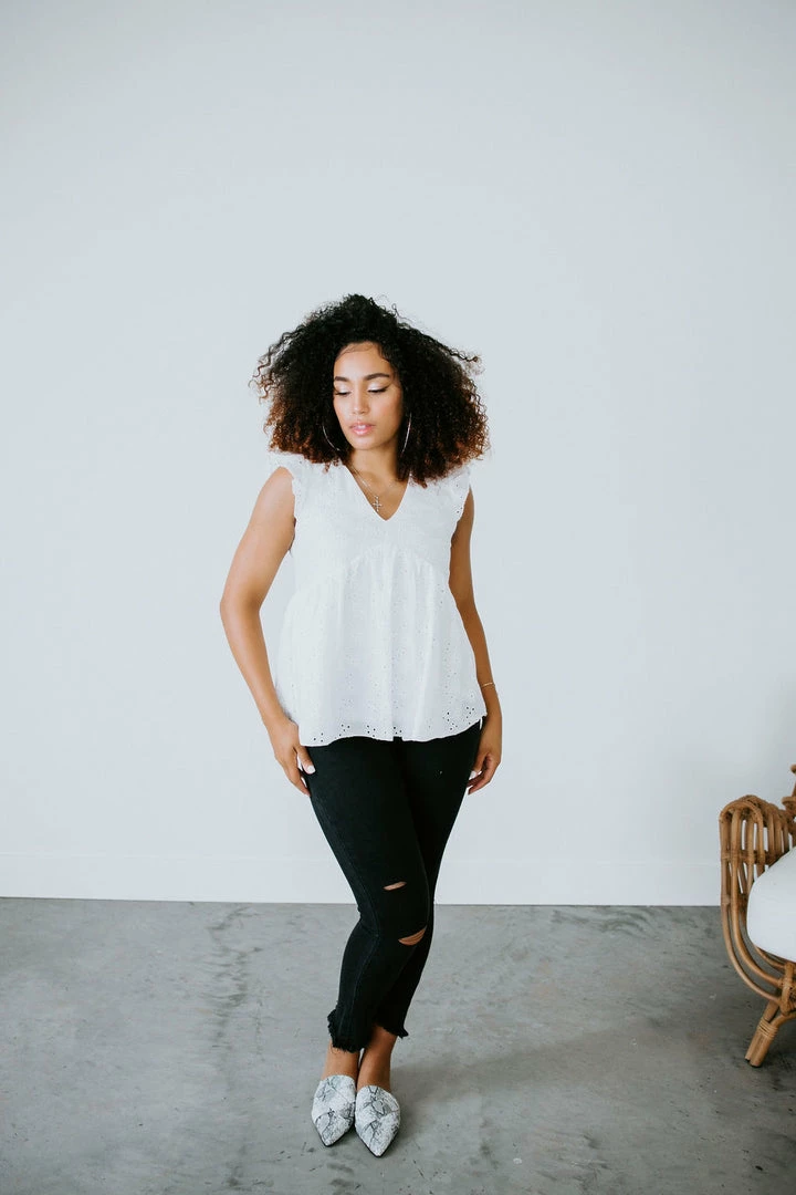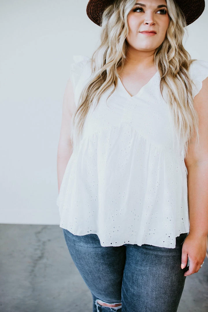 This adorable white top is beyond beautiful with its lightweight material designed with a relaxed babydoll silhouette that is easy to wear and pair over a bralette or tank. Complete with a ruffle sleeve and a V-neckline. Perfect with distressed denim and heels. Cathyliana is wearing a small and Hannah is wearing a 1XL.
