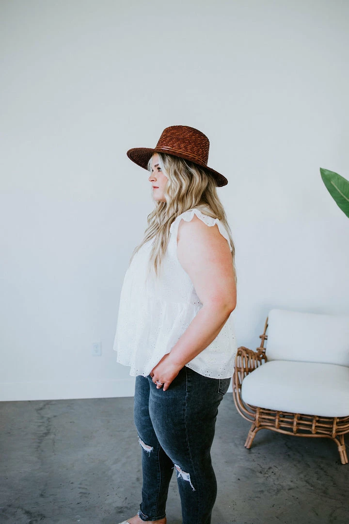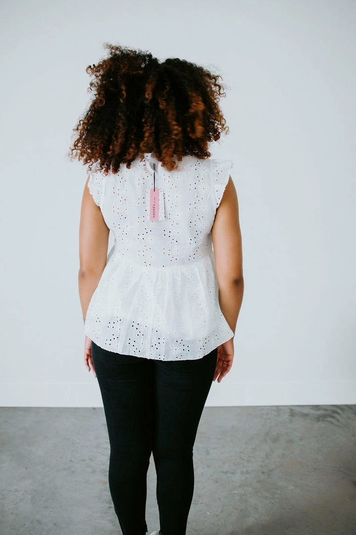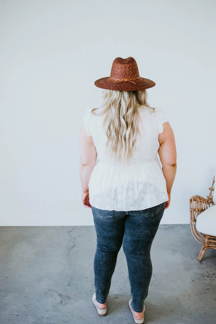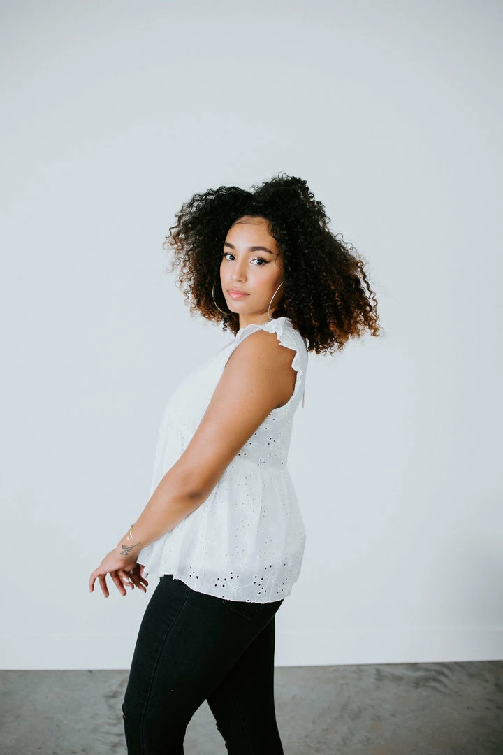 This adorable white top is beyond beautiful with its lightweight material designed with a relaxed babydoll silhouette that is easy to wear and pair over a bralette or tank. Complete with a ruffle sleeve and a V-neckline. Perfect with distressed denim and heels. Cathyliana is wearing a small and Hannah is wearing a 1XL.