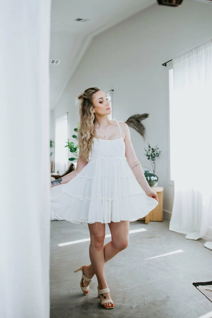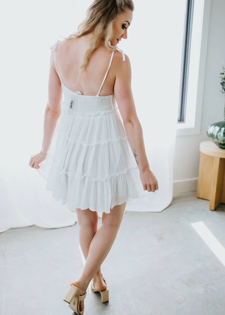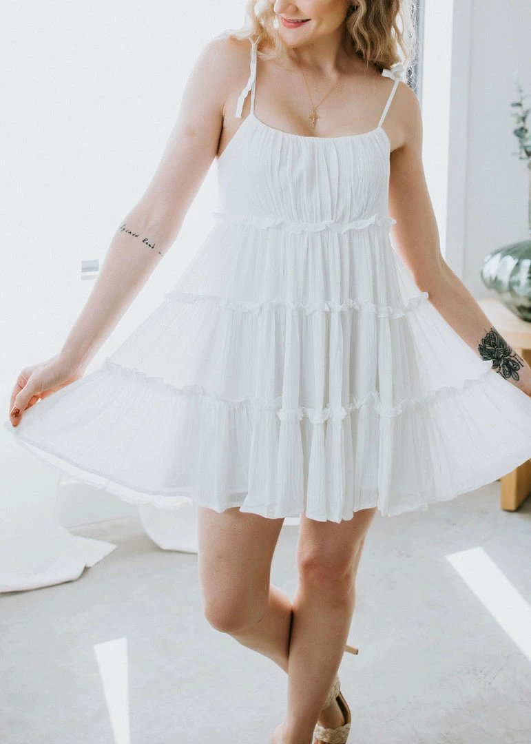 Look amazing from every angle in this dream of a dress! Styled with rows of ruffles at the bodice and a tiered mini-length skirt. Composed of gorgeous crinkle fabric with spaghetti strap details. A straight neckline in the front complements the romantic, breezy design. Leslie is wearing a small.