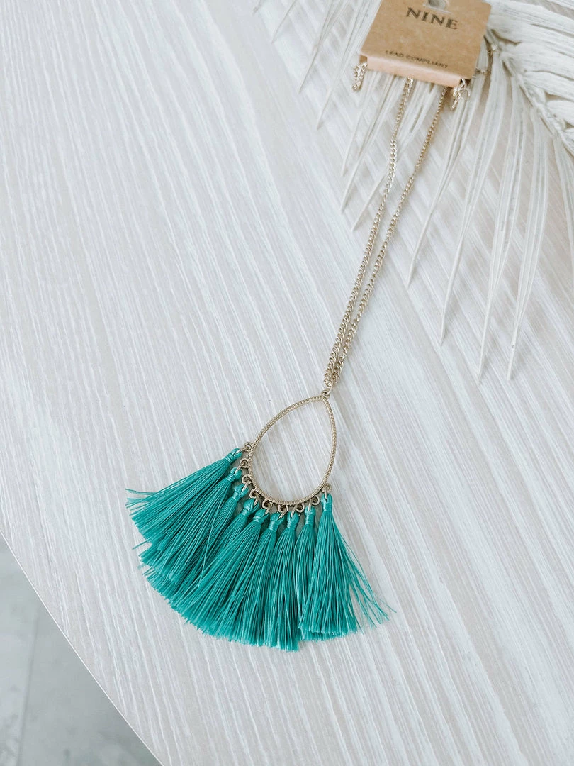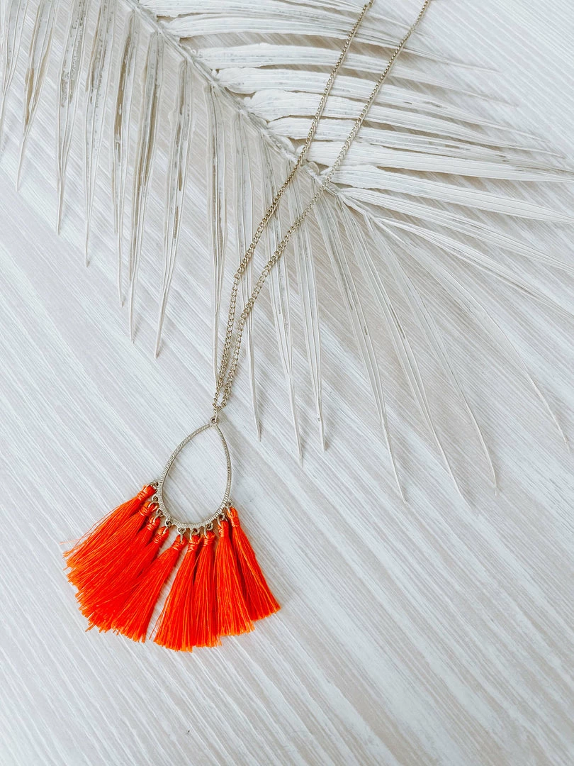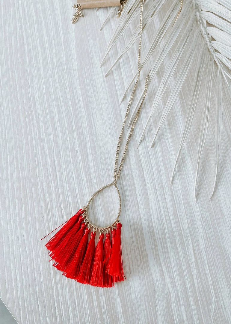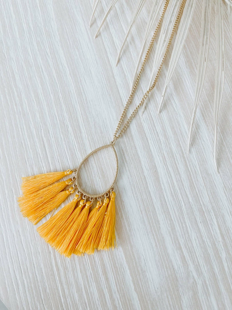 Shine bright in this gold necklace featuring a teardrop pendant with colorful tassels.