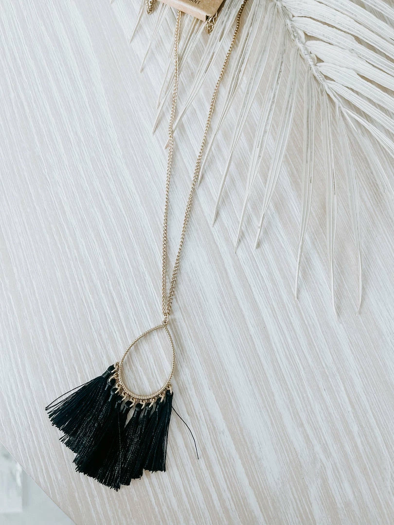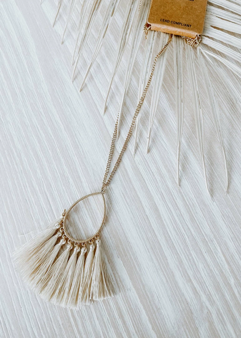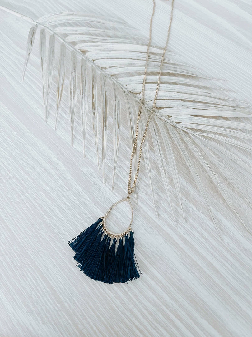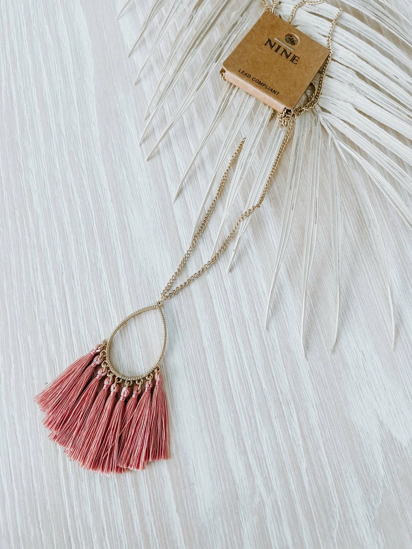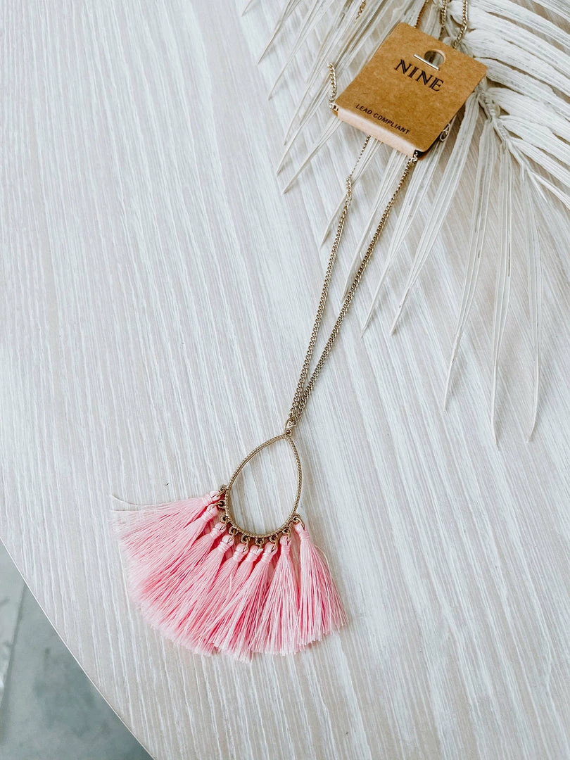 Shine bright in this gold necklace featuring a teardrop pendant with colorful tassels.