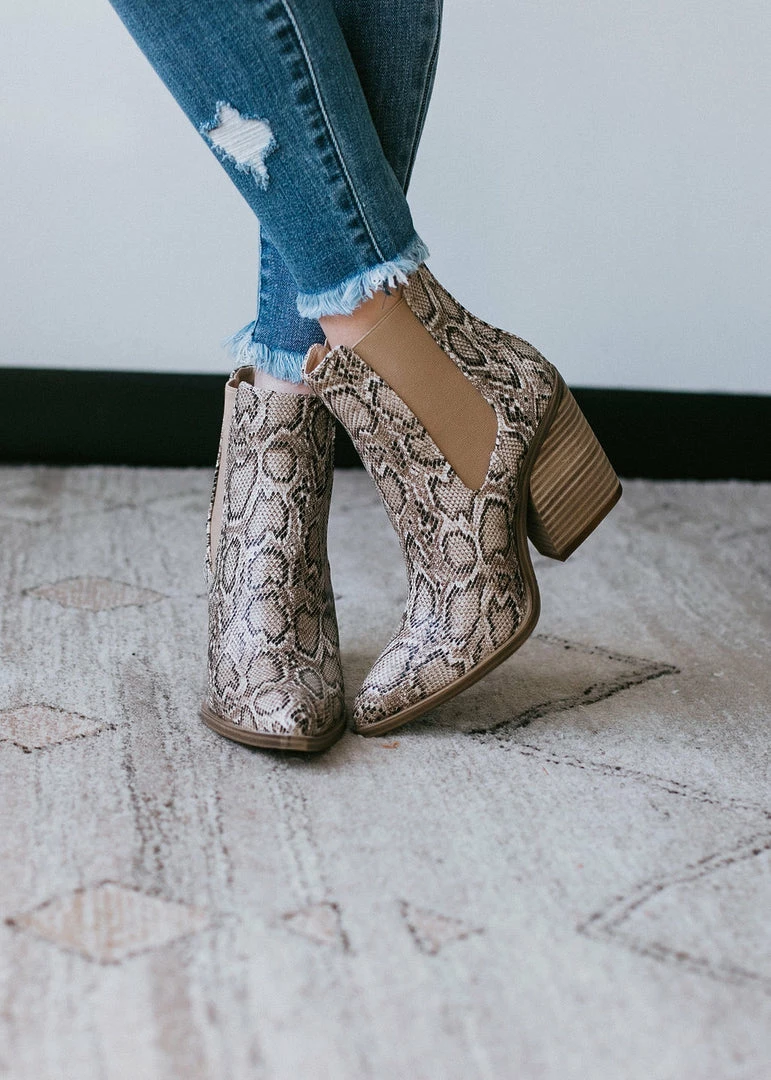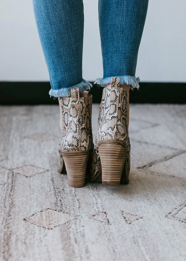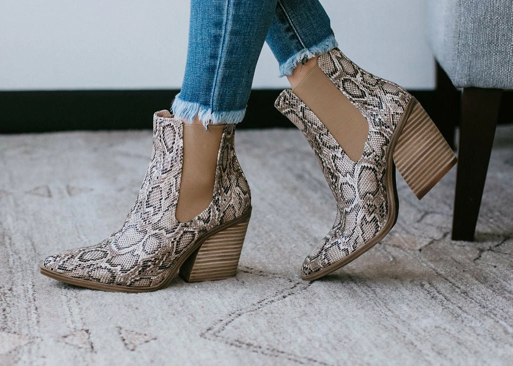 We love a little western flair! Crafted in an embossed faux snakeskin with a pointed toe, pull tab heel, and 3″ block heel. Pair with dresses or skinnies for a city girl chic with a little mix of country. Fits true to size.