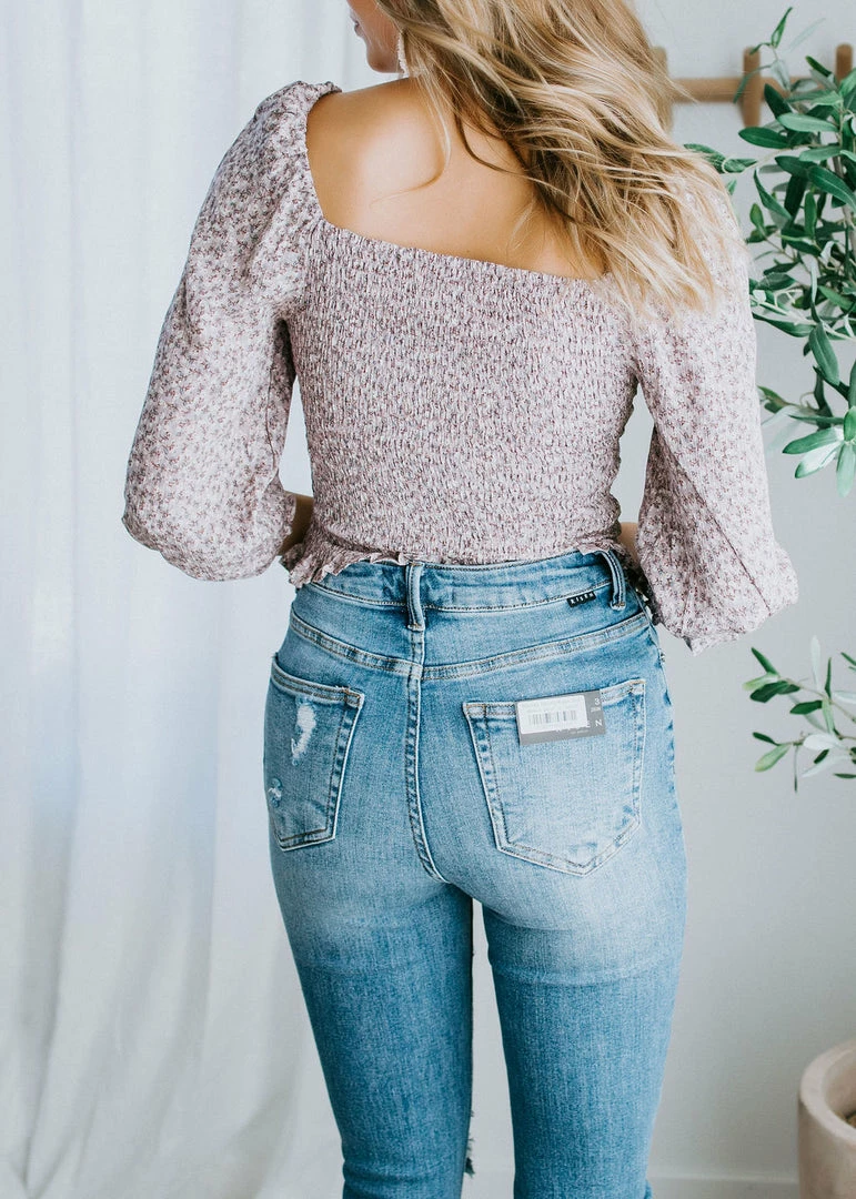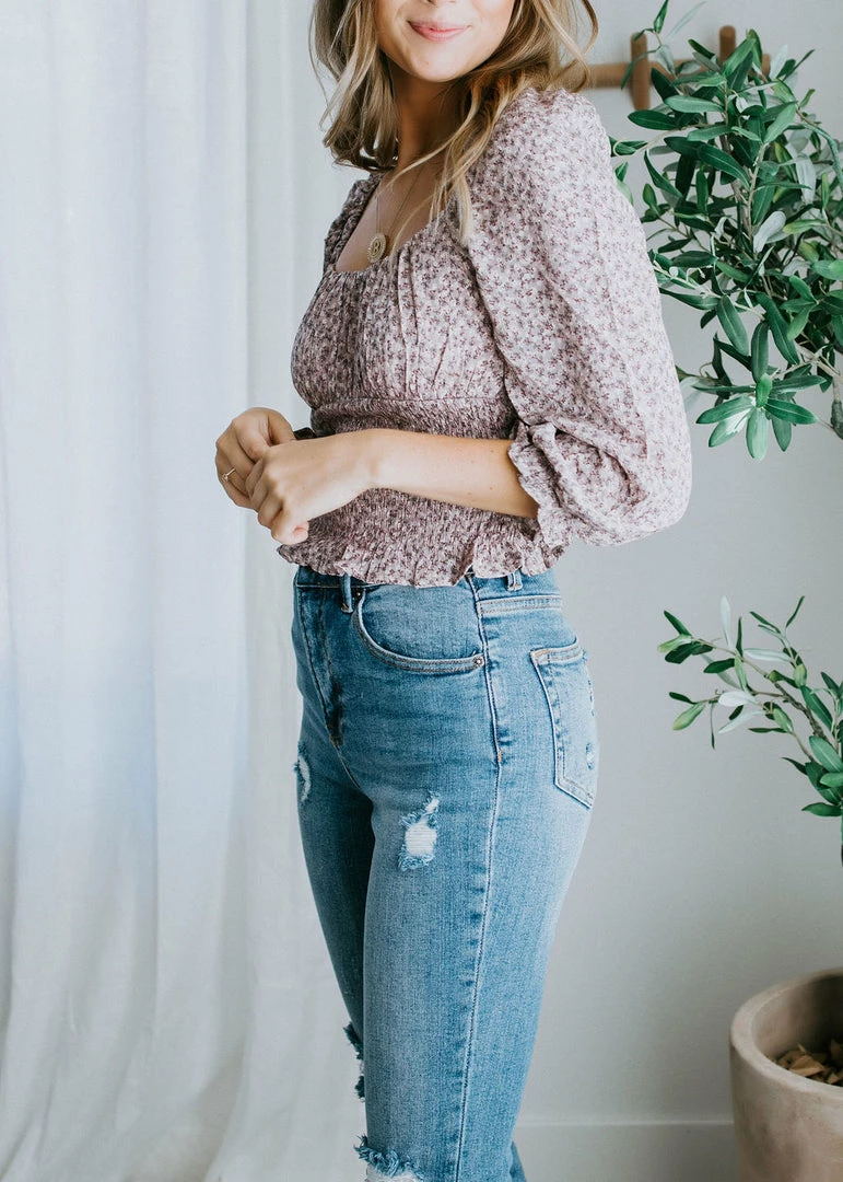 Beautiful puff sleeve top made with dainty floral print fabric. Features ruffles at the ends and a smocked body. Complete with a square neckline and gathers at bust. A flowy blouse that can be dressed up or down. Baylee is wearing a small.