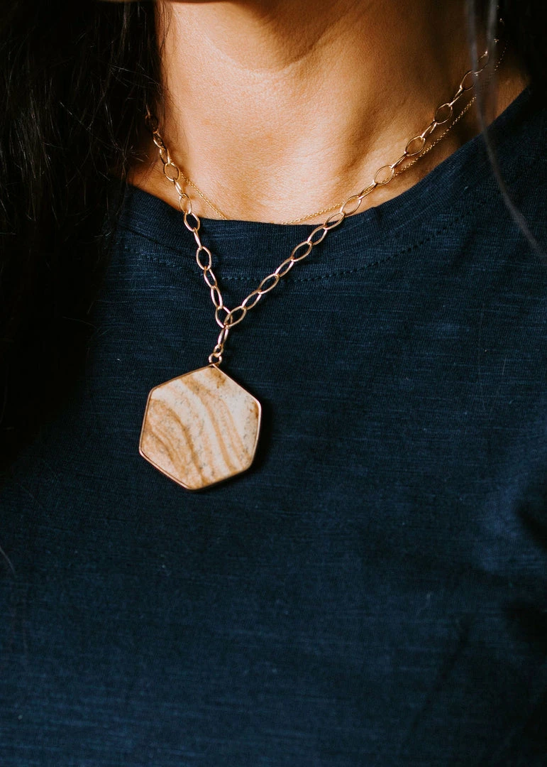 Maya comes in two beautiful color options you can’t resist. This necklace features gold oval chain with a round pendant or a hexagon pendant and will add a statement to your look!