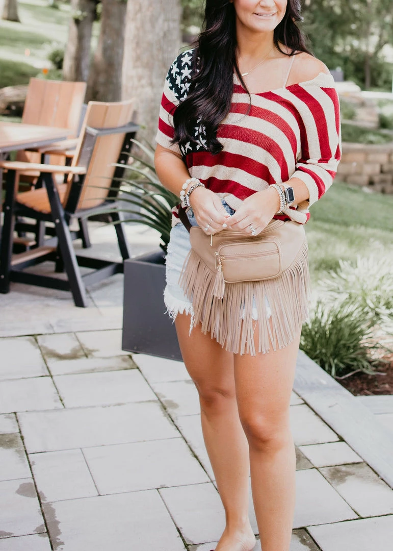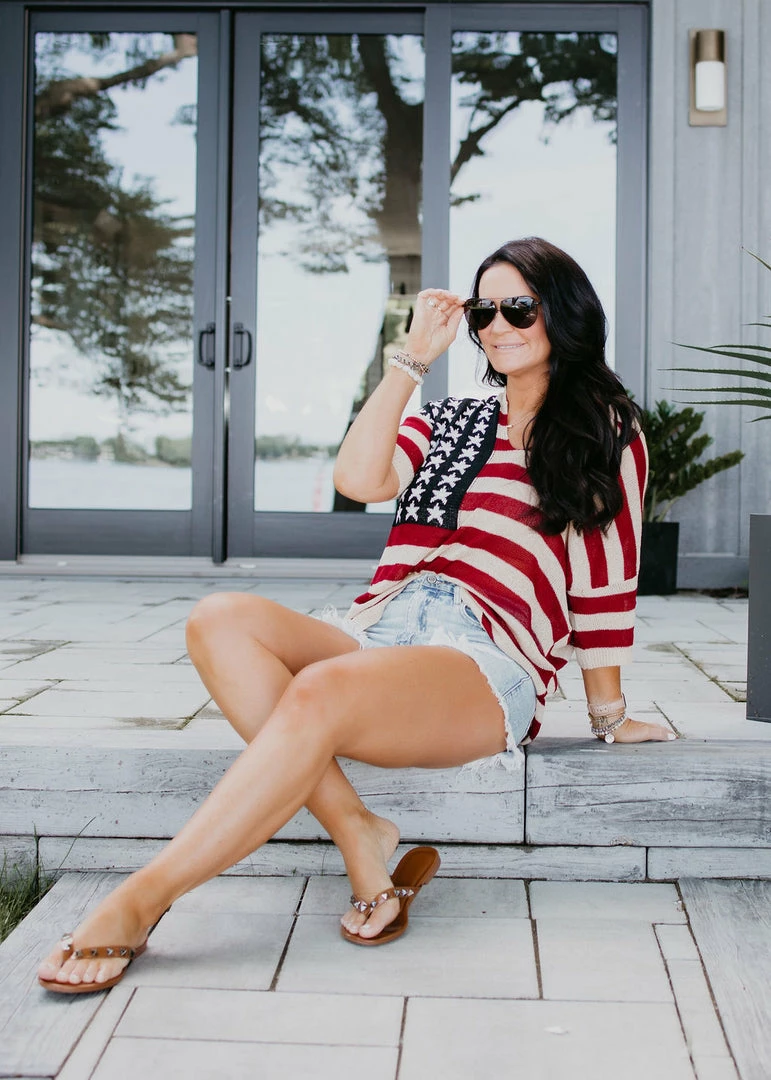Show off your festive side in the Stars and Stripes Top. Featuring a knit fabrication that shapes this oversized, slouchy tee. Complete with a flag graphic and a lightweight feel. Pair over a swimsuit or tucked into denim shorts for a complete 4th of July look. Laurie is wearing a small.