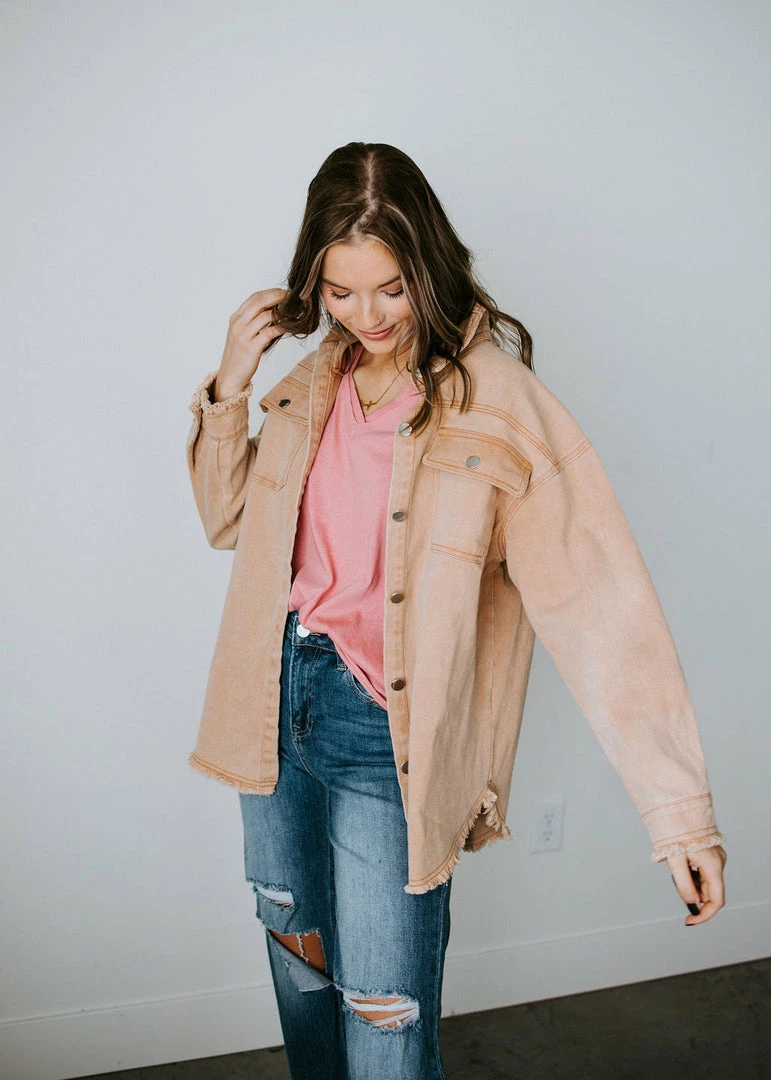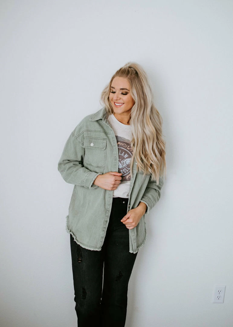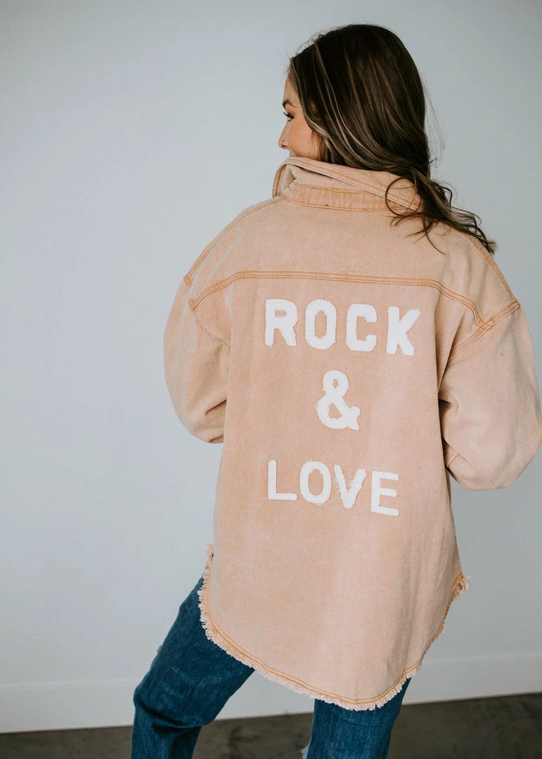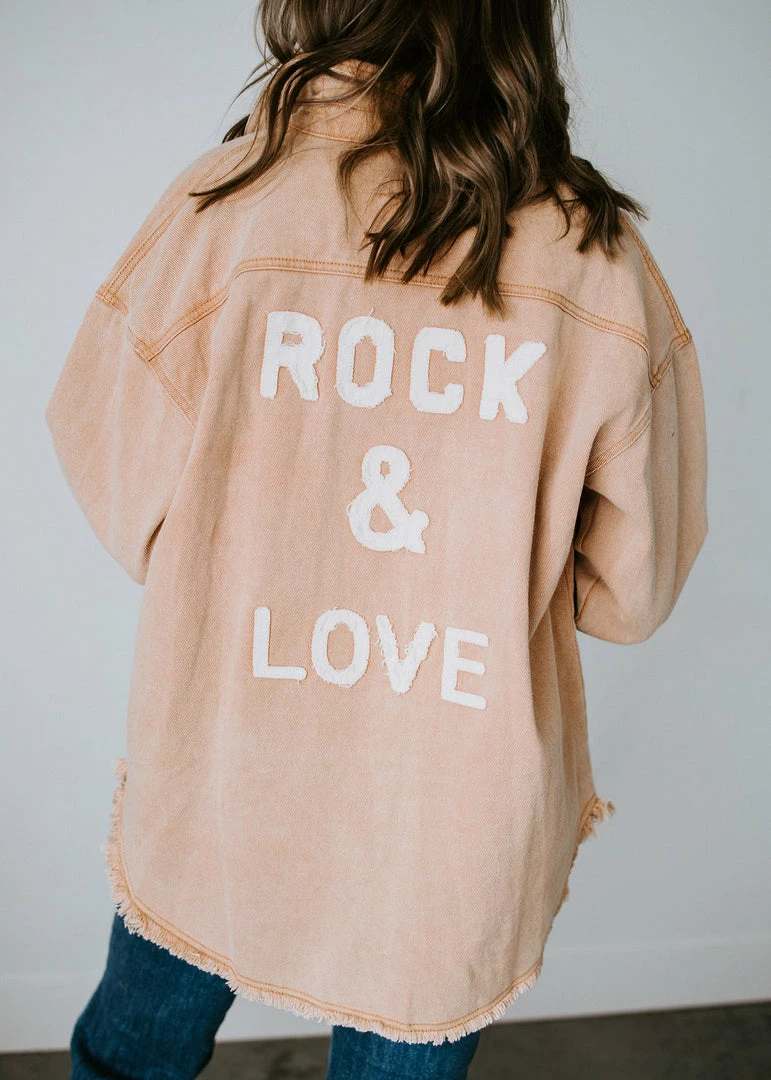 Complete all of your rocker chic looks with this bold denim jacket. Colored denim strikes the right chord as it shapes the slightly oversized silhouette with long sleeves and a collared neckline. Styled with pockets at the chest, frayed edges throughout, and varsity letters on the back that read, “ROCK & LOVE.” Front button closure. Baylee is wearing a small and Kaylor is wearing a medium.