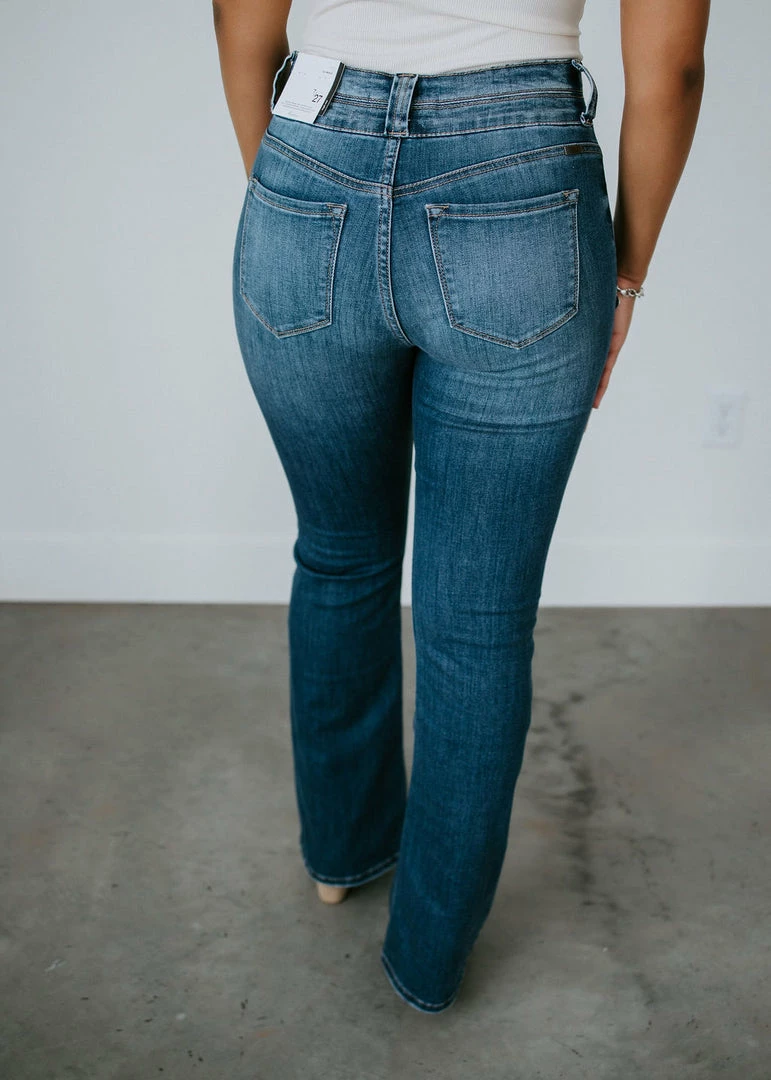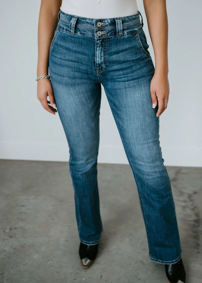 Meet your newest go-to jean! The Karissa KanCan Bootcut Jean comes in a flared bootcut fit with light whiskering and a gently faded wash for a classic look. Sits above the natural waistline as it tapers down through the thigh and flares out below the knee. Made with stretch denim that moves with your body for a flattering all-day fit. Features a five-pocket design, zip fly, and double waistband detail with two-button closure. Cathyliana is wearing a size 7.
