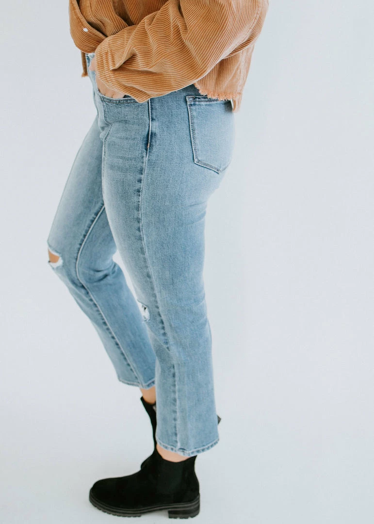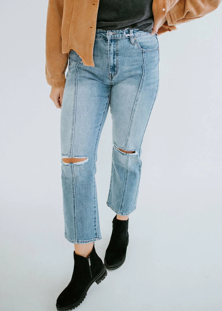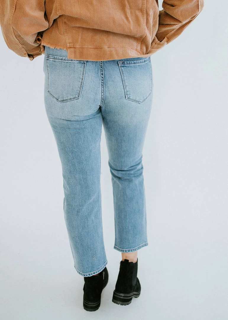 The Larsa KanCan Slim Straight Jean will be your new go-to choice thanks to the modern silhouette and KanCan’s signature Comfort Stretch fabrication. Features a classic 5-pocket design with fading, whiskering, and distressing at the knees. Finished with center seam detailing along the front. Pair with a cardigan and booties for a flawless look. Kaylor is wearing the size 11.