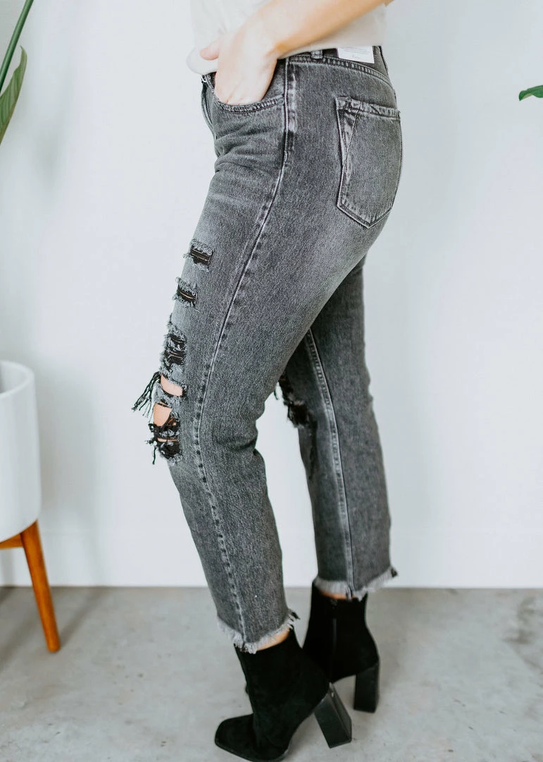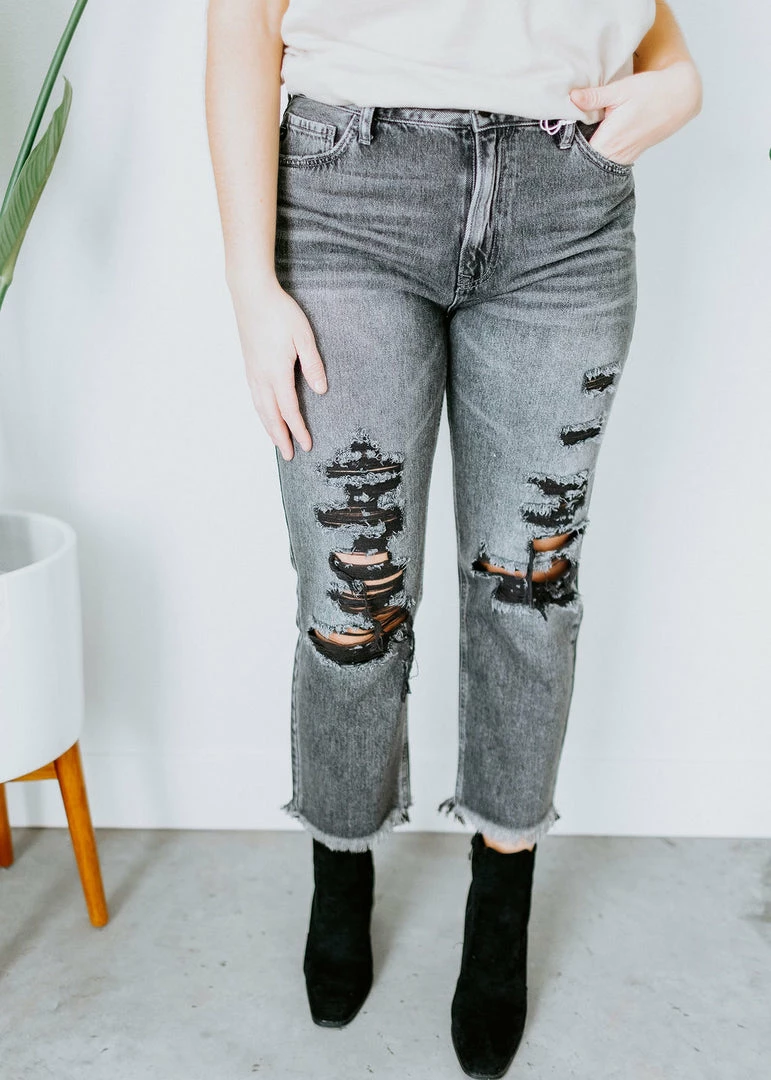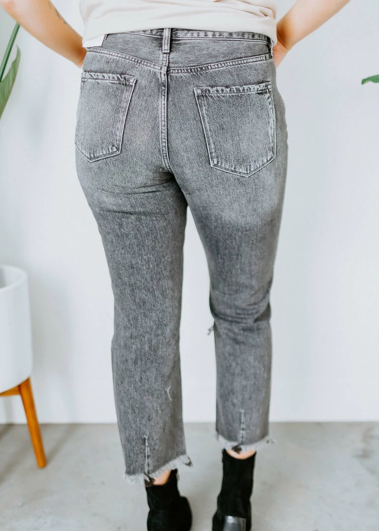 The slim straight fit keeps your everyday looks trendy with the uniquely designed distressing and frayed hems with darts at the back. Classic five-pocket styling features an ankle-length hem, zip fly, and a single button front closure. You can’t go wrong with these beautiful dark grey jeans! No stretch. Kaylor is wearing a size 11.