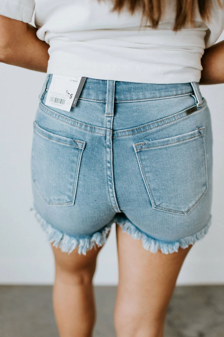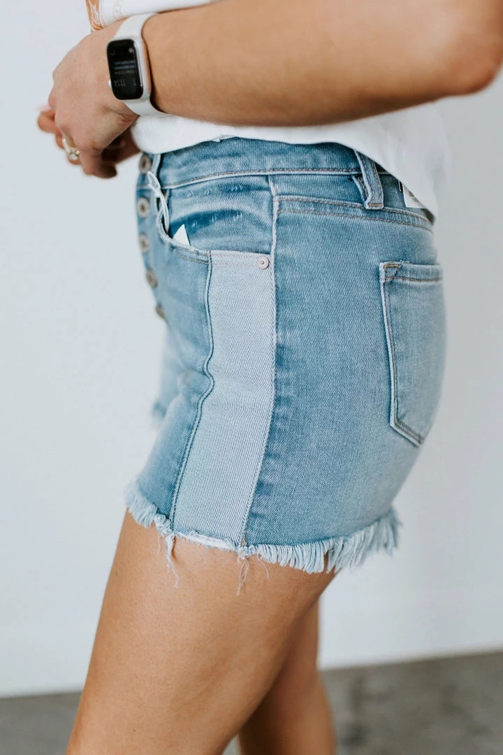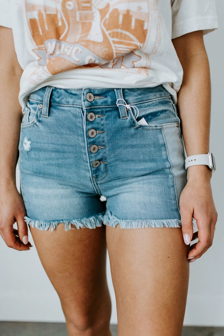 Show off your stems with the Tina KanCan Frayed Hem Shorts! The five-pocket design delivers a stylish, lived-in look thanks to the contrast denim panels, moderate distressing, and frayed hems. Sits above the natural waistline for a flattering fit that will keep your looks on-trend. Features a 4-button front closure. Kara is wearing a size 5.