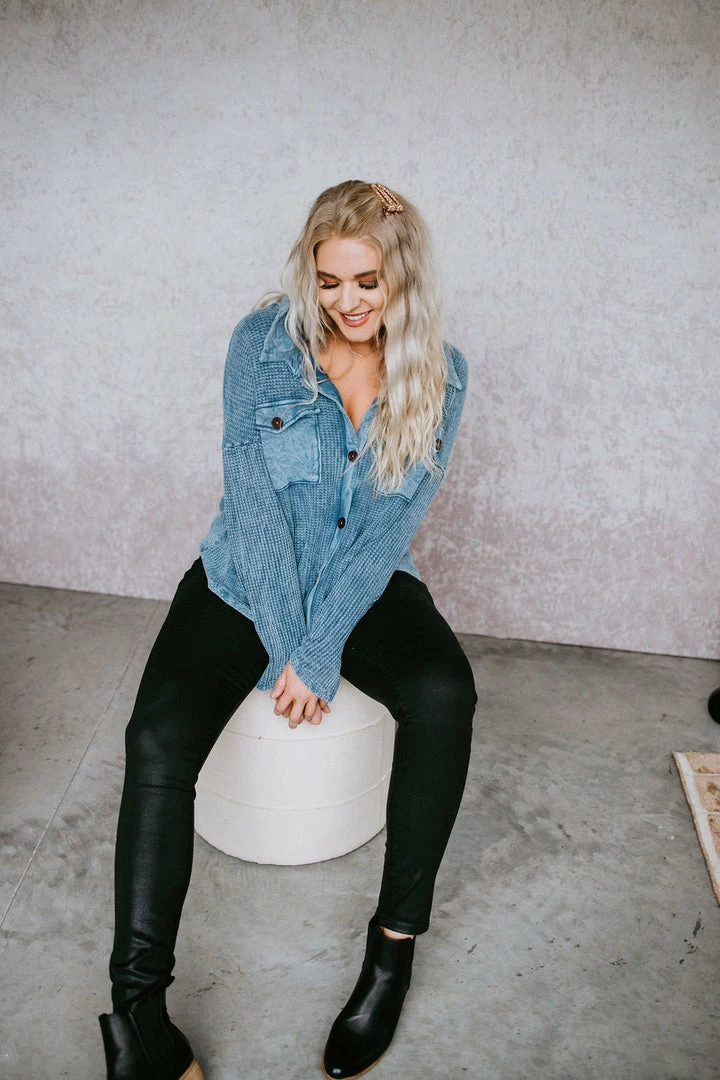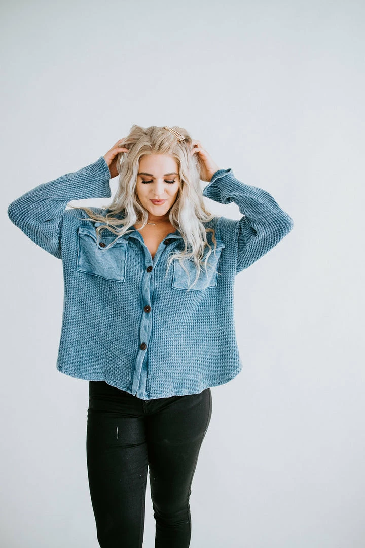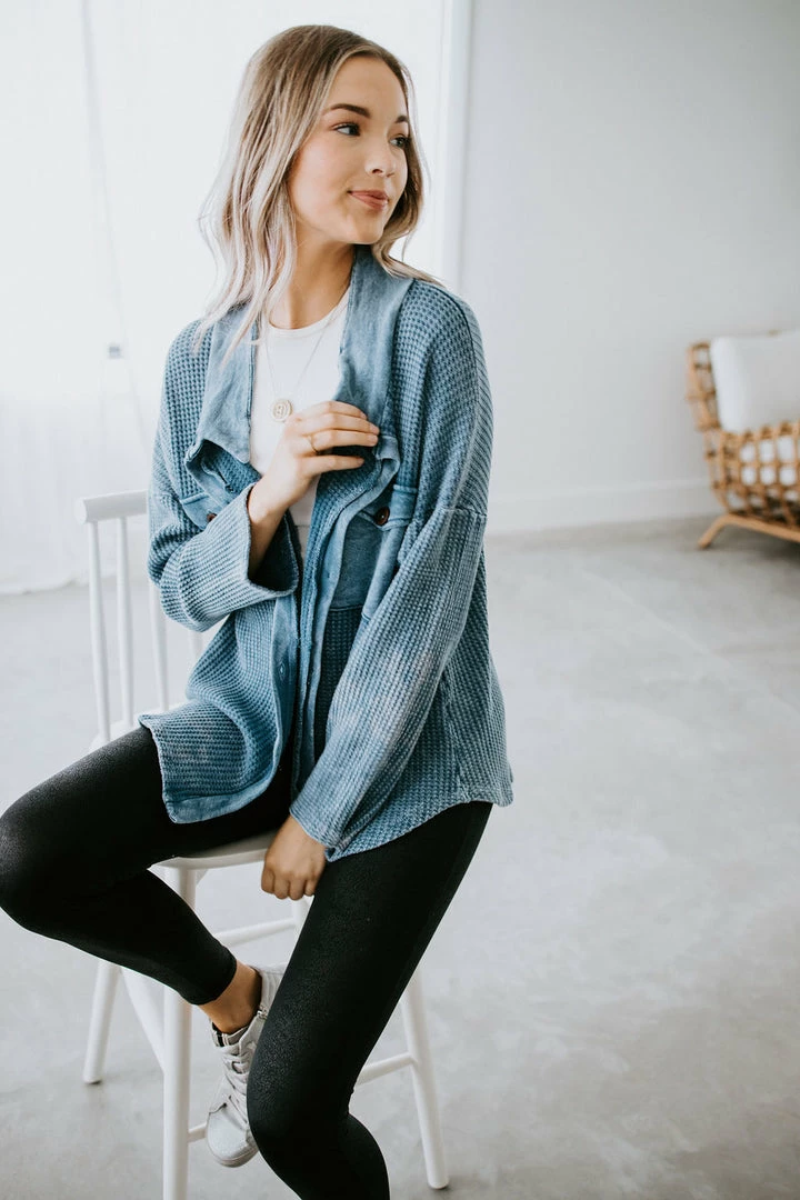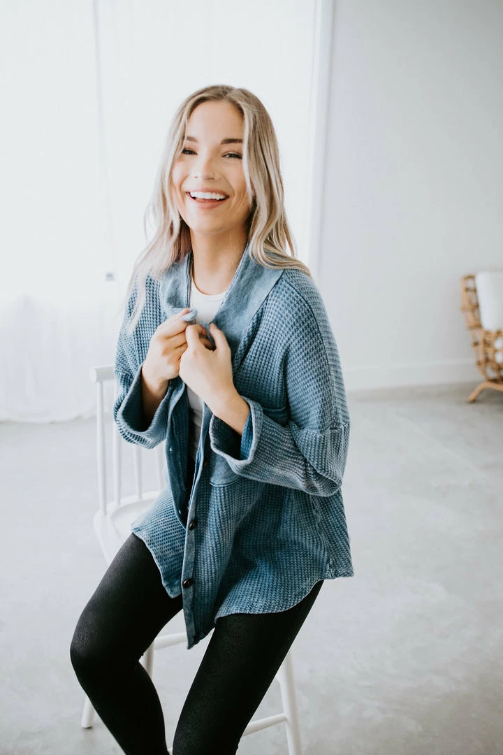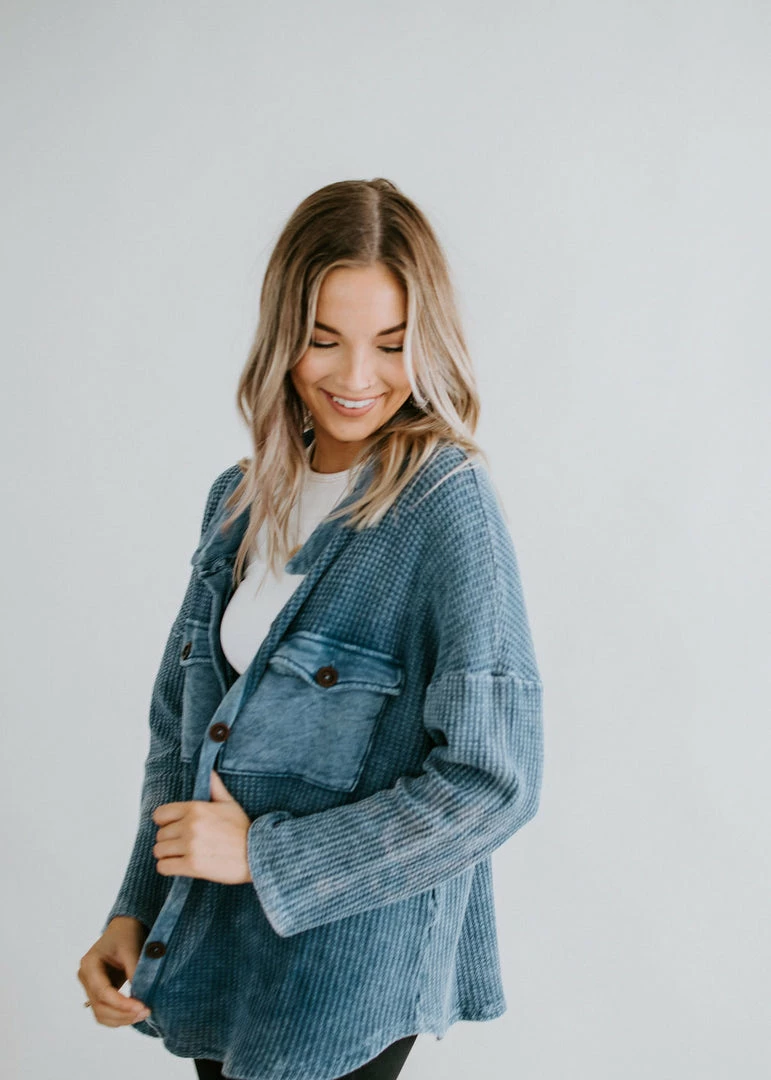 We are obsessed with this vintage-washed jacket-shirt hybrid! Features a waffle knit shacket with button-down front closures and chest pockets. Pair over a plain white tank with denim bottoms for an easy outfit! Leslie, Baylee and Laurie are wearing smalls. Kaylor is wearing a medium.