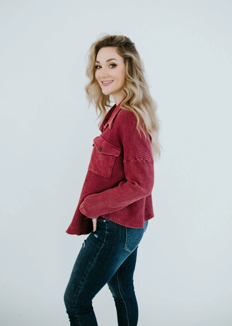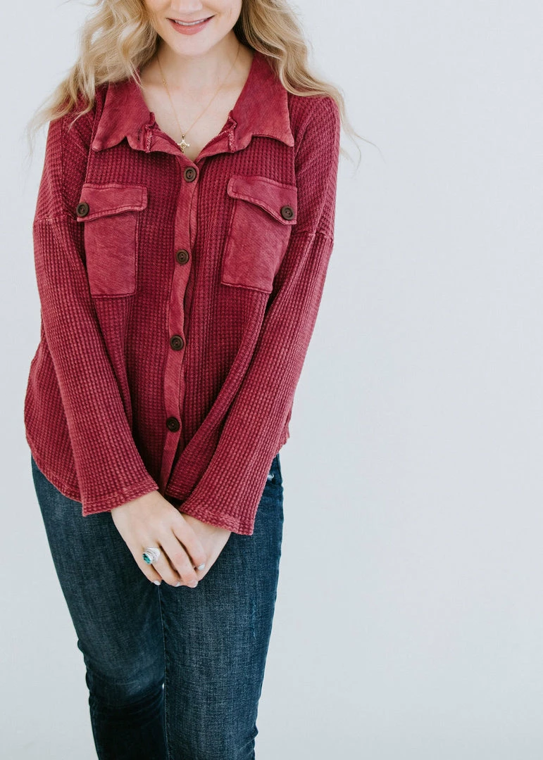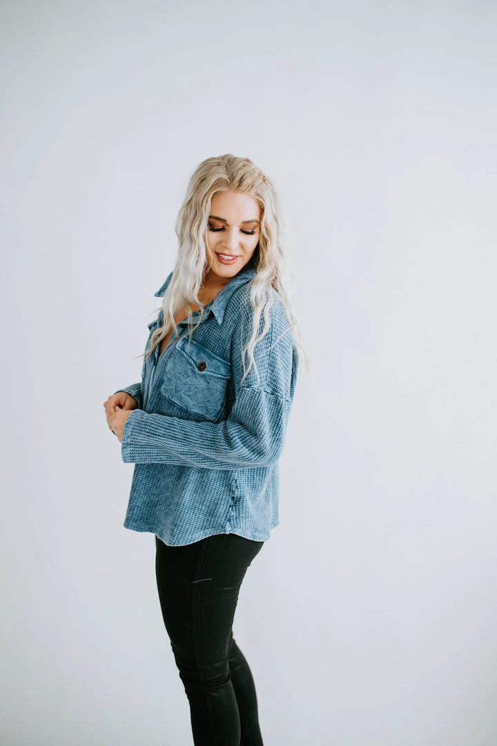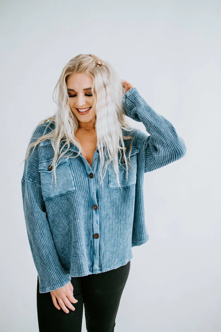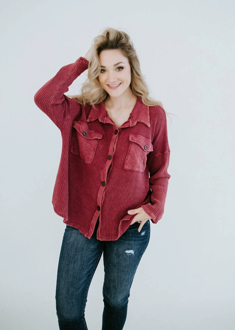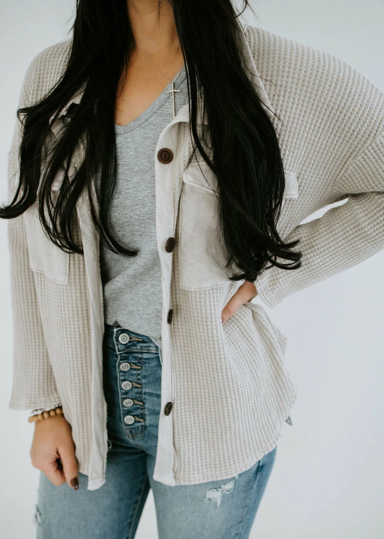 We are obsessed with this vintage-washed jacket-shirt hybrid! Features a waffle knit shacket with button-down front closures and chest pockets. Pair over a plain white tank with denim bottoms for an easy outfit! Leslie, Baylee and Laurie are wearing smalls. Kaylor is wearing a medium.