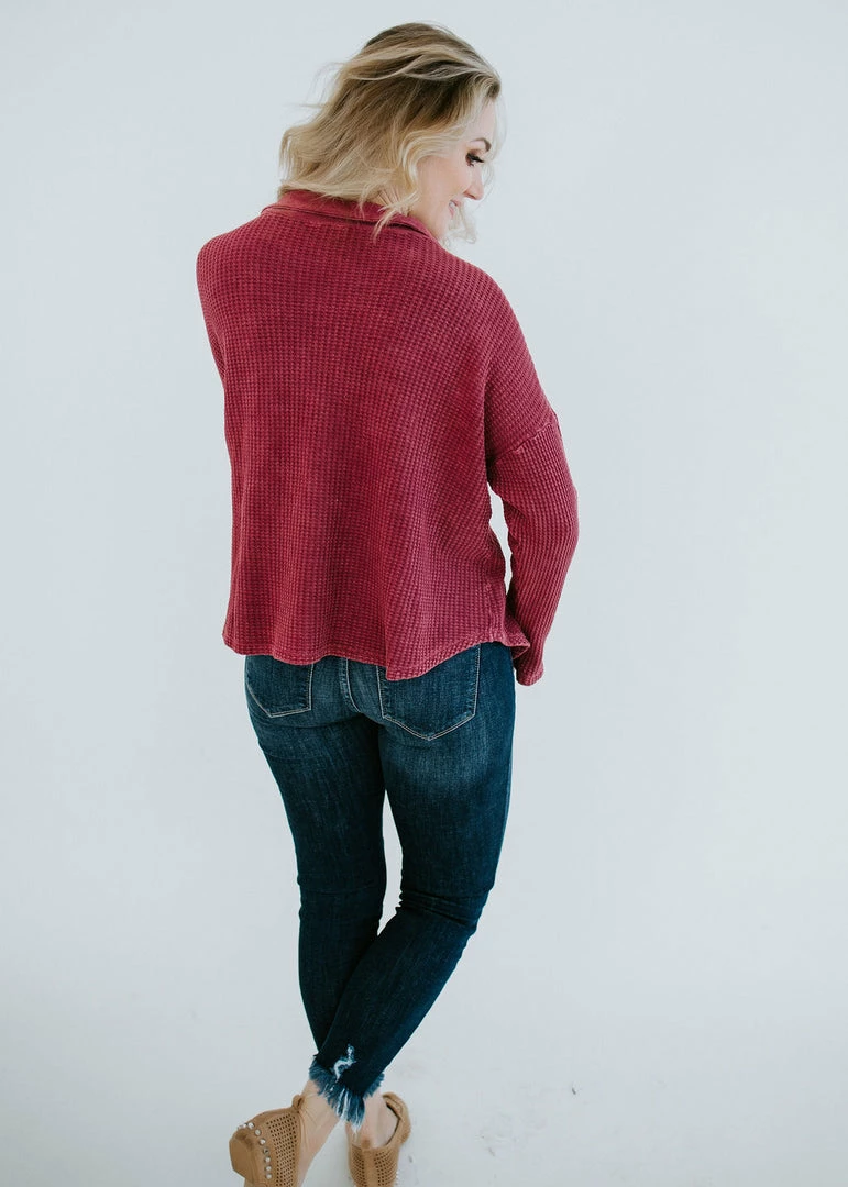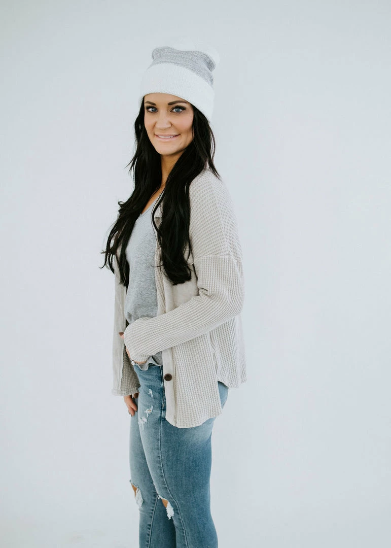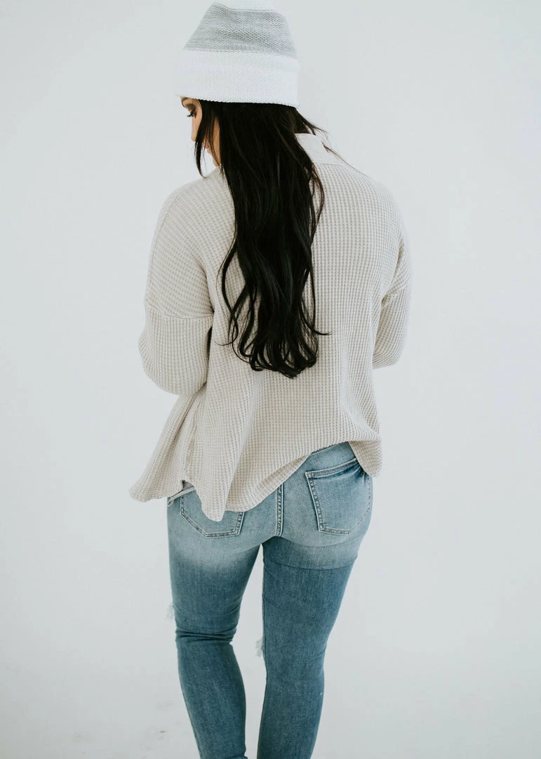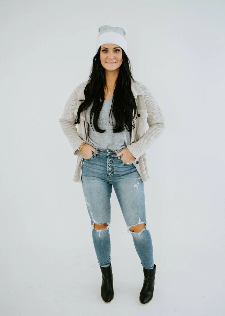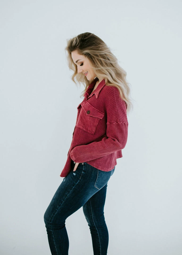 We are obsessed with this vintage-washed jacket-shirt hybrid! Features a waffle knit shacket with button-down front closures and chest pockets. Pair over a plain white tank with denim bottoms for an easy outfit! Leslie, Baylee and Laurie are wearing smalls. Kaylor is wearing a medium.