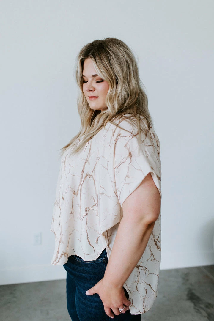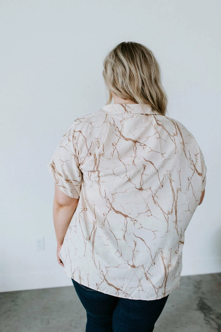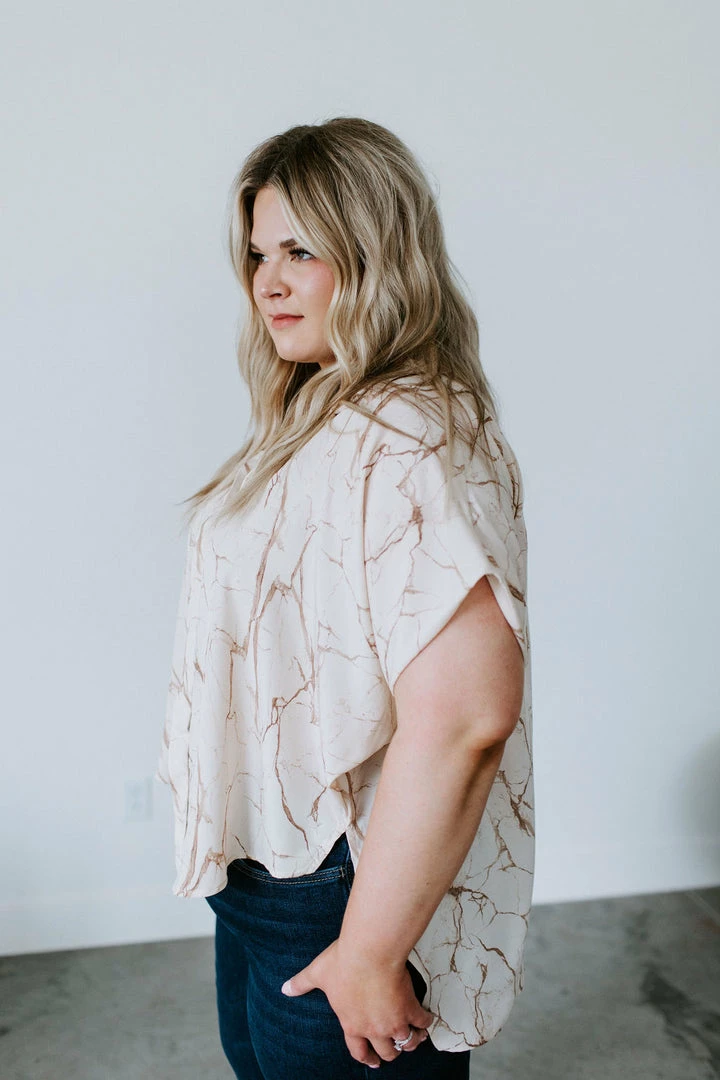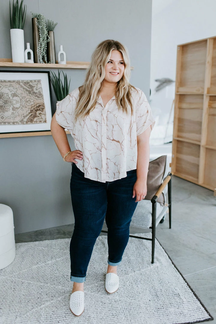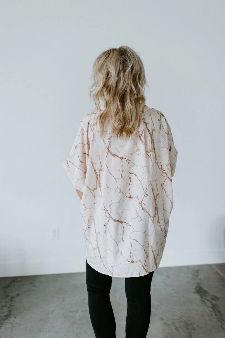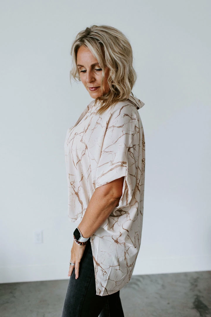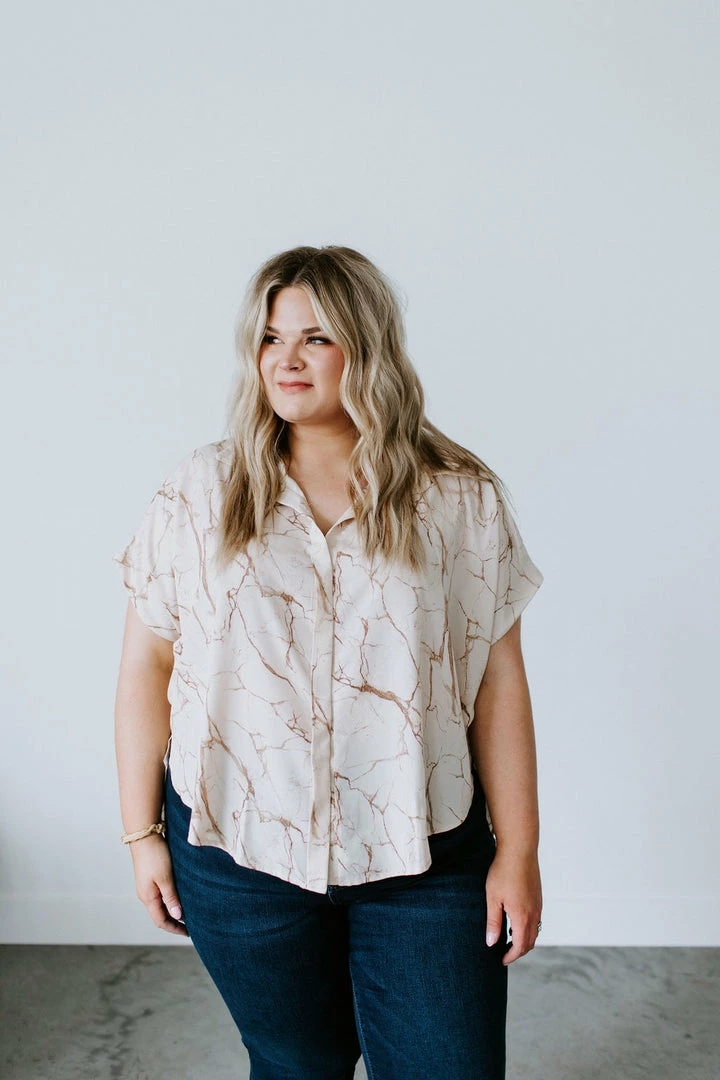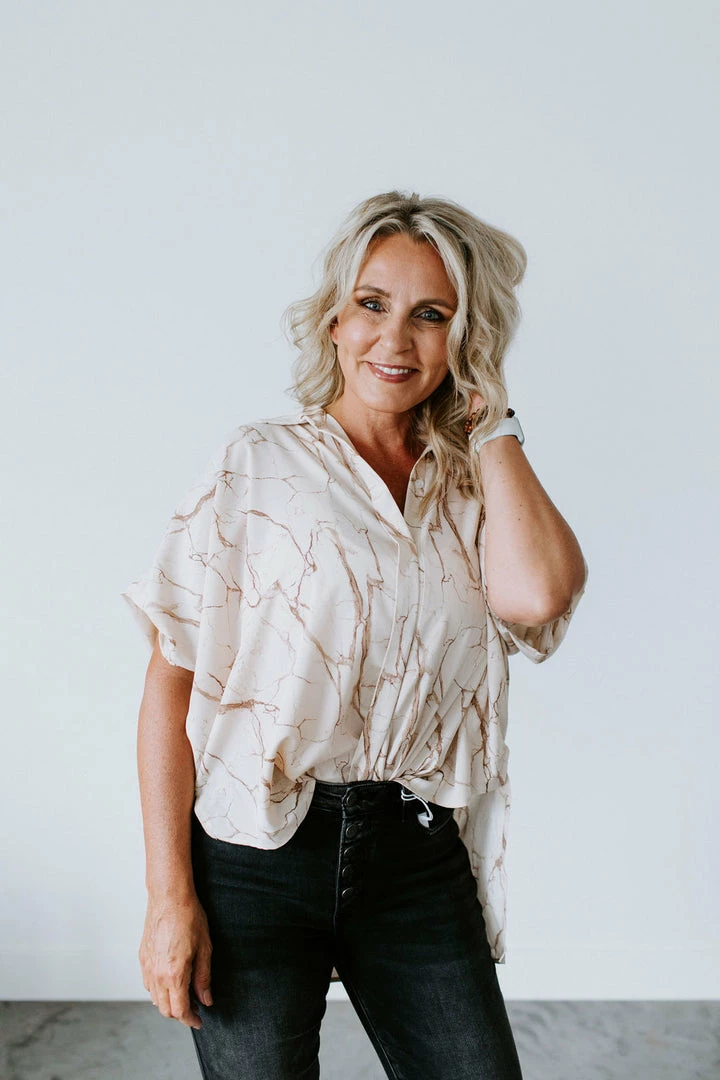 You’ll look marble-ous in this versatile button-up top! Airy woven fabric creates a flowy silhouette that features an all-over marble print in neutral hues that will look great dressed up or down. Short dolman sleeves frame a relaxed-fit bodice that has a collared neckline, hidden button placket, and a rounded high-low hem. Jen is wearing a medium. Hannah is wearing a large.