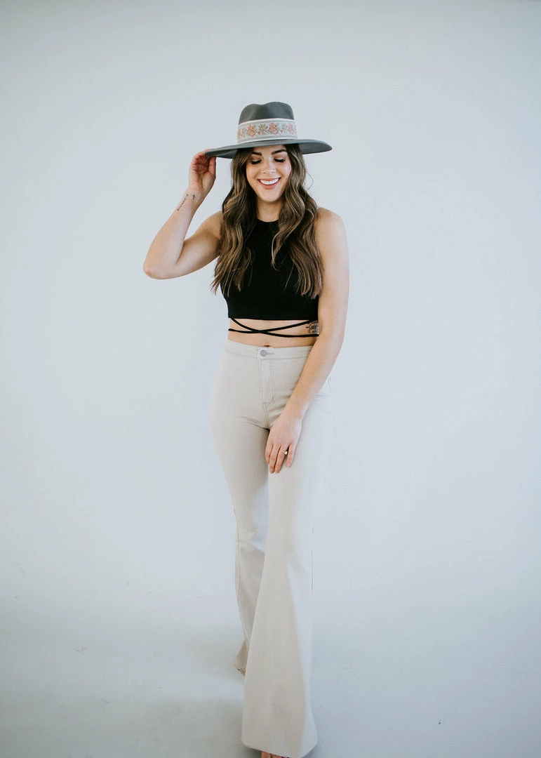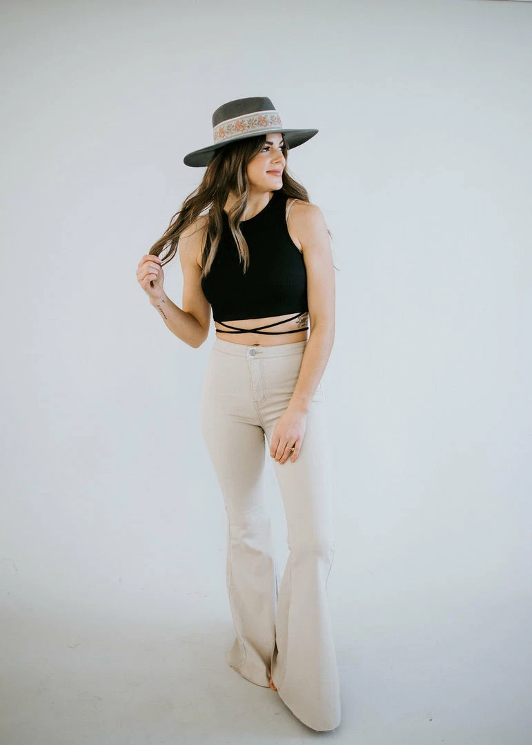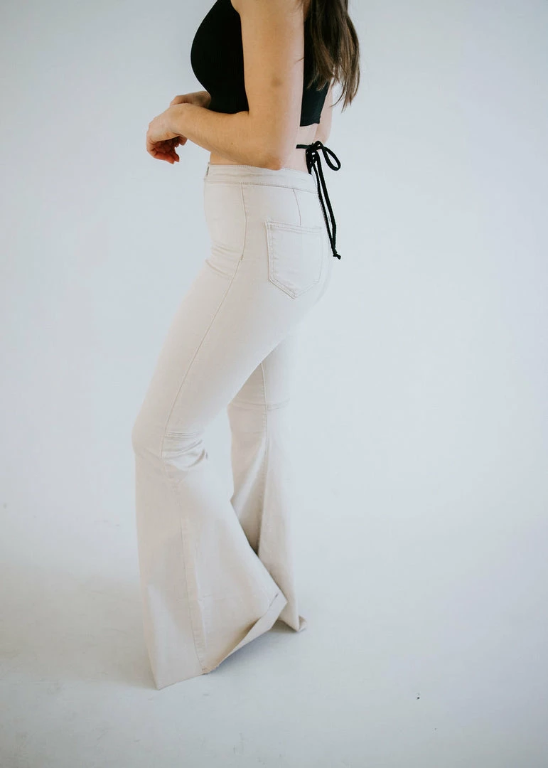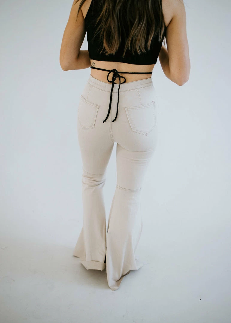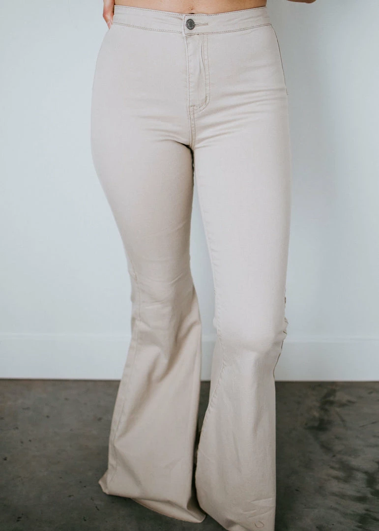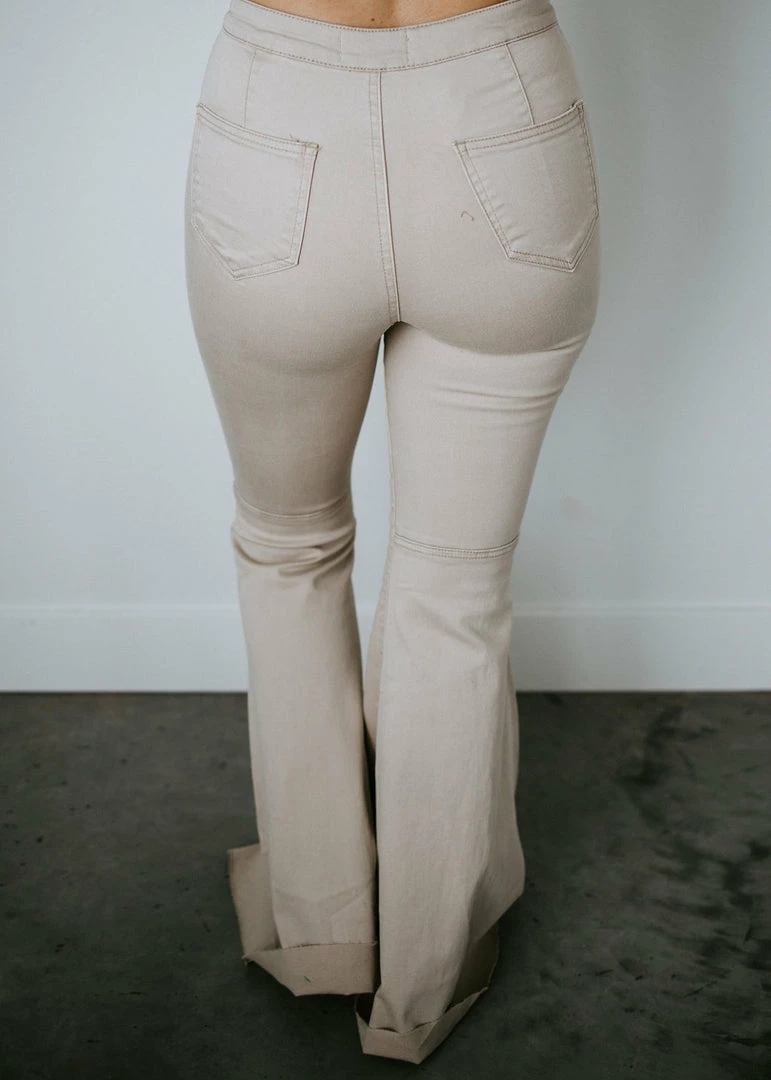 Full-length taupe jeans feature a pronounced flared silhouette with raw-edged hems. Made from cotton with a touch of spandex and tailored in a regular fit for comfortable all-day wear. These sculpting mid-to-high rise jeans have belt loops and button closure with zip fly for that original fit. Kara is wearing a size small.