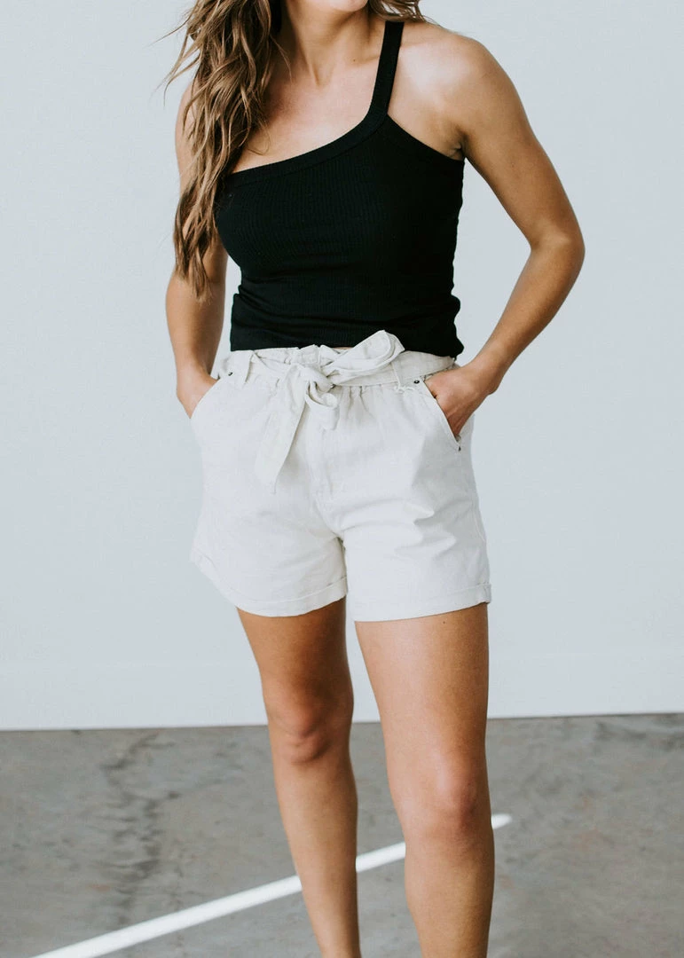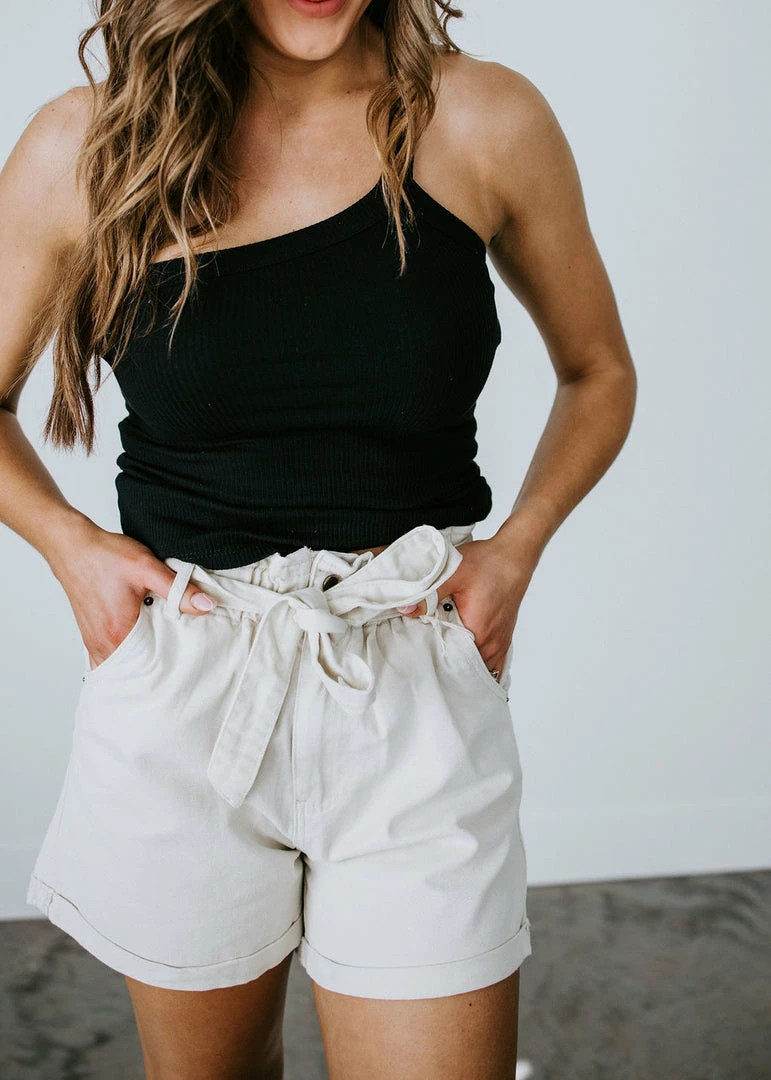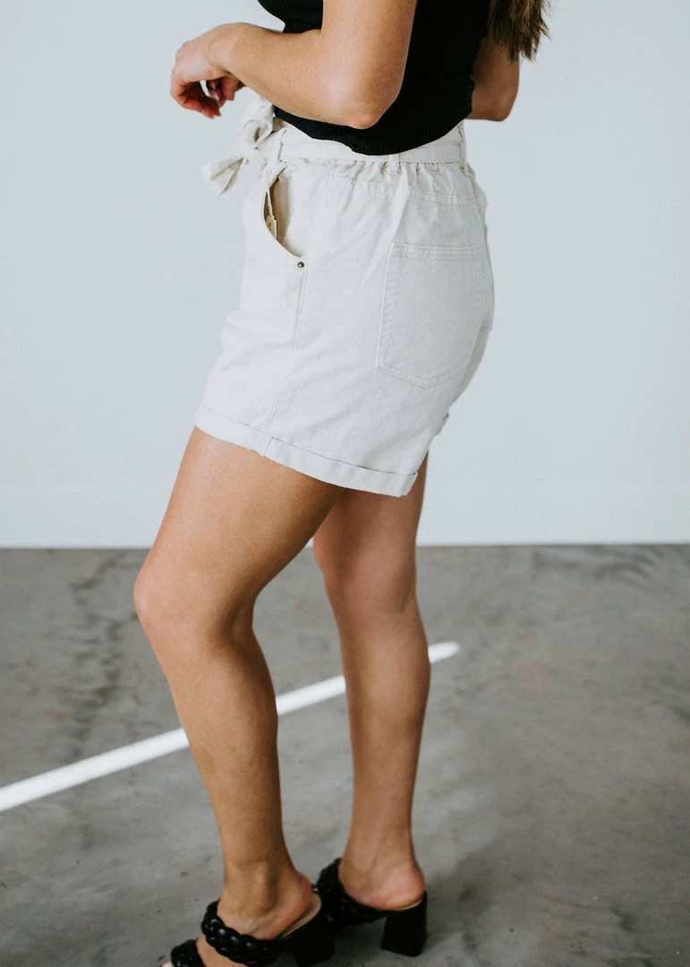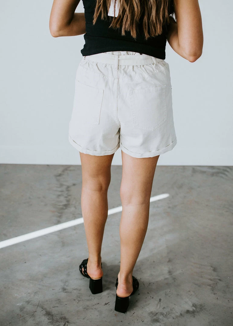 Keep your looks easy and breezy with our Lorna Paperbag Shorts. This cute design features an elastic paperbag waist, tying sash belt, and a high-rise fit. Sturdy cotton shapes the four-pocket silhouette with relaxed legs and rolled hems. Finished with two-button front closure and hidden zipper fly. Kara is wearing a size small.