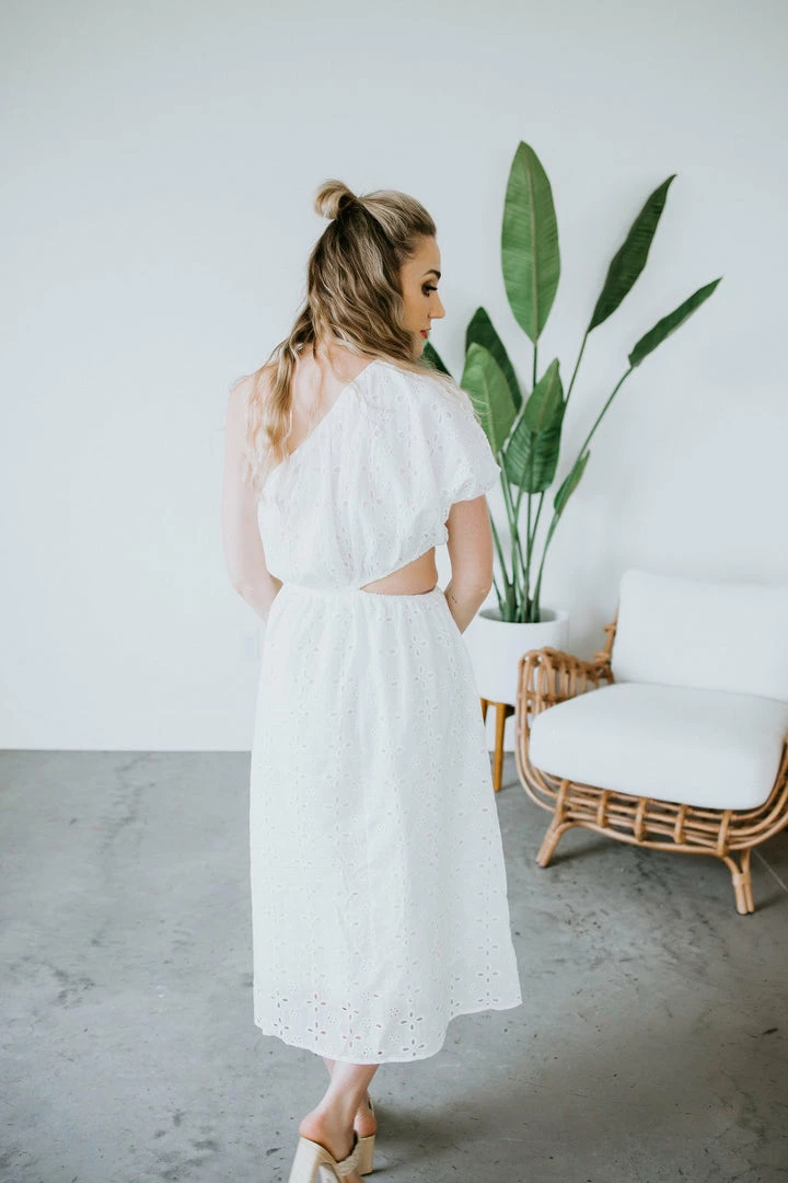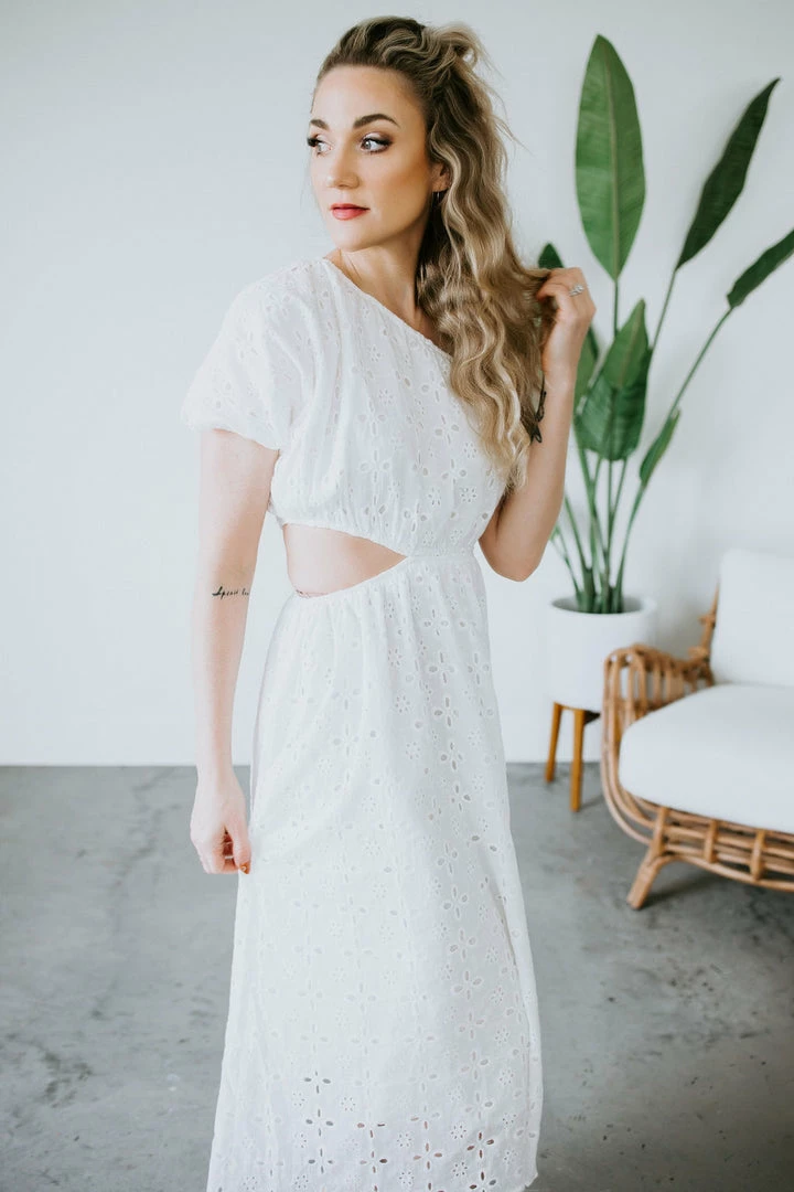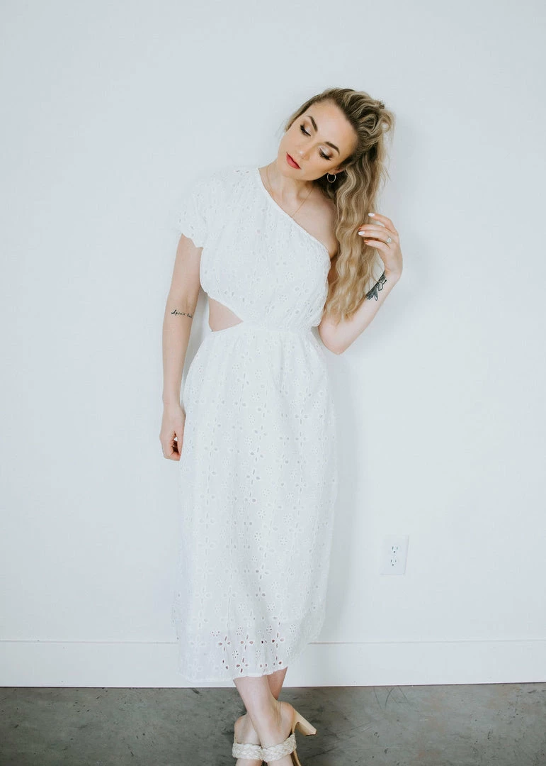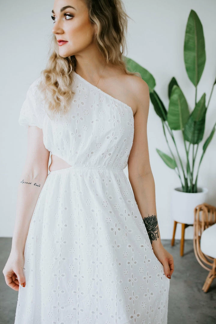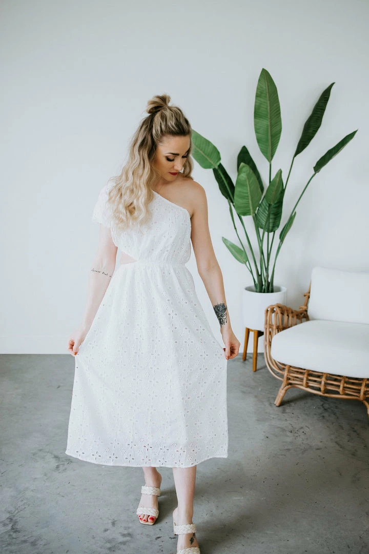 We can’t get enough of all the summer dresses! This beauty features a one shoulder silhouette, elasticized sleeve, and a side cutout for a unique twist. Complete with an embroidered overlay in a midi length. Makes for the perfect bridal dress. Leslie is wearing a small.