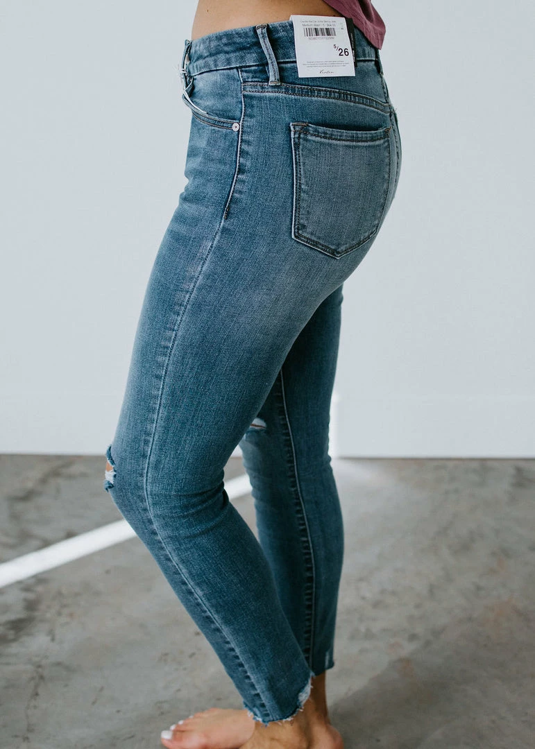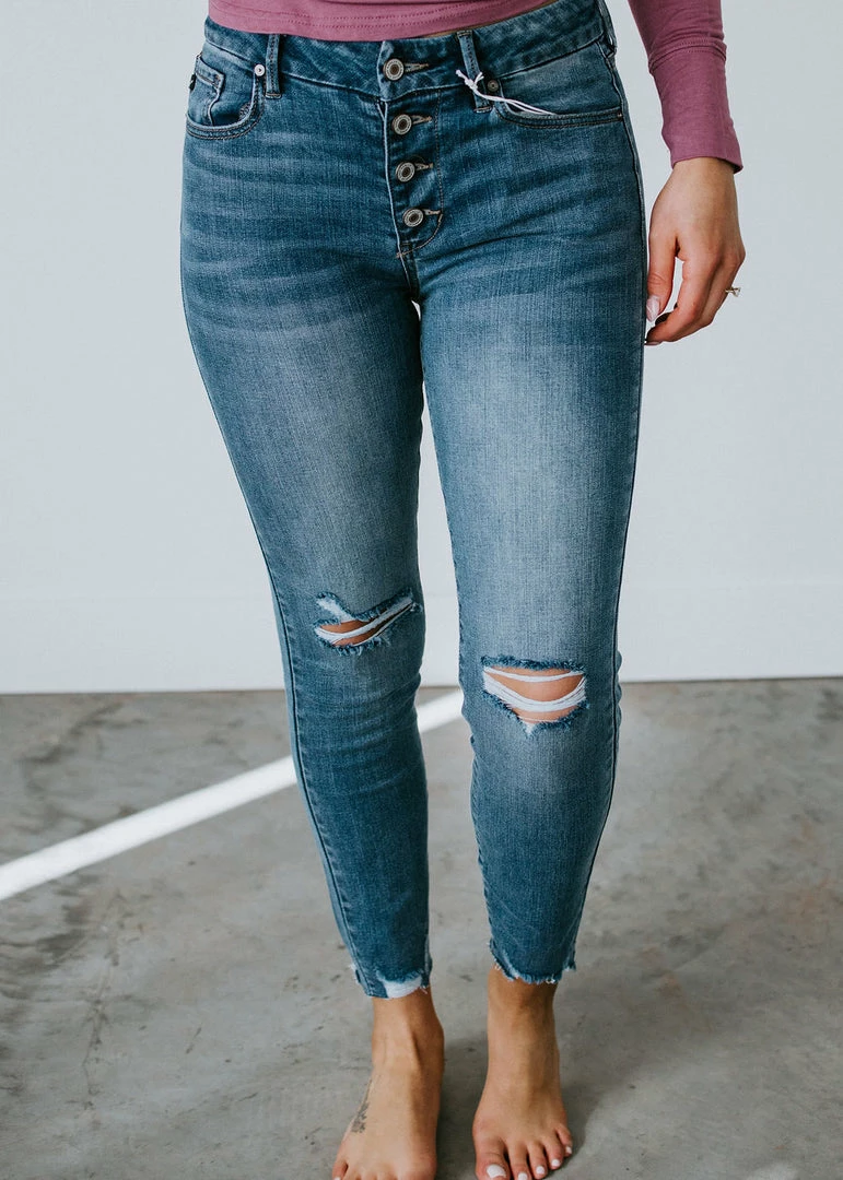 The styling options are endless when you plan your outfits around a classic like the Camille KanCan Ankle Skinny Jean. Soft, stretch denim falls from a mid-rise waist to skinny cut legs that have whiskering, distressing, and destroyed ankle-length hems. Features a five-pocket design and four-button front closure. Kara is wearing a size 5.
