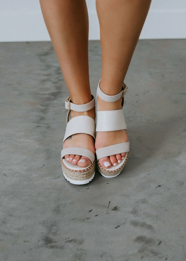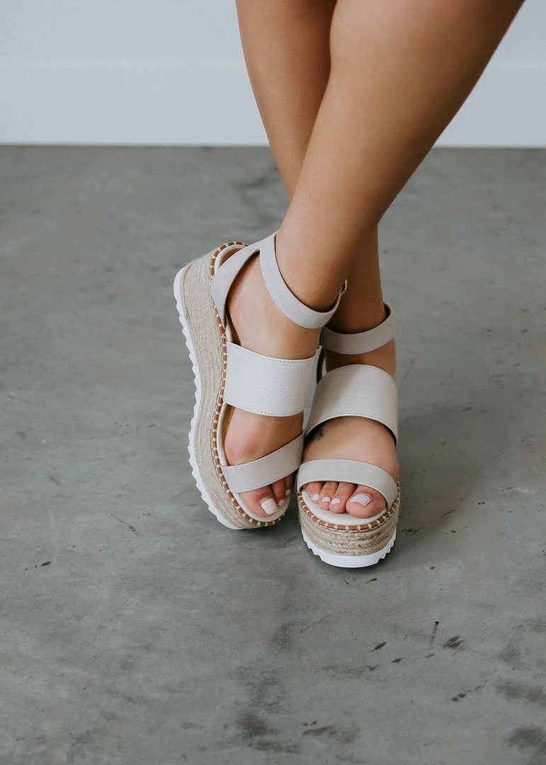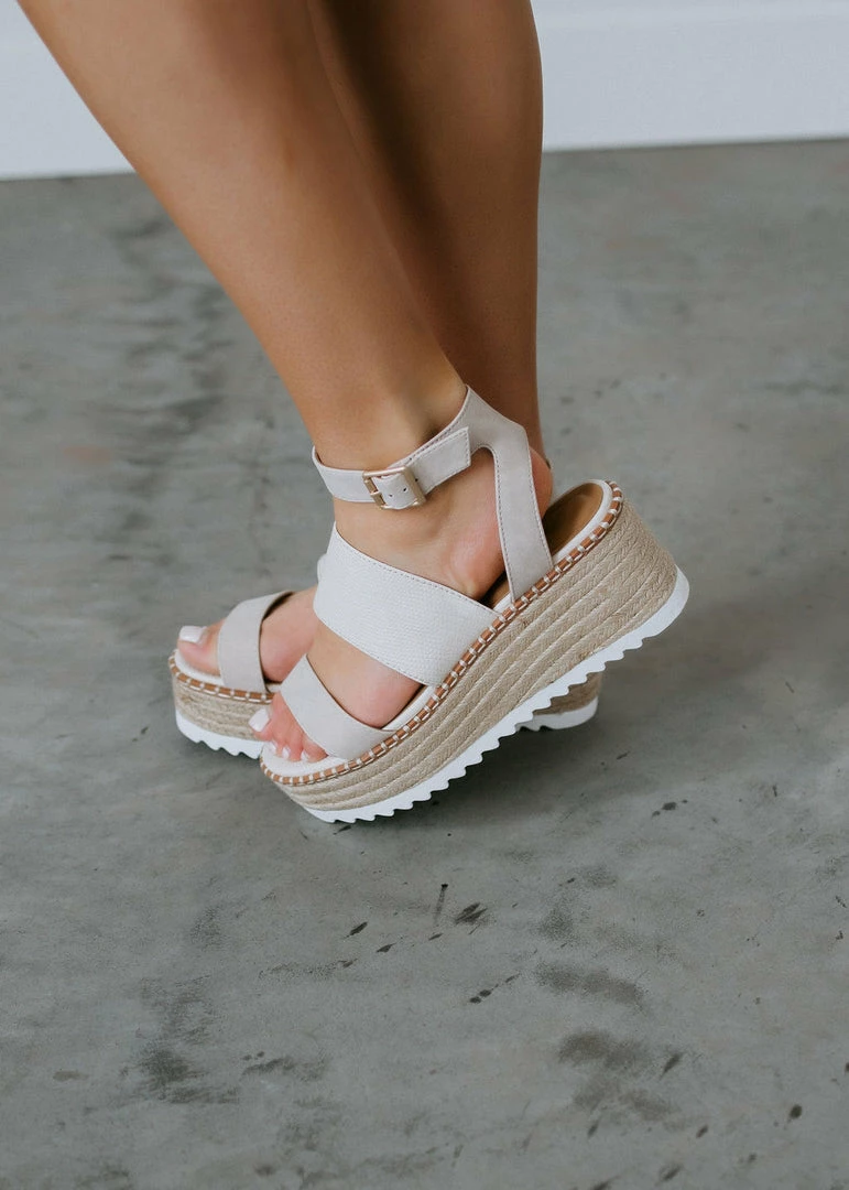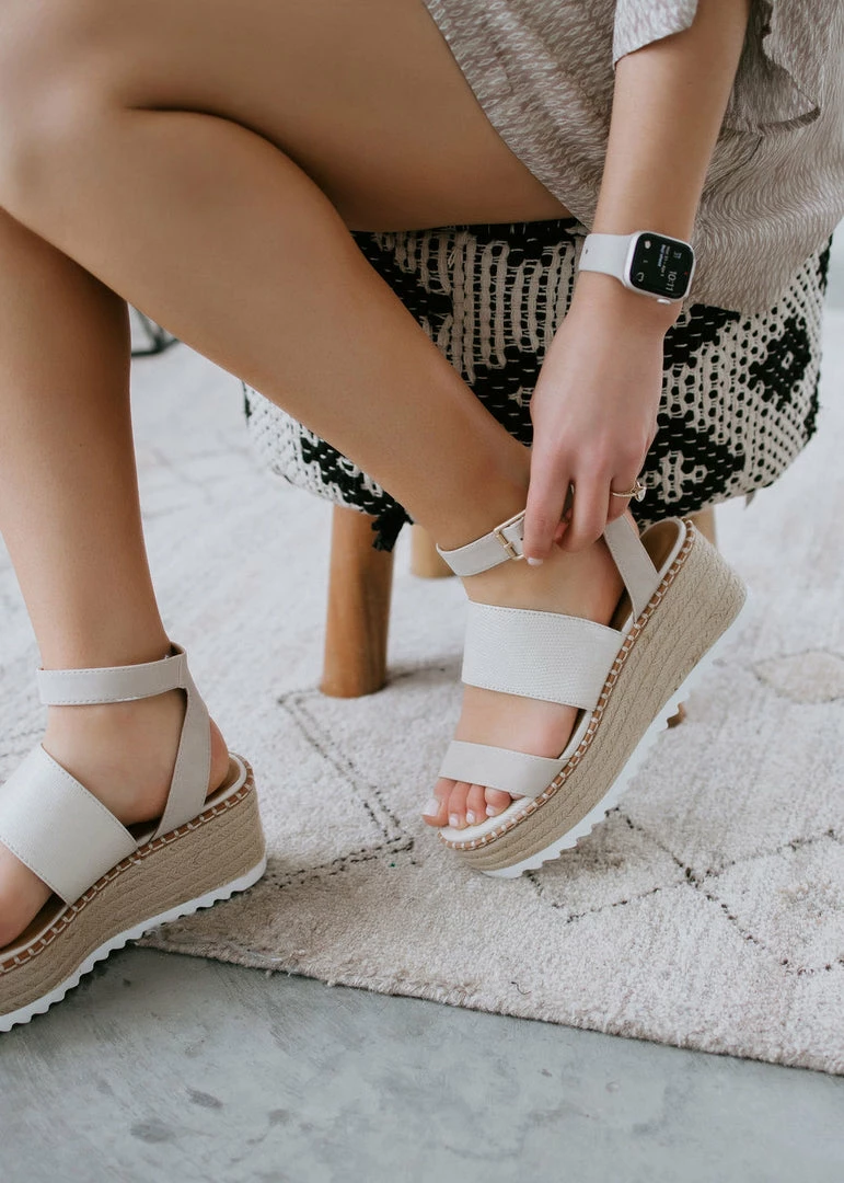Give your warm-weather looks a lift with these stunning sandals! Features a jute-wrapped platform wedge and ankle straps with buckle closures. Finished with a textured sole for a modern look.