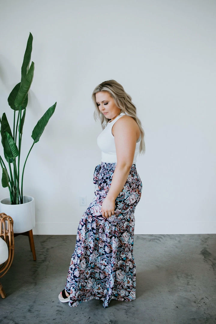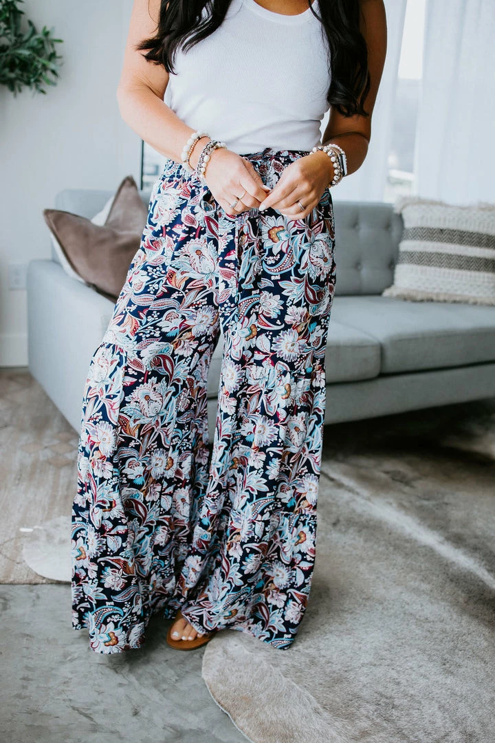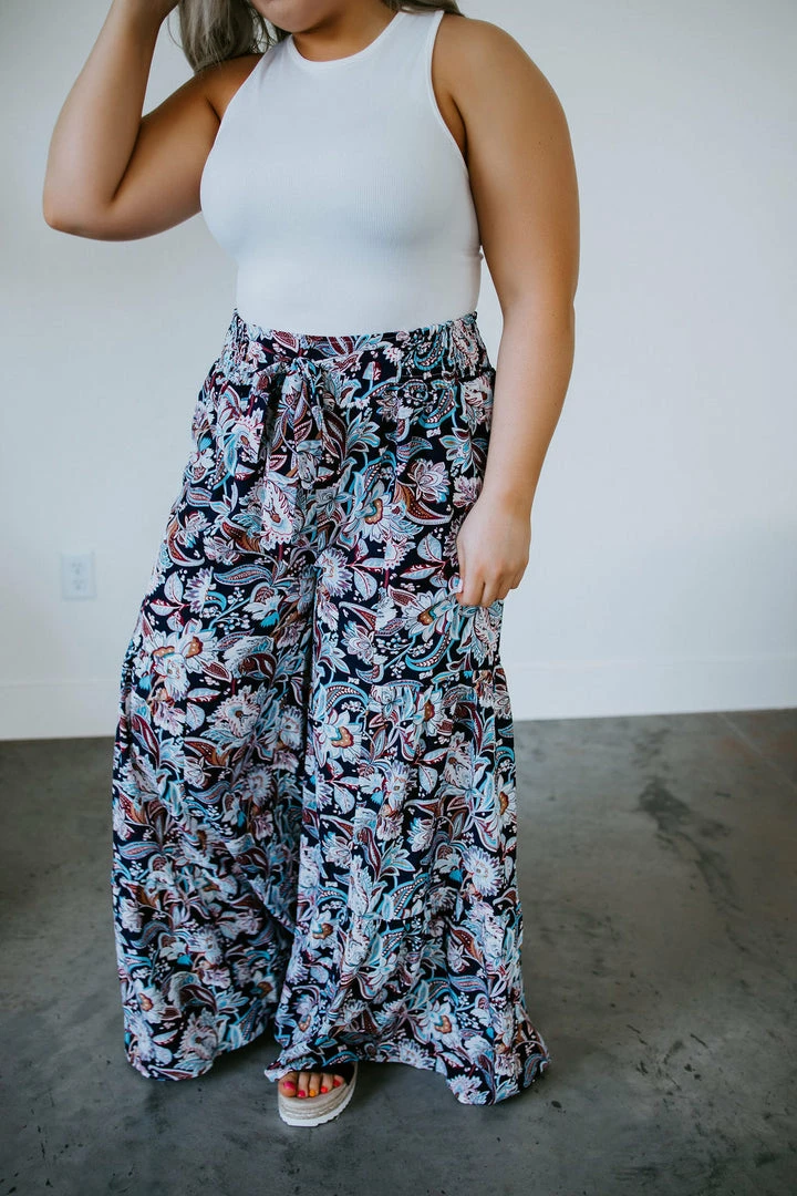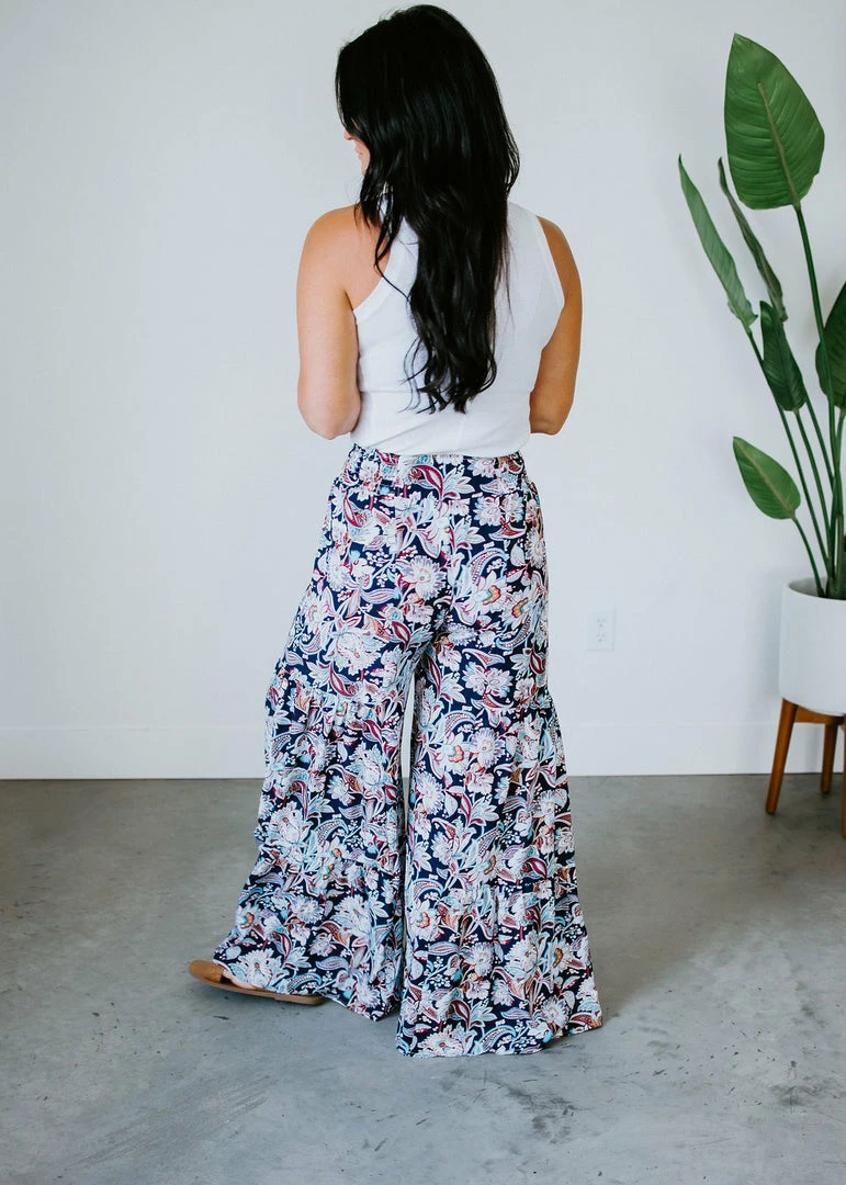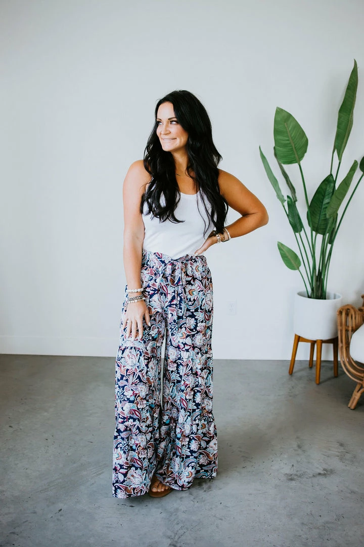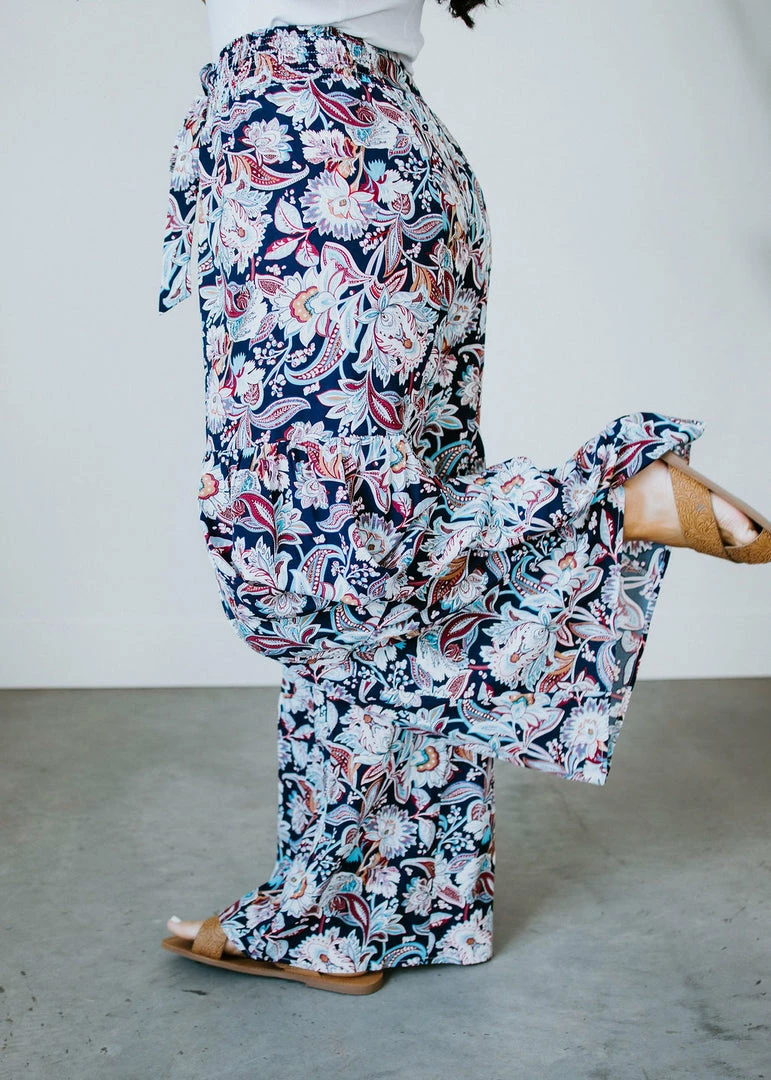 Get a bloom already! These wide-leg pants feature a tying sash, smocked accents at the waist, and a floral print throughout. Gorgeous tiered panels at the sides of the legs add a feminine touch to the flowy silhouette. Perfect for sashaying your way through summer. Shelby is wearing a medium. Laurie is wearing a small.