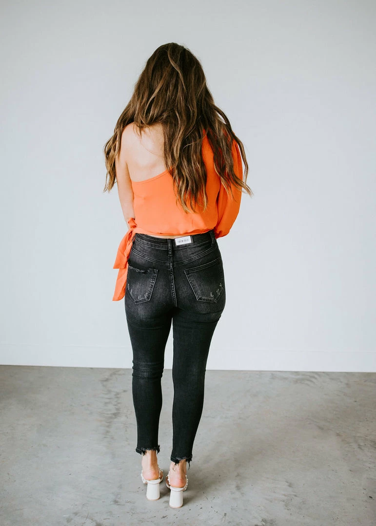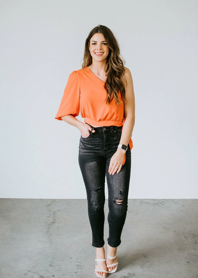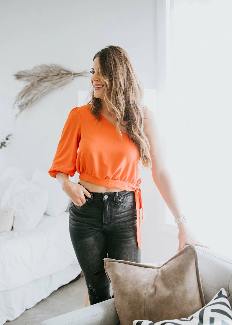 Dance the night away in our Lele One Shoulder Top! This alluring design features a one-shoulder neckline with elastic at the cuff and hemline. Lightweight woven fabric shapes the loose-fit silhouette. Complete with a tie detail on the side in a cropped silhouette. Pair with statement earrings for a fun and flirty look. Kara is wearing a small.