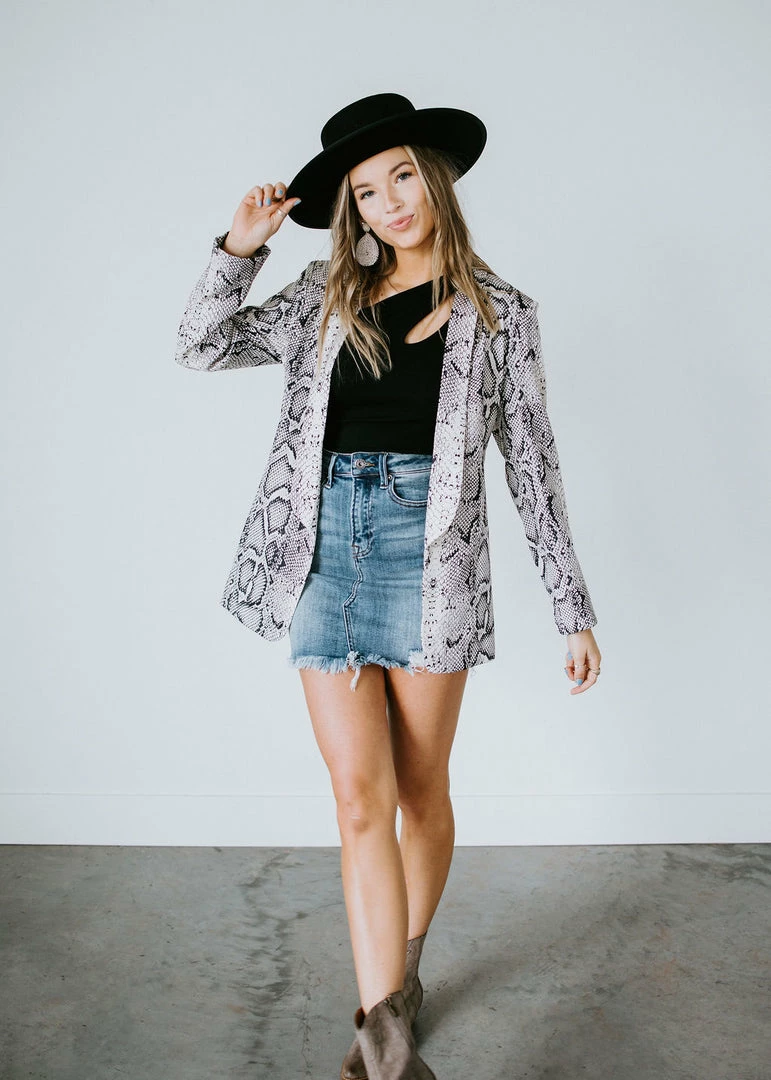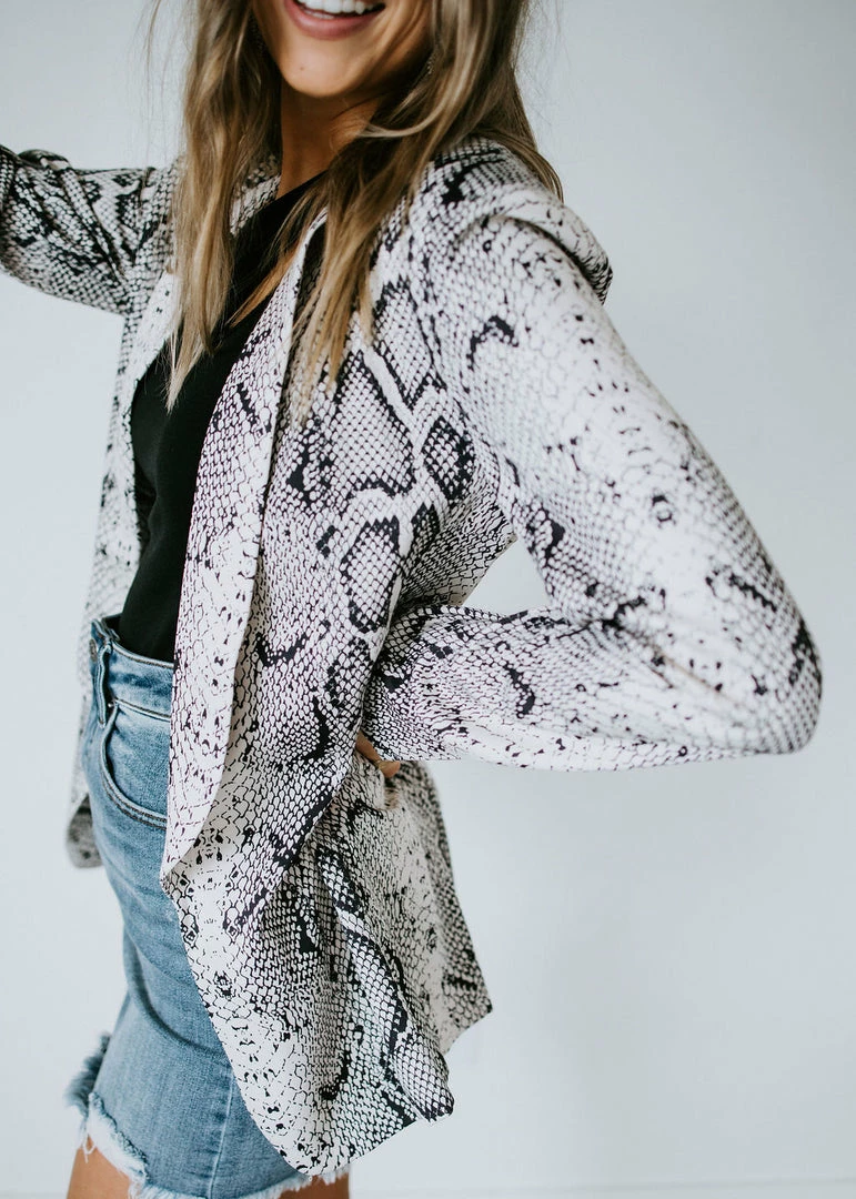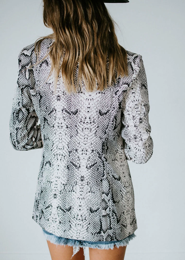 Snakeskin is the new neutral! Whether you’re heading to work or out to play, this Wild Potential Blazer is the perfect piece for any day! Features an elevated classic silhouette that fits true to size with an extended length. Fitted ruched ¾ sleeves, an open front, and side pockets detail the blazer with style and functionality. Lined. Baylee is wearing a small.