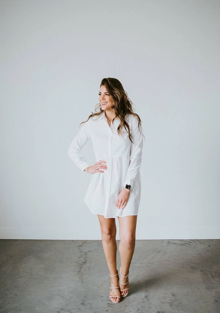 A dress to add a festive feel whenever called upon, this flowing style has delicate ruching at the shoulders, and long sleeves. Complete with a collared neckline and button up front. Wear it belted to define the waist or go without for ultimate freedom of movement. Kara is wearing a size small.