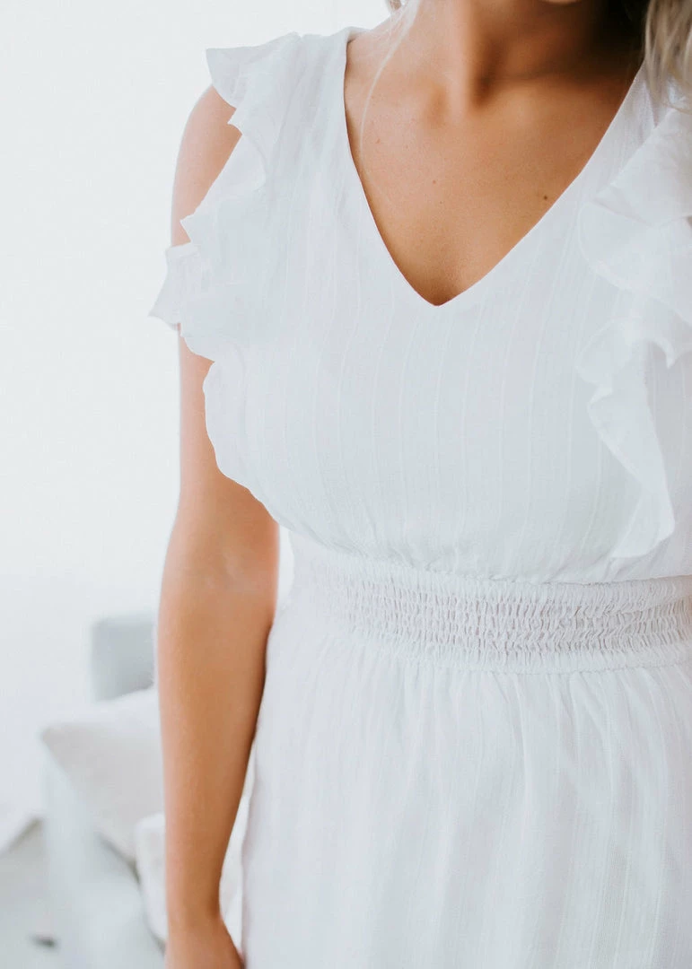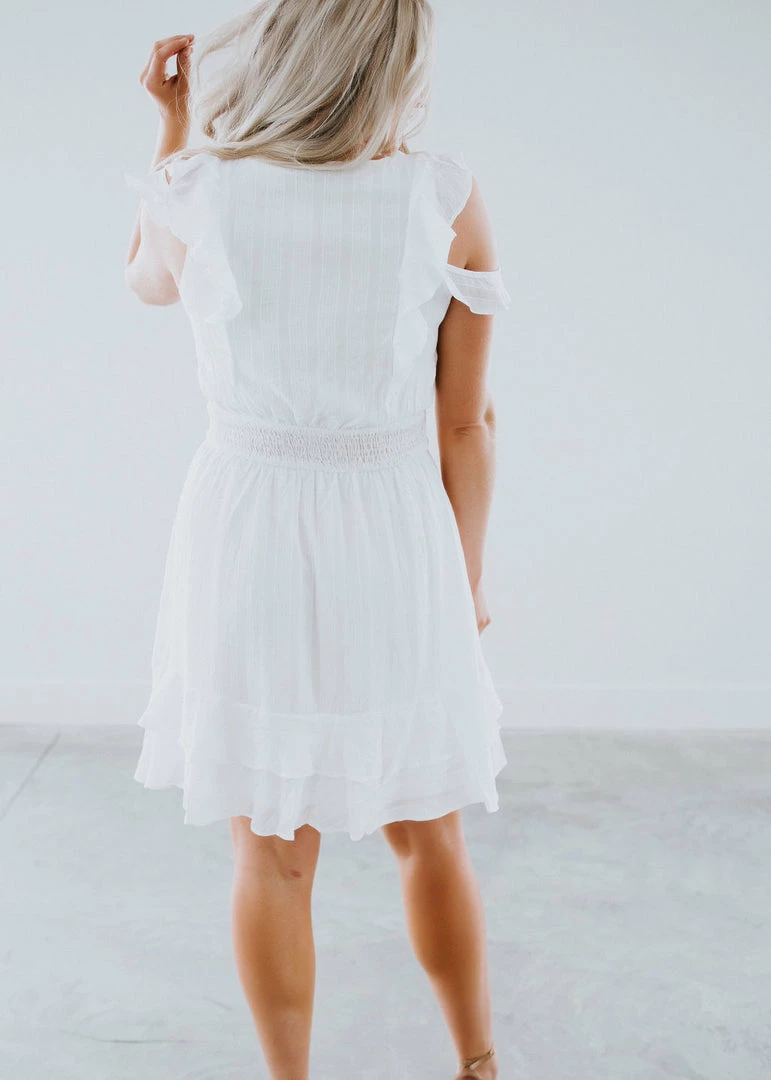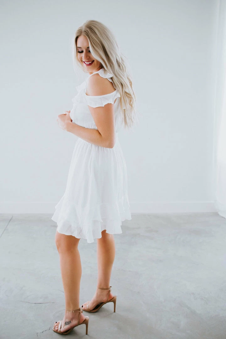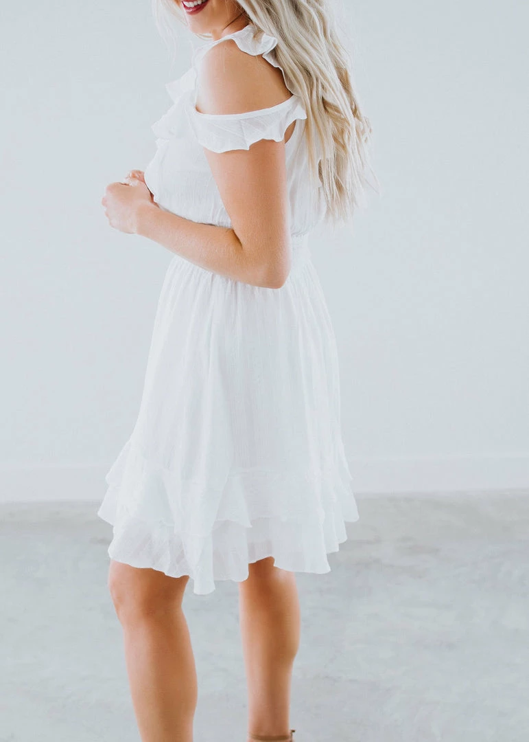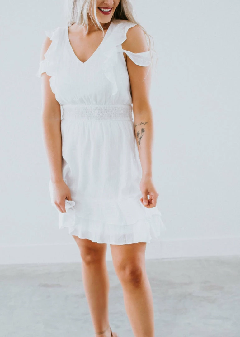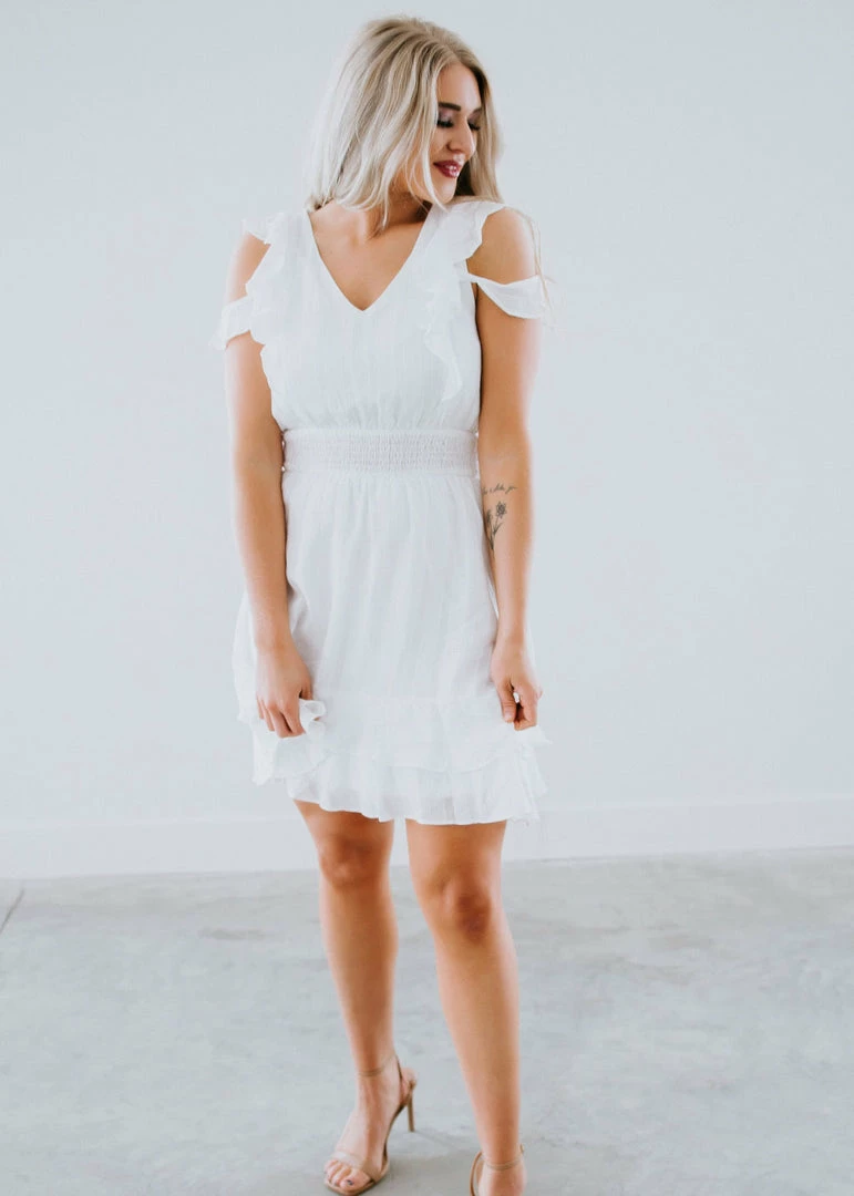 This party-ready dress is just the thing to put the swing in your step. Pair with your favorite pair of wedge sandals and you’re ready to go! Designed with a V-neckline, ruffles throughout, and cold shoulder detail. Shaped by lightweight woven fabric with a smocked waistband for a feminine look. Lined. Kaylor is wearing a medium.