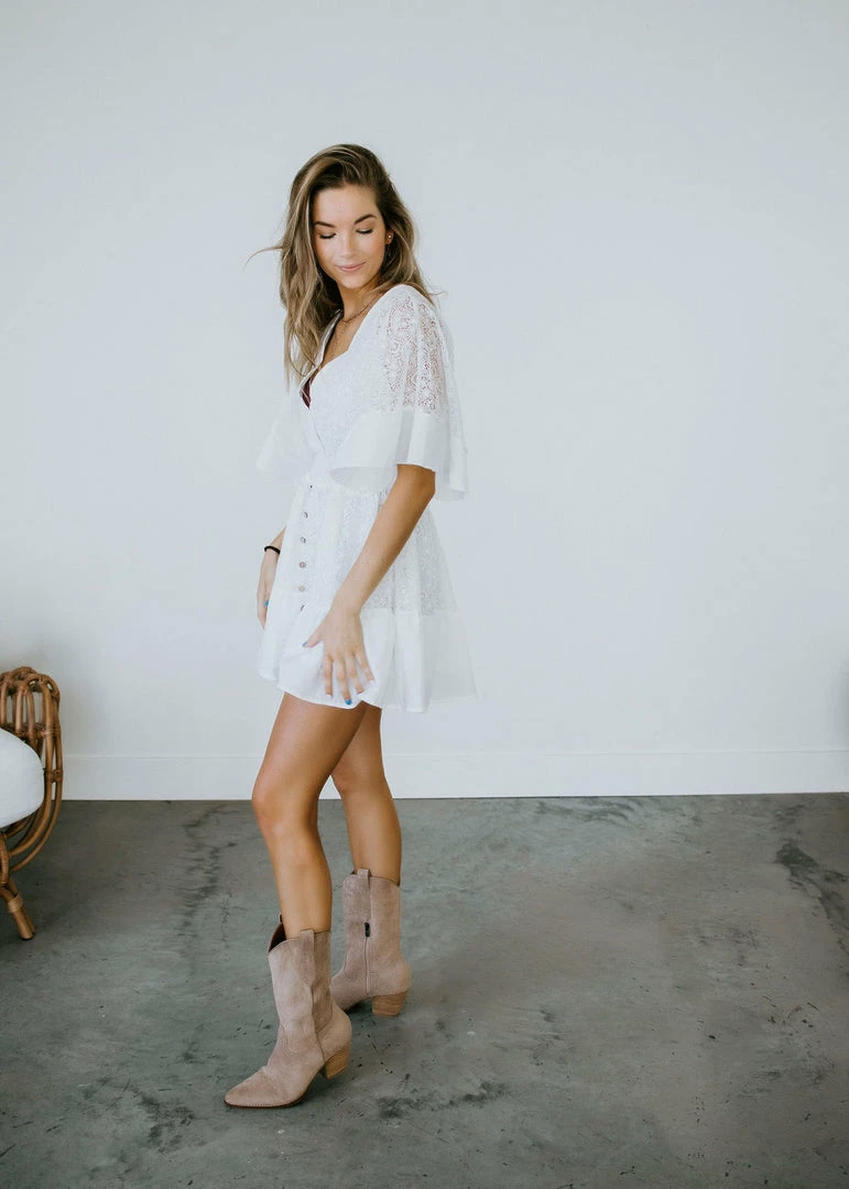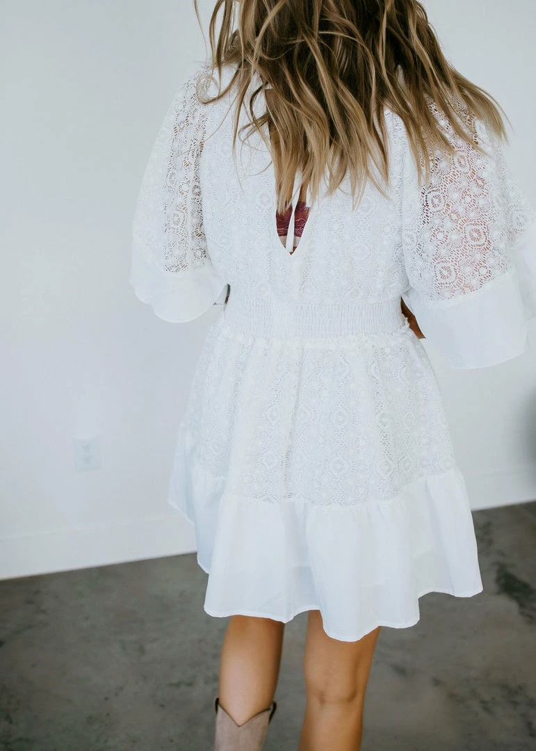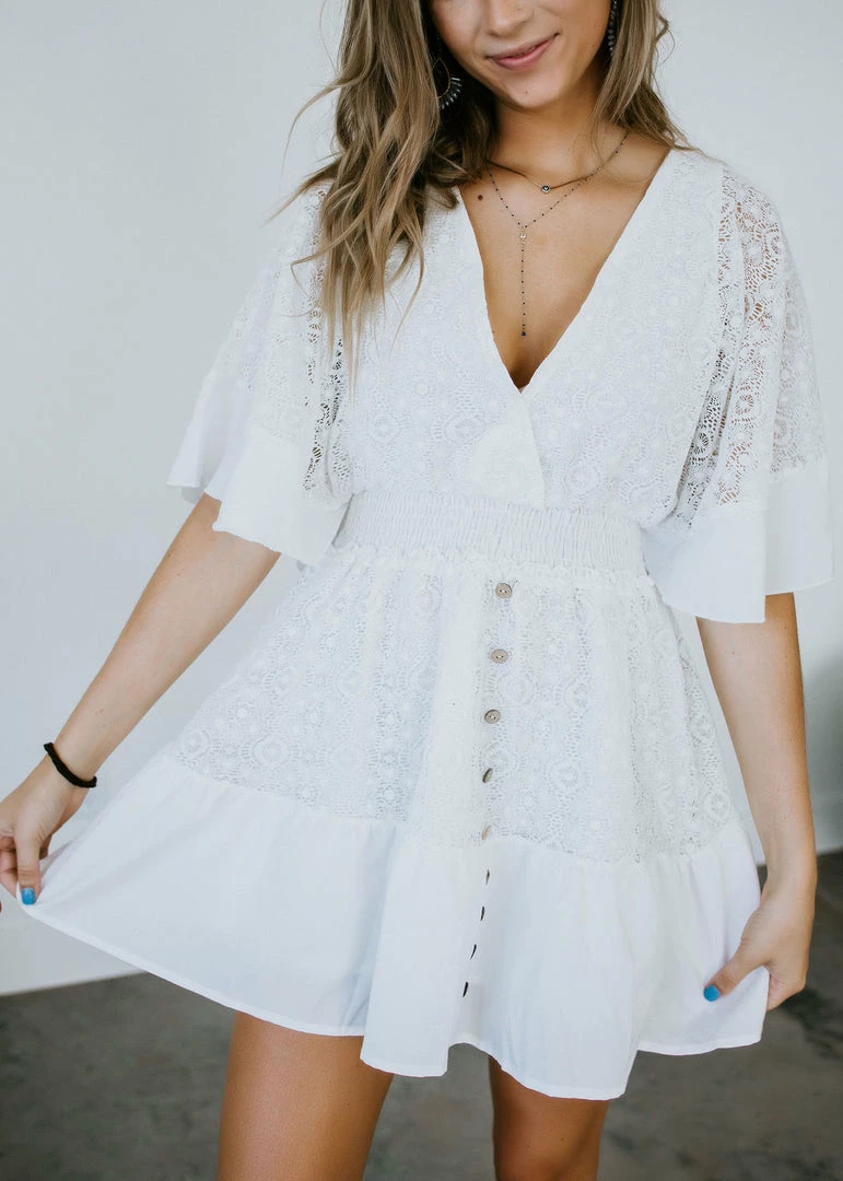 Send hearts racing with this gorgeous dress! Features a plunging surplice neckline, tie detail in the back, and kimono sleeves, Smocked waistband sits atop a flared skirt trimmed at the hem with contrast fabric. Embellished with decorative wooden buttons. Wear with layered necklaces for a lovely look. Lined. Baylee is wearing a small.