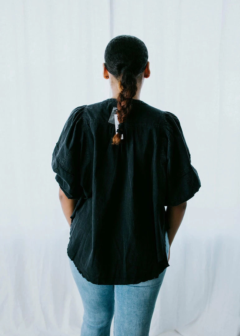 Open up a world of styling possibilities with our Pandora Pintuck Top! Breathable cotton shapes the relaxed-fitting design with puffed shoulders and short blouson sleeves. A band collar sits atop a full button placket and pin-tucked detailing at the chest for added dimension. Raw edge detailing throughout and a rounded hem complete the look. Pair with jeans for an effortlessly stylish outfit! Cathyliana is wearing a small.
