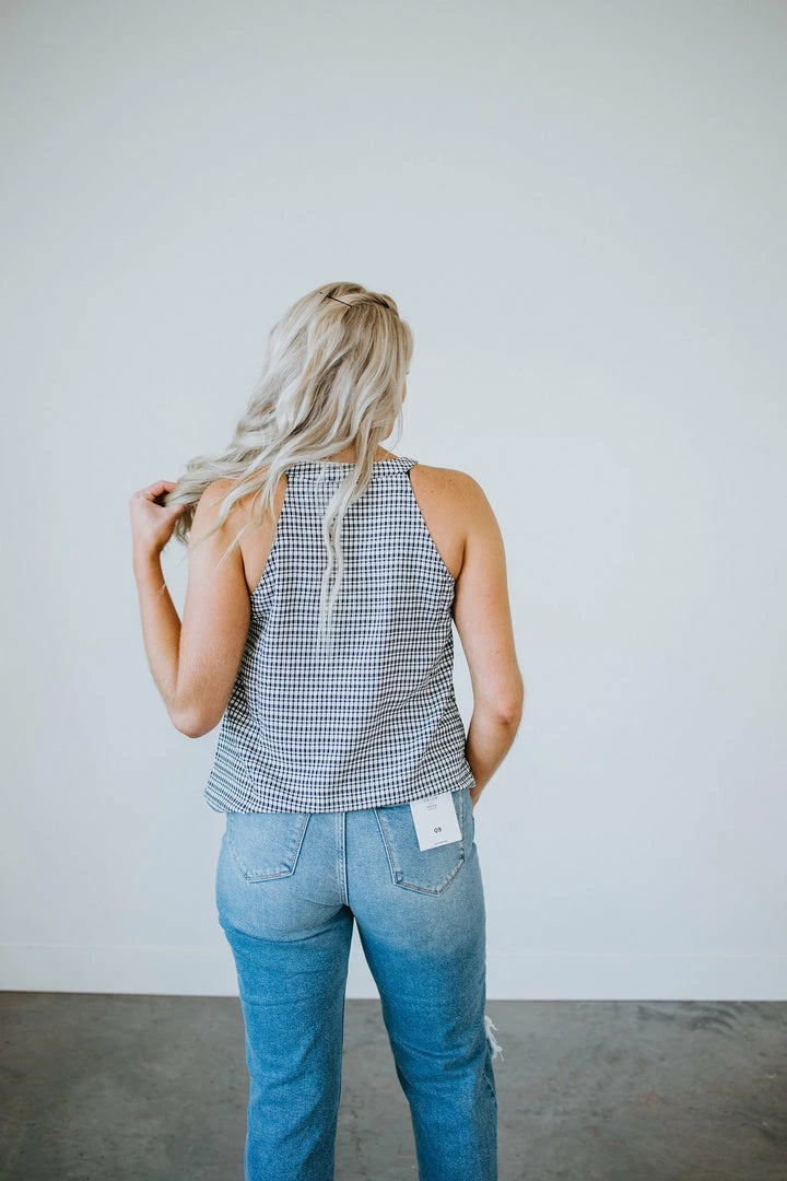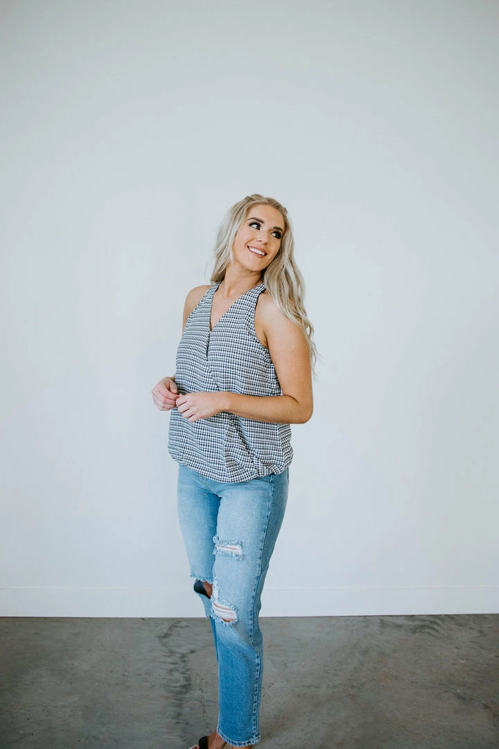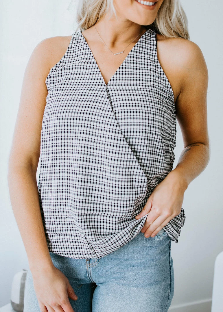 Checking off your to-do list will be no sweat with this classic tank top. Featured in a plaid pattern with a surplice neckline, modesty snap, and elastic at the front hem for added shape. From day to night, the flattering silhouette will keep you looking fabulous. Kaylor is wearing a medium.