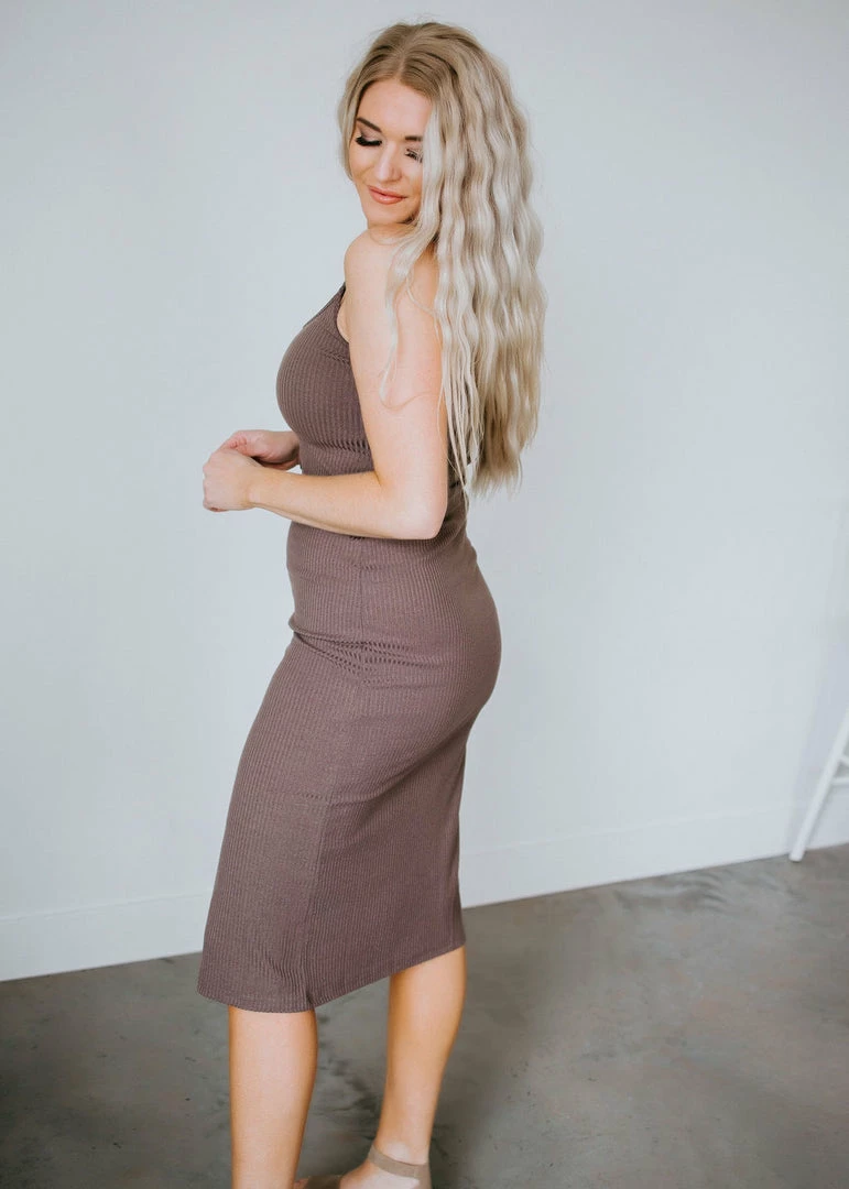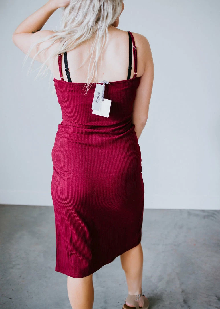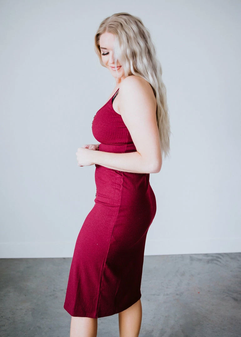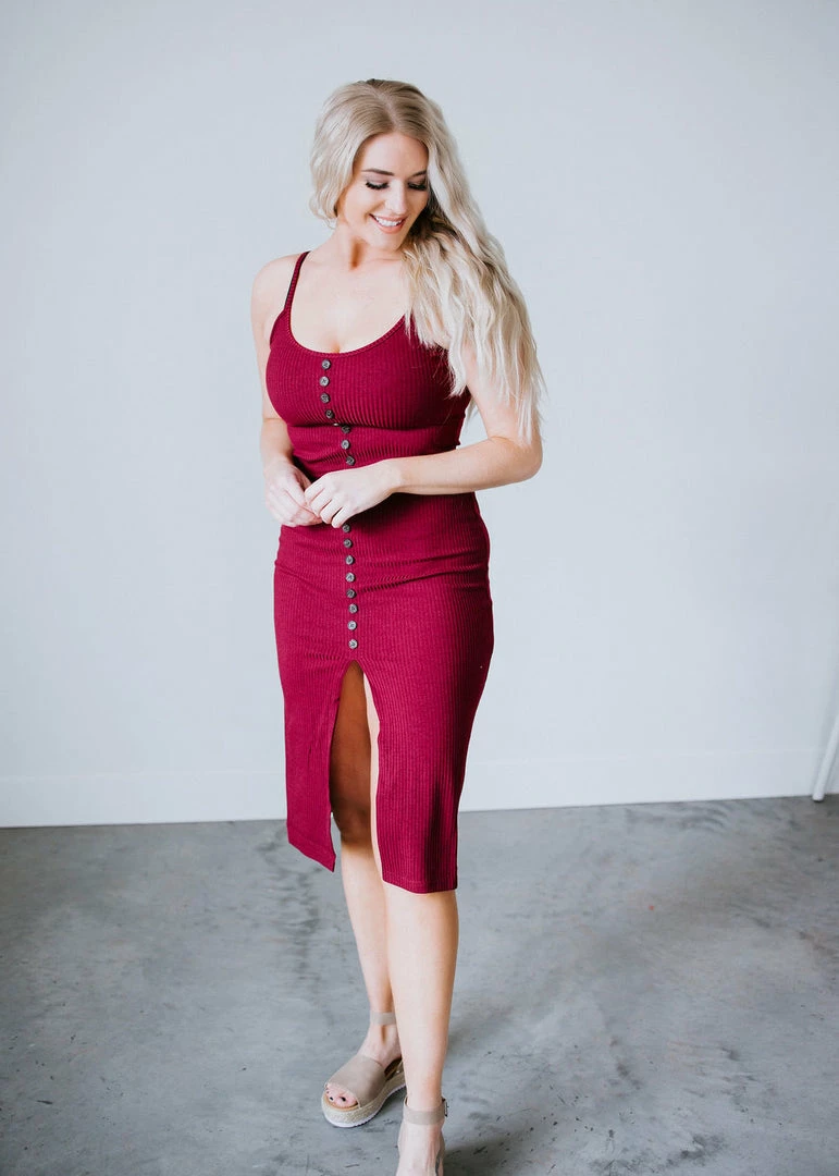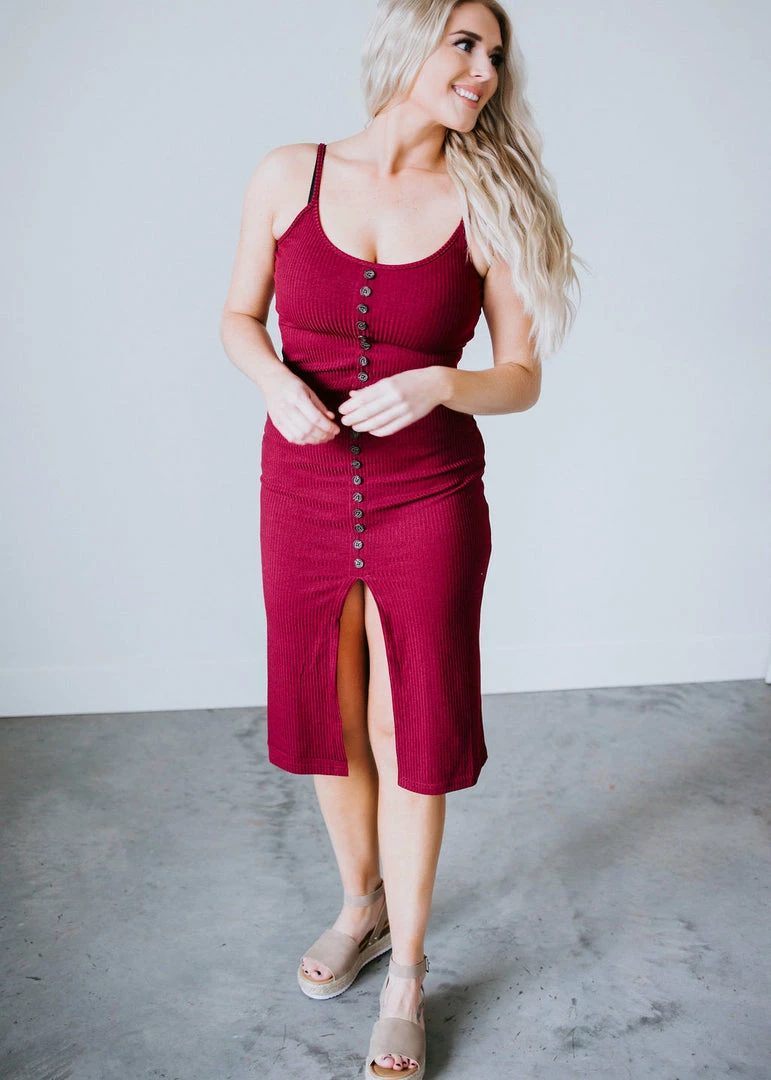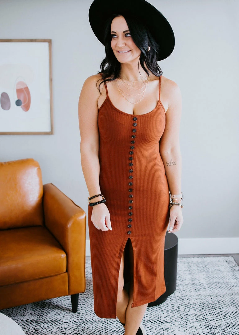 The changing of seasons isn’t the only thing capturing our attention right now! This gorgeous ribbed knit midi dress is so versatile you will be reaching for it all year long. This figure-hugging dress features a round neckline, thin adjustable straps, a row of faux buttons down the front, complete with a center slit. The possibilities are endless, it’s all you need! Fits true. Laurie and Kara are wearing a size small. Kaylor is wearing a medium.