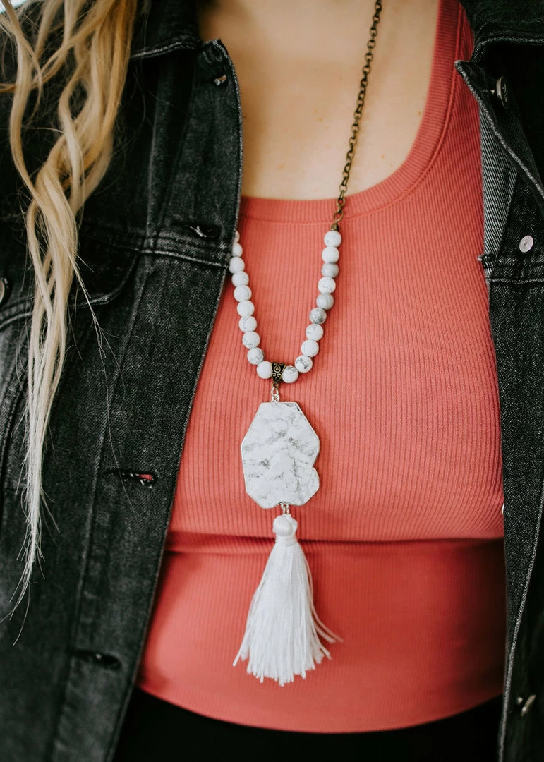 You’ll show the world your impeccable taste while wearing this beautiful tassel necklace. Long, adjustable chain necklace with stone beads on bottom half of chain.