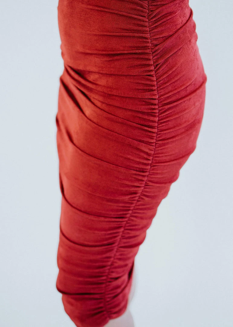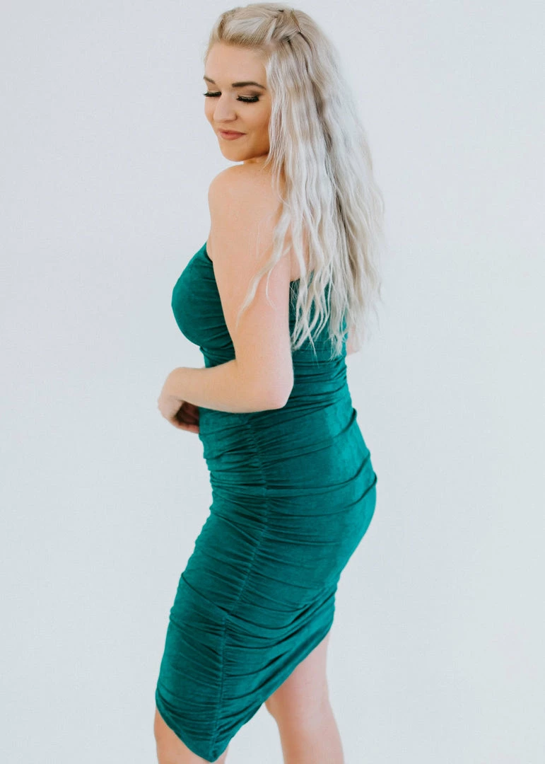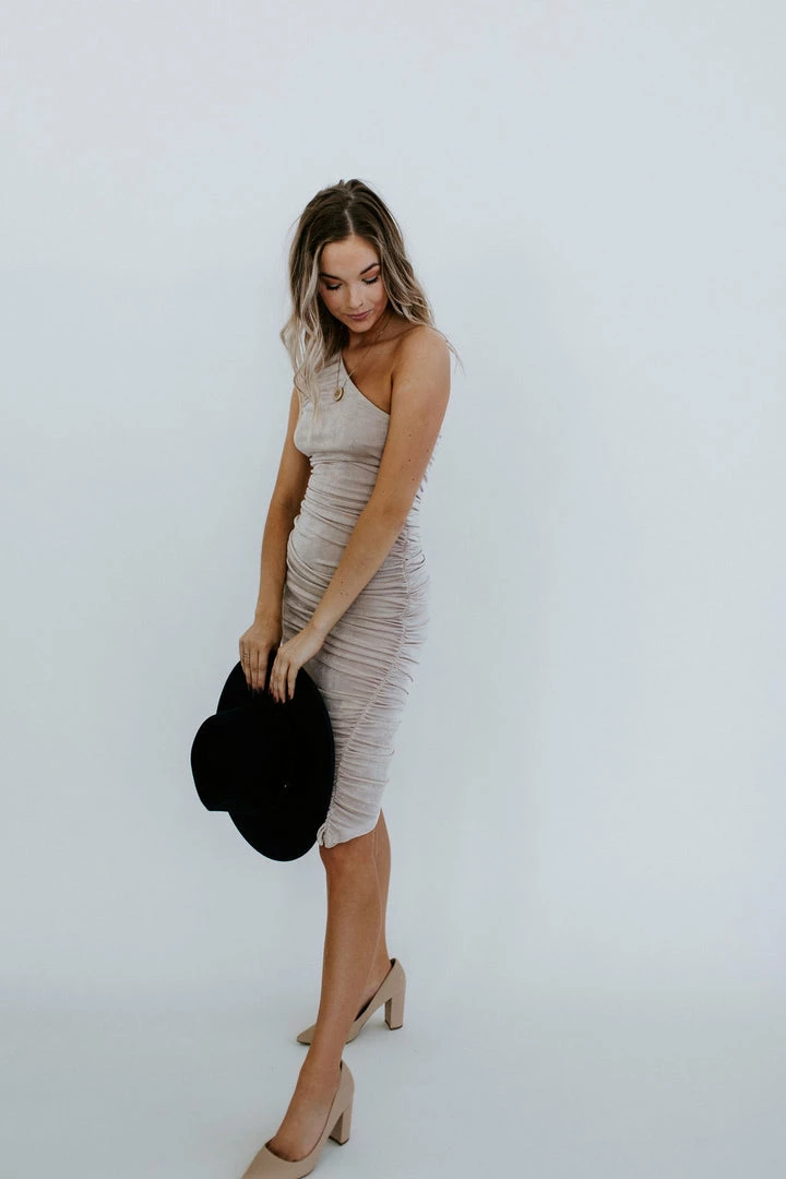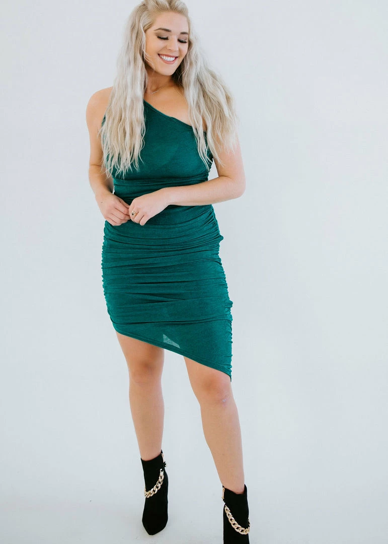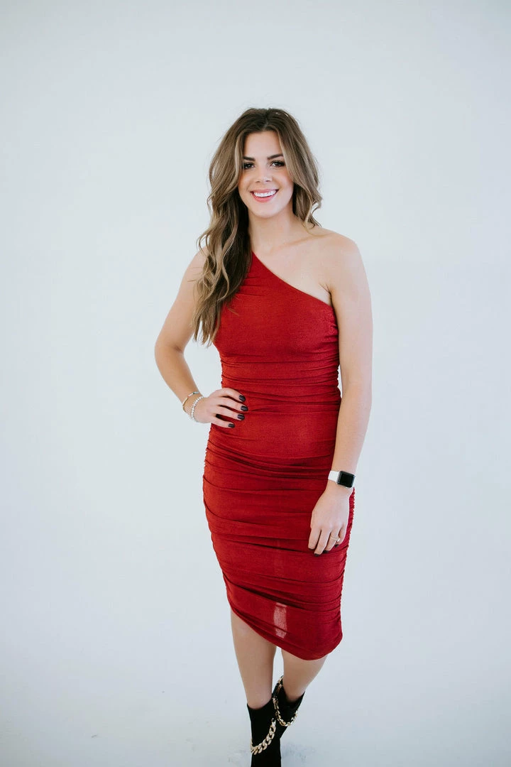 It will be love at first sight with this dreamy dress! The flattering one-shoulder design is styled with an asymmetrical hemline and ruching along the sides. Stretchy lightweight fabric with a shimmery finish adds dimension to the fitted silhouette. Pair with some heels for your next big event. Baylee and Kara are wearing a size small. Kaylor is wearing a size medium. We recommend a nude slip/underwear underneath.