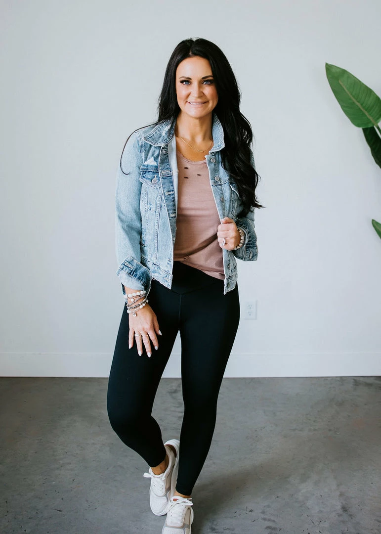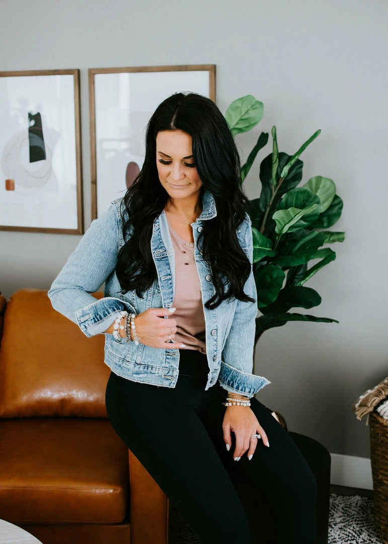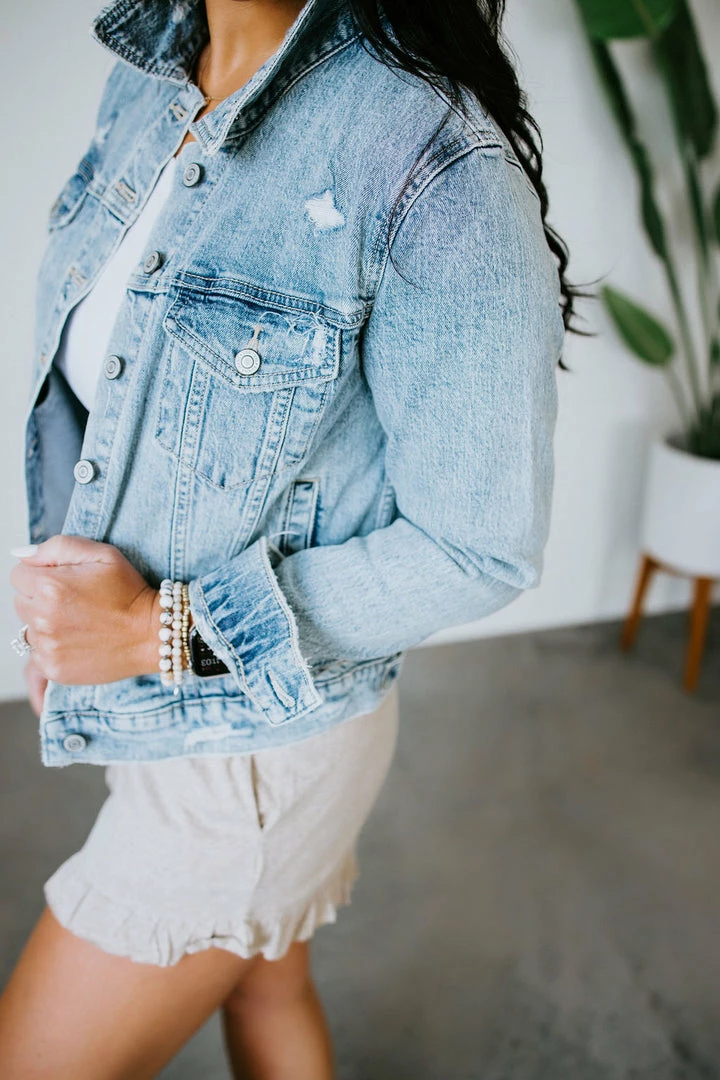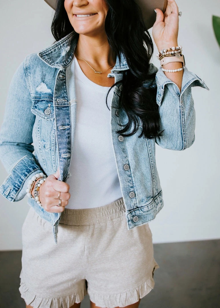 You wear it well! Our Phoebe Distressed Denim Jacket is the perfect complement to your casual-classic style. With its light-washed denim construction and edgy distressed details, you’ll never want to leave home without it. Features a collared neckline, button front closure, flap pockets, and button cuffs. Side pockets and waist tabs complete the look. Laurie is wearing a small.