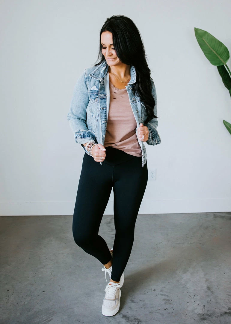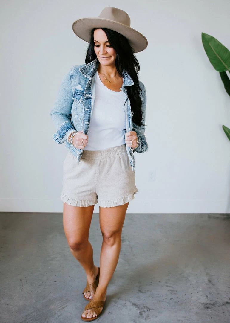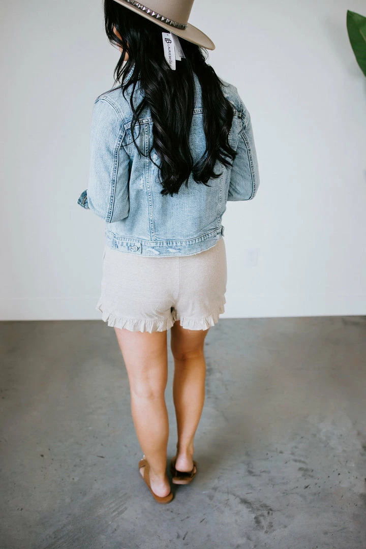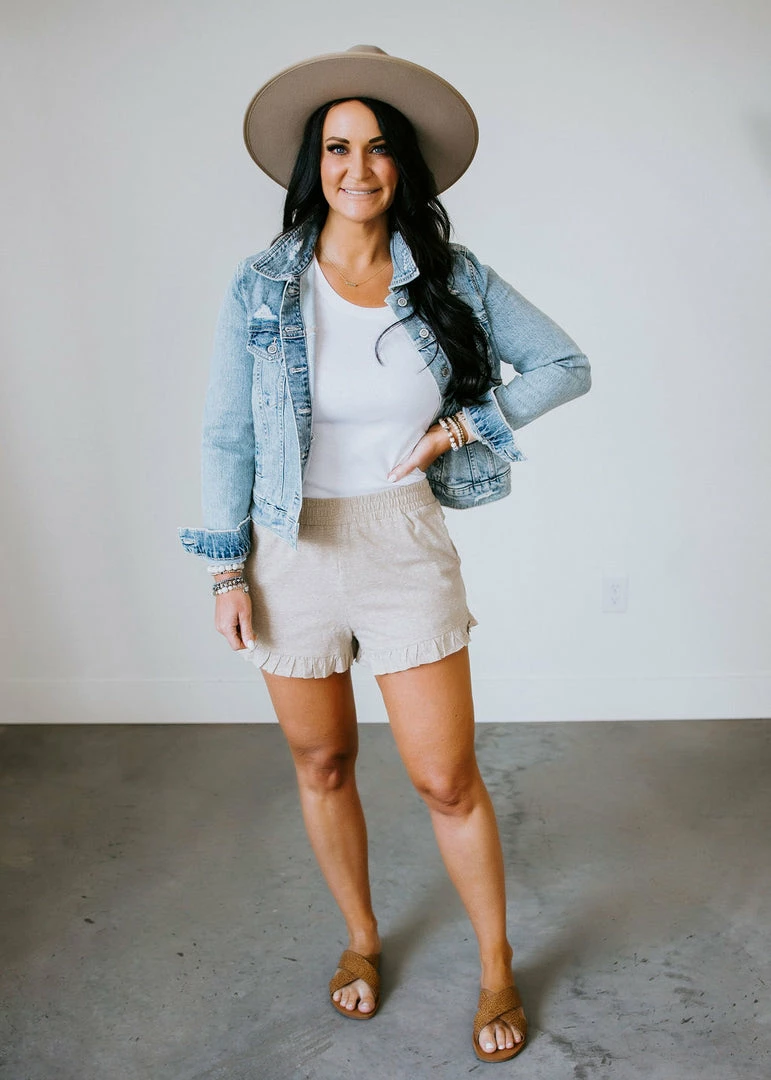You wear it well! Our Phoebe Distressed Denim Jacket is the perfect complement to your casual-classic style. With its light-washed denim construction and edgy distressed details, you’ll never want to leave home without it. Features a collared neckline, button front closure, flap pockets, and button cuffs. Side pockets and waist tabs complete the look. Laurie is wearing a small.