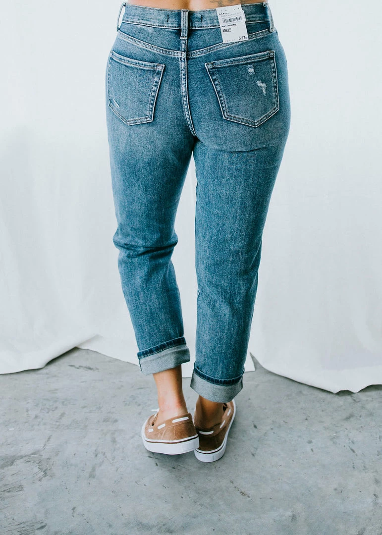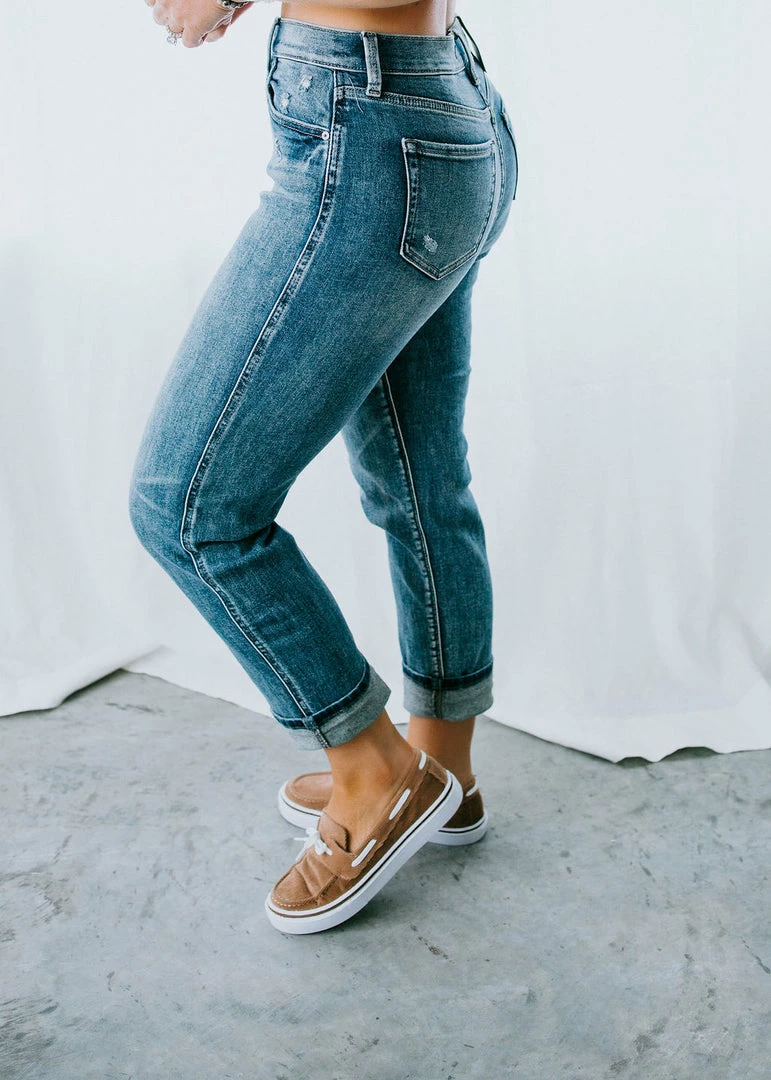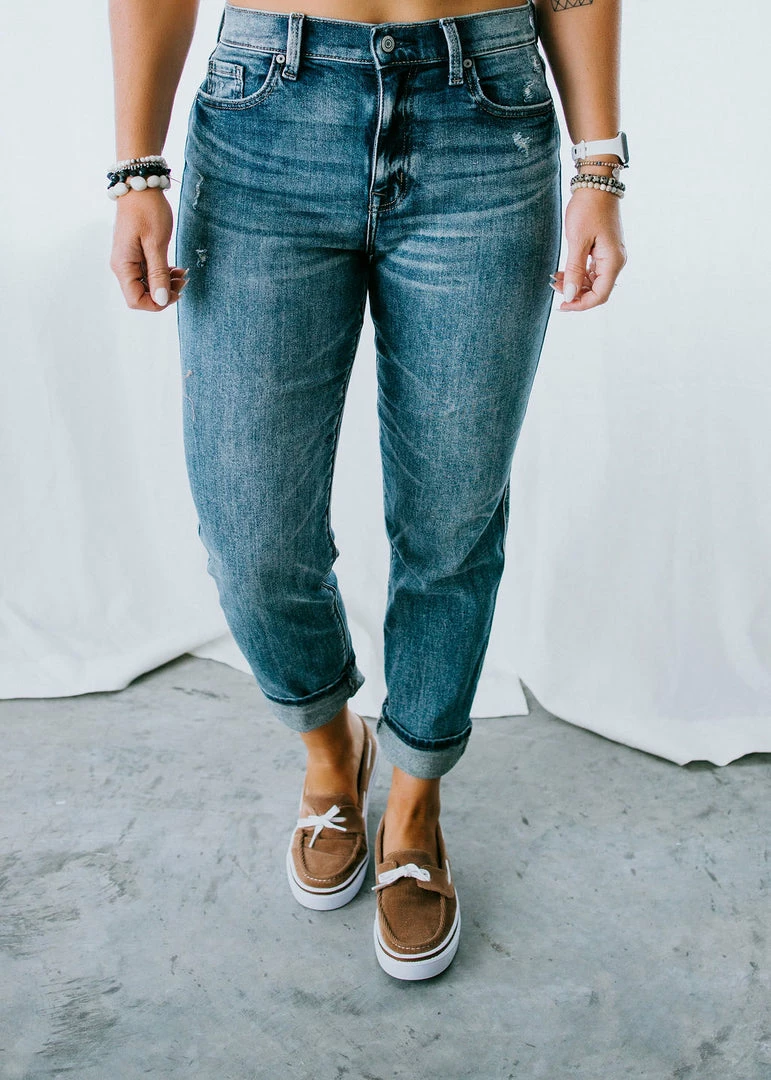 You’re going to fall in love with the laidback style of these luxe boyfriend jeans. We love them for the relaxed fit, cuffed pant leg, intentionally light distressed with fading and whiskering details. Amazing stretch. Eunina brand. Laurie is wearing a size 5.