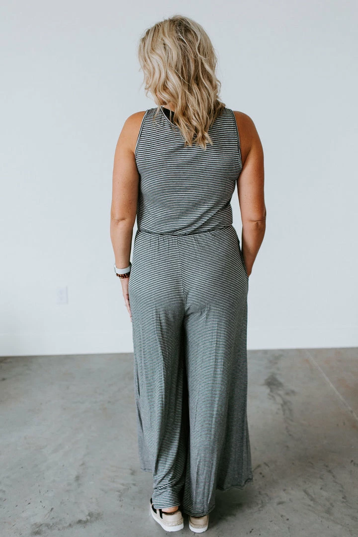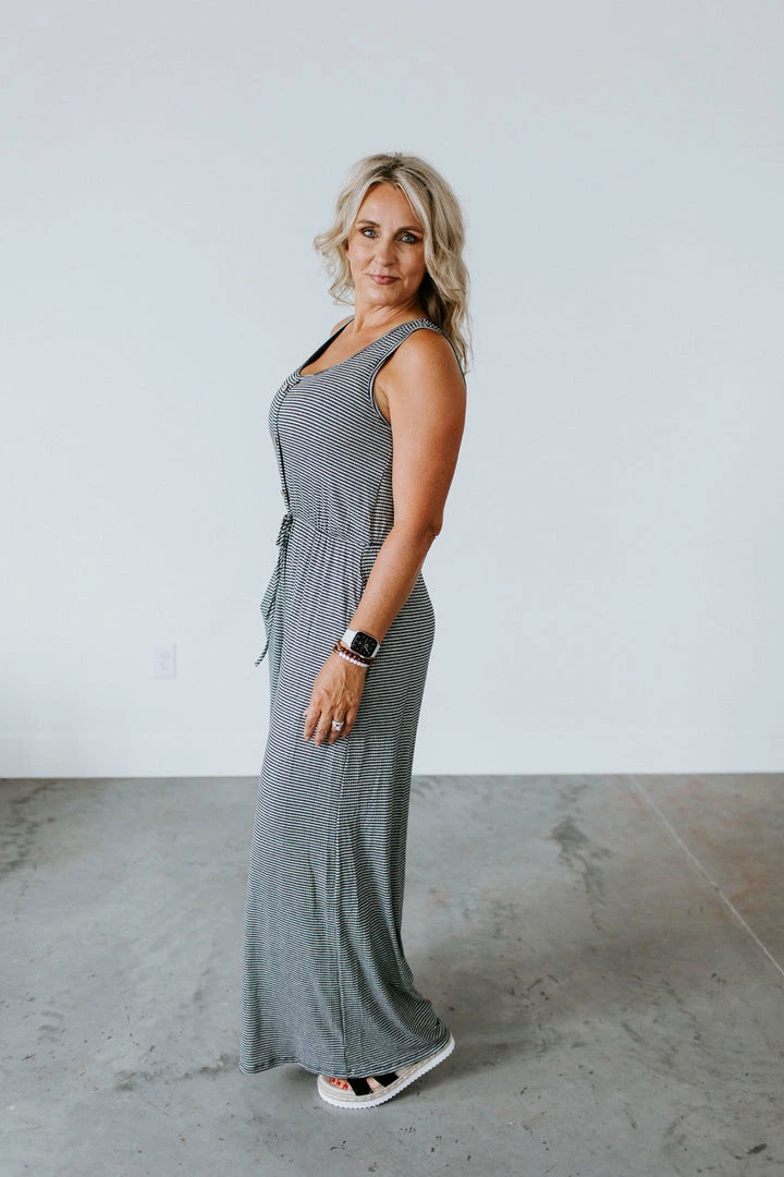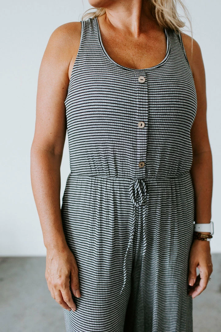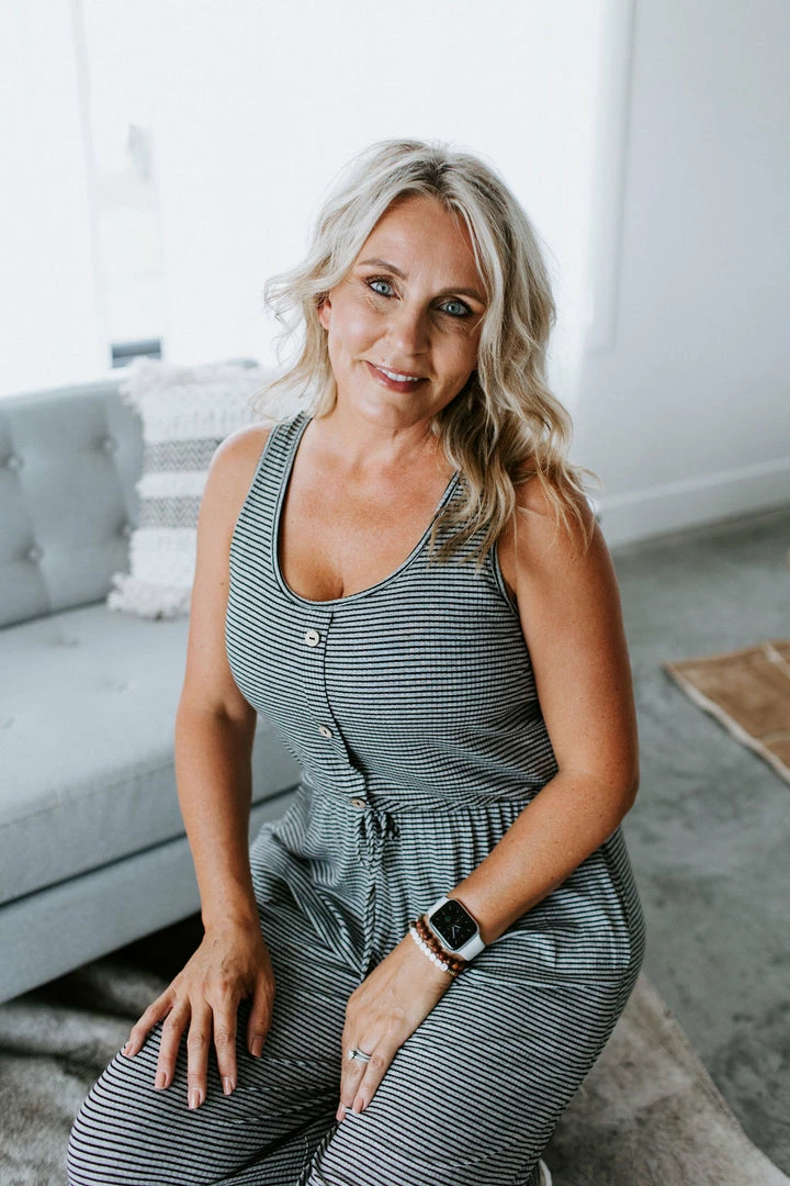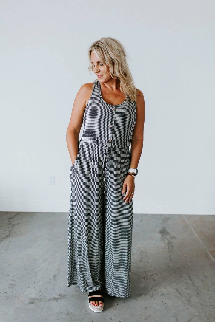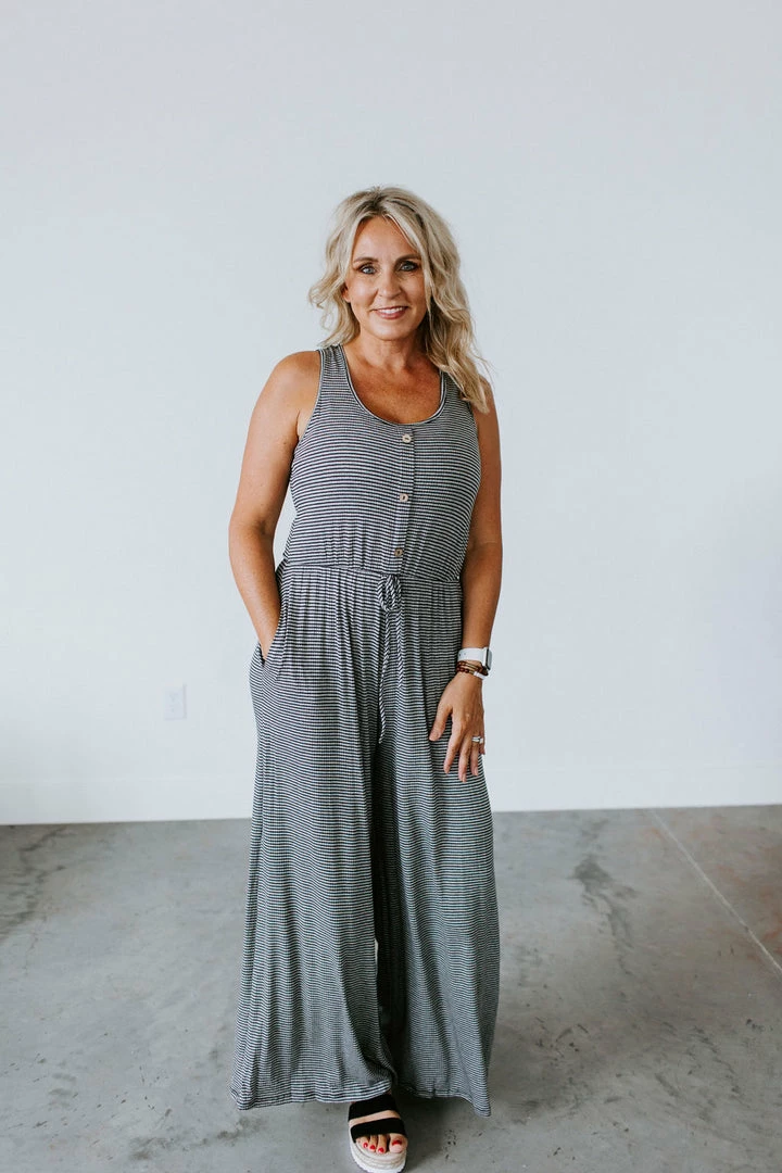 Can you say obsessed!?! Most wanted jumpsuit for your closet. The Sitting Pretty Jumpsuit is multifaceted for just about any girl. We love the vintage coloring, drawstring accented waist that ensures the perfect amount of cinch that will flatter any figure, pockets, and button up front. Jen is wearing a size medium.