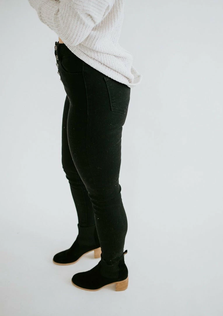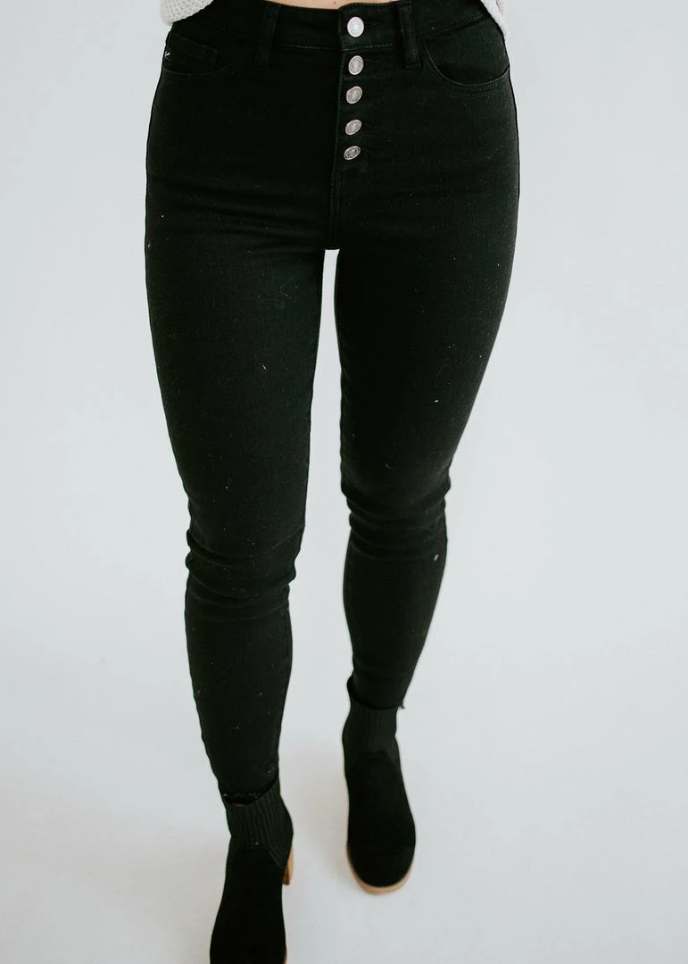 The best of the denim is back in stock! High-rise black skinny jeans feature a button-up front, classic five-pocket design, and raw hemline. Chelsey is wearing a size 5 and Loghin is wearing an XL.
