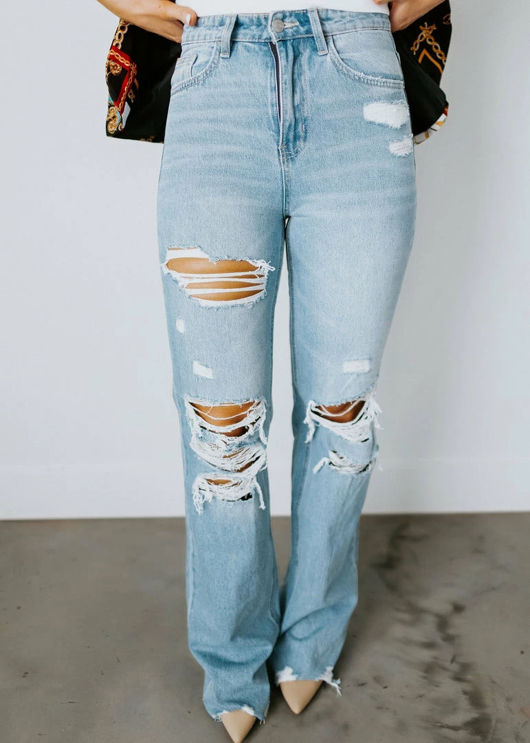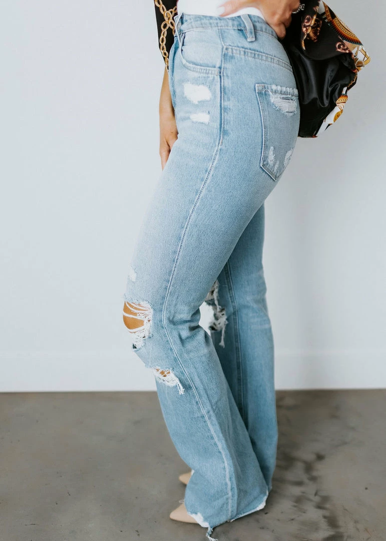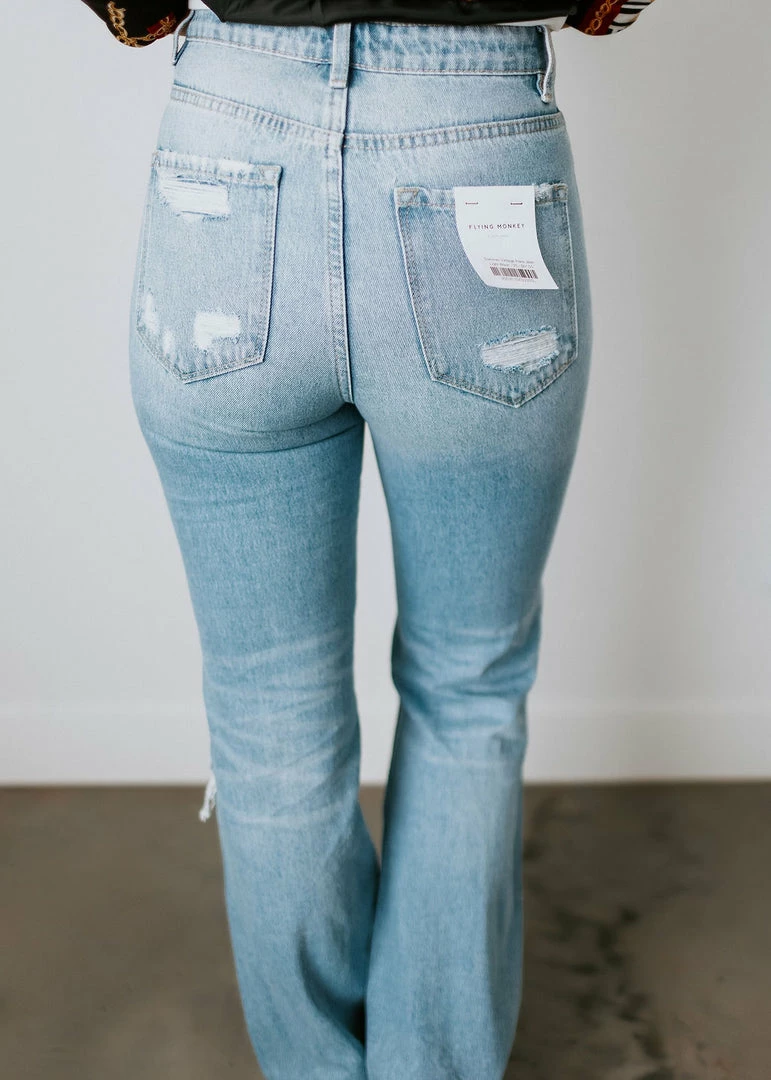 Refresh your denim collection with these vintage flare jeans from Flying Monkey! Created with durable non-stretch denim for a ’90s-inspired relaxed fit. Five-pocket design with unique distressing, destroyed knees, and raw hems. We recommend sizing up if in between sizes. Laurie prefers a size up in these.