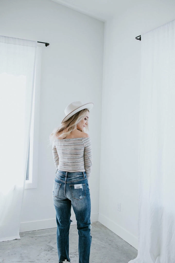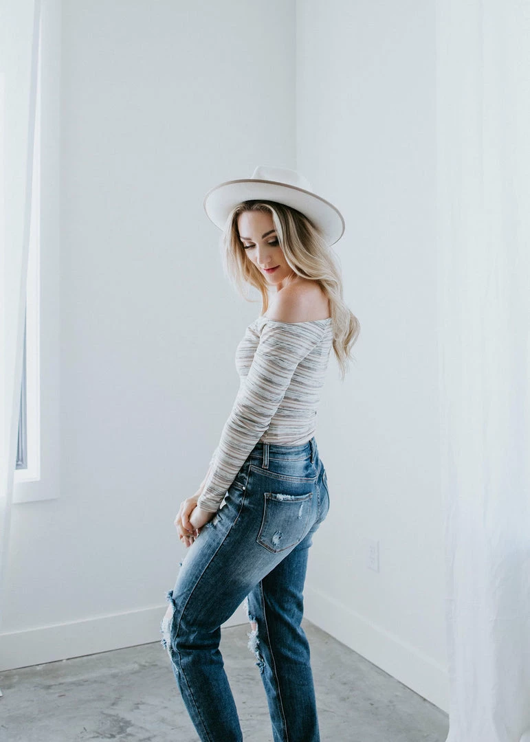 An off-the-shoulder top is an always-flattering silhouette. This one features neutral-hued stripes, long sleeves, and a body-skimming fit. Finished with a panty bottom and snap closure. Thea will inspire endless outfit inspiration! Pair with everything from jeans to mini skirts for a knockout look. Leslie is wearing a small.