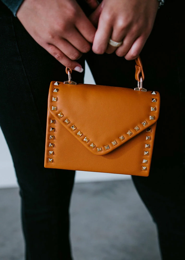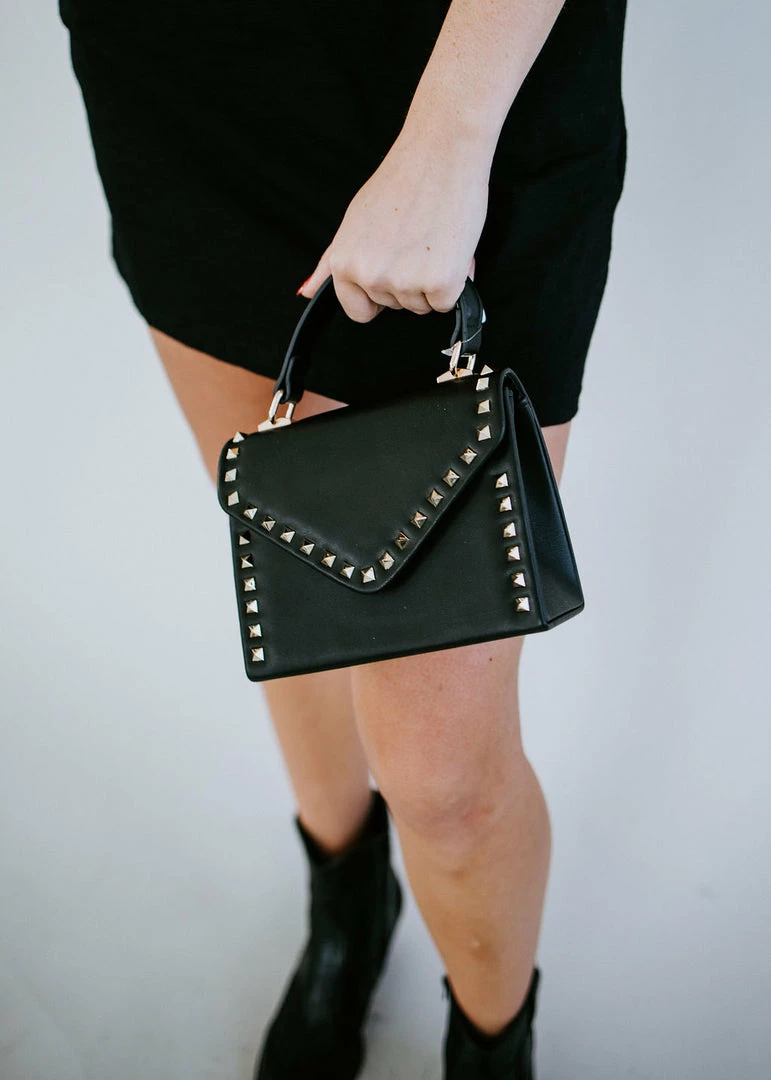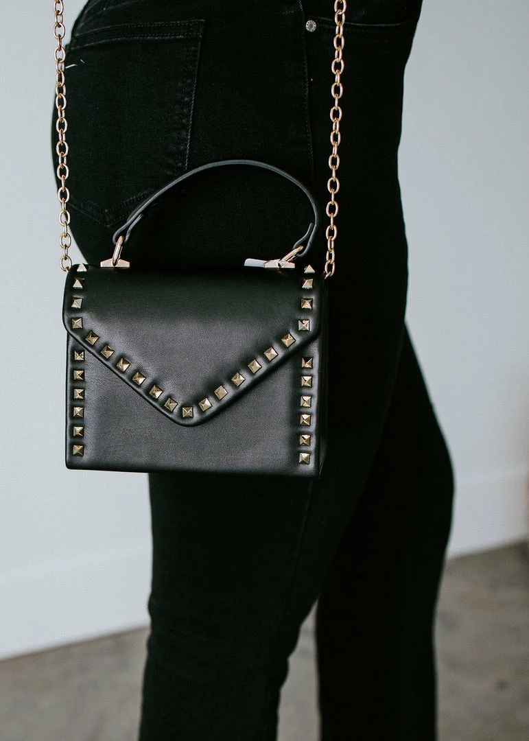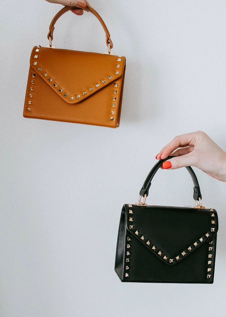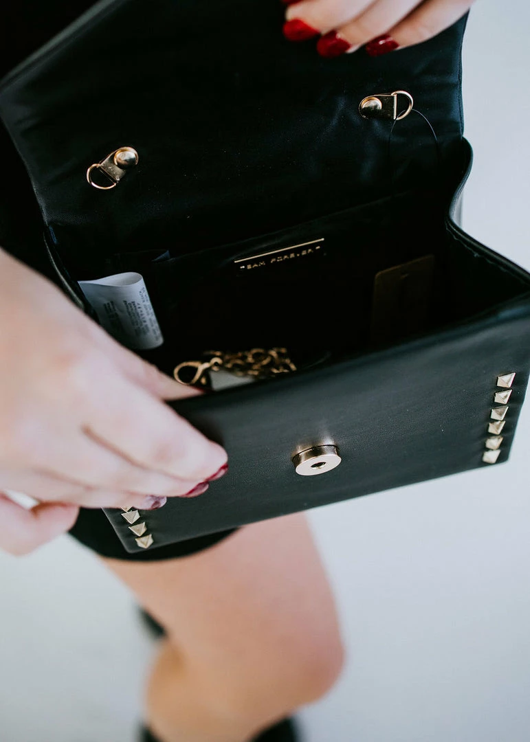 Gleaming studs add shine to this compact, but oh-so-chic bag! Crafted from supple vegan leather with a structured silhouette and a level base for stability. Styled with a top handle, magnetic flap closure, and removable chain strap. Fully lined with an interior wall pocket.