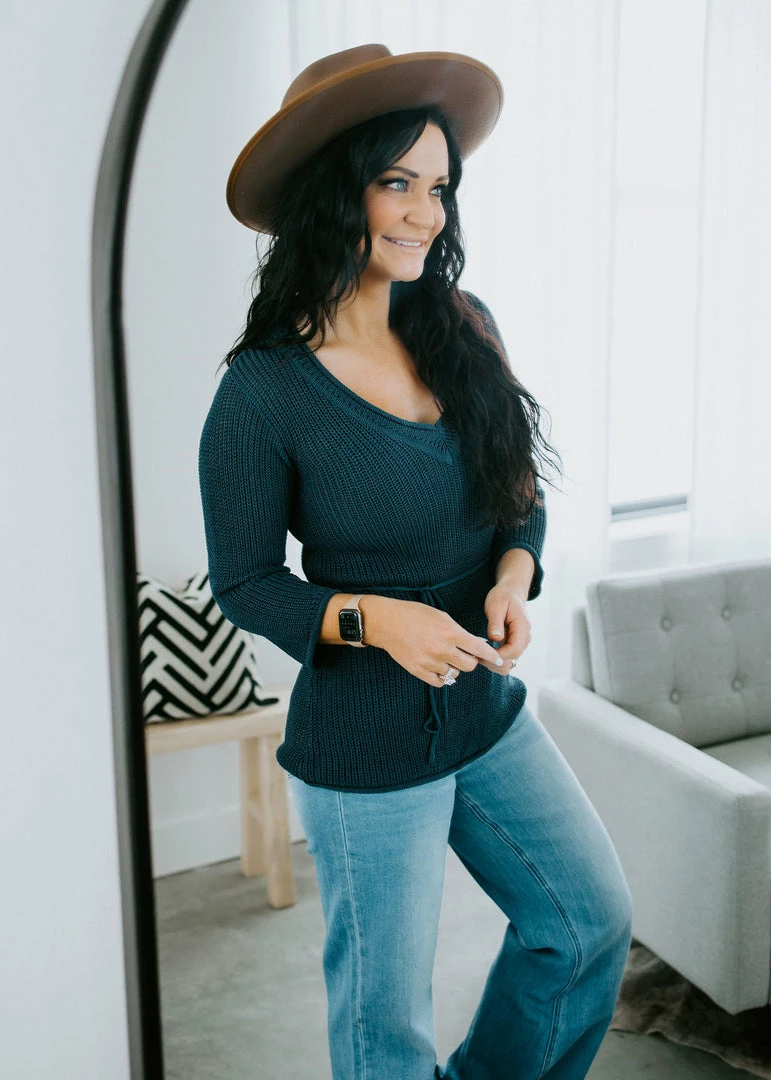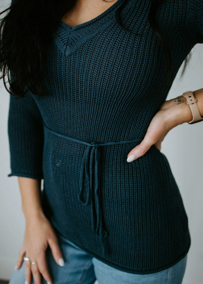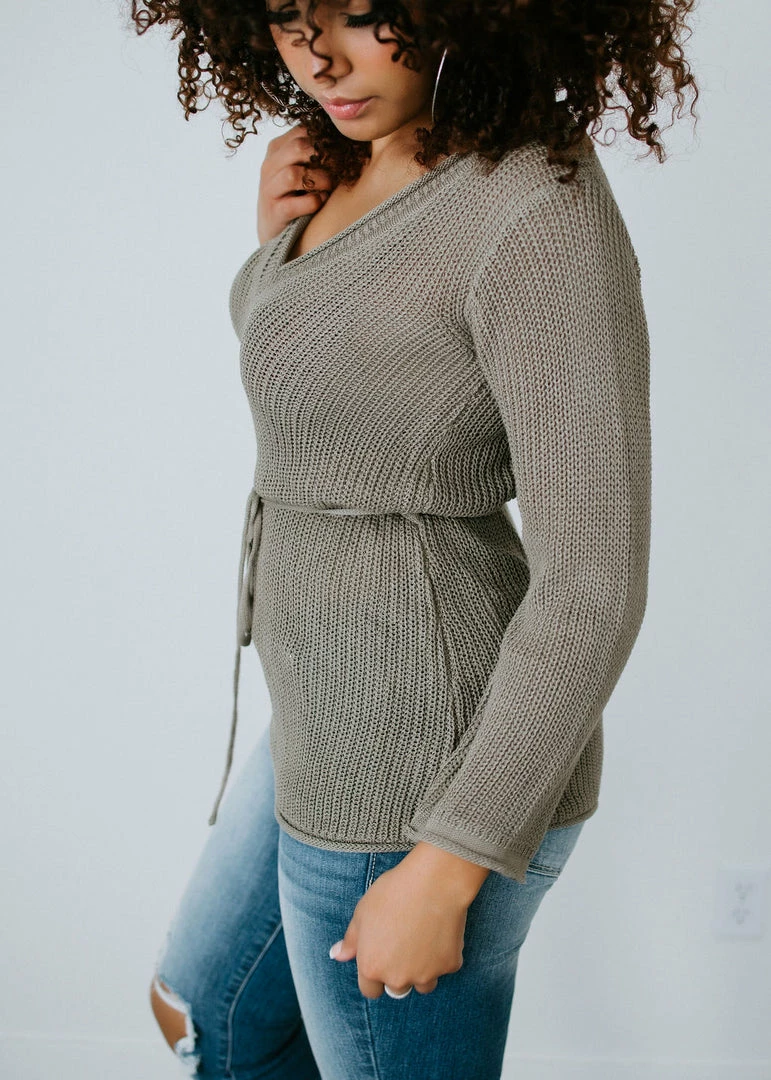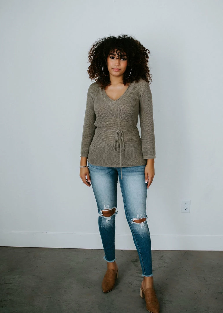 Keep it cute and casual with the Tied Together Sweater. The crochet knit fabric shapes the tunic-length bodice, with a waist-tie detail, complete with relaxed sleeves and a V-neckline. A great staple piece for your spring closet. Pair with white skinny jeans and booties for the look. Laurie and Cathyliana are wearing a size small.