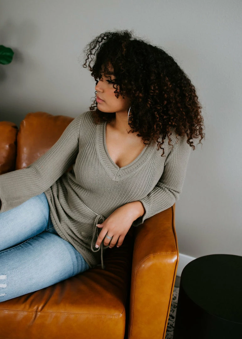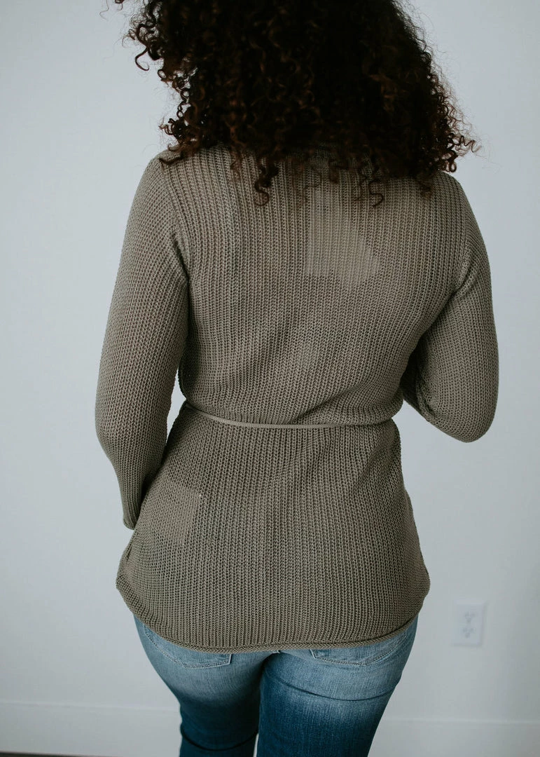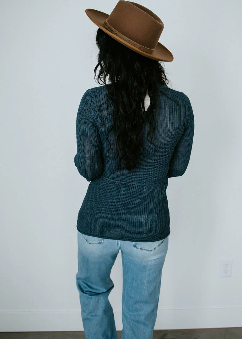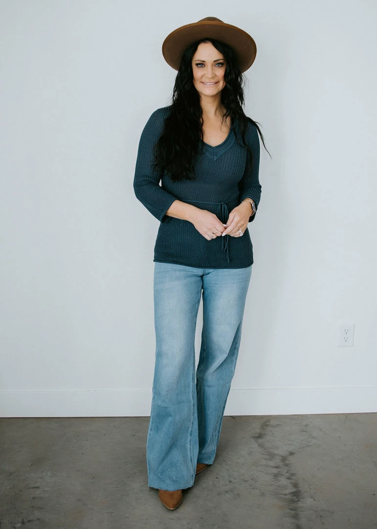Keep it cute and casual with the Tied Together Sweater. The crochet knit fabric shapes the tunic-length bodice, with a waist-tie detail, complete with relaxed sleeves and a V-neckline. A great staple piece for your spring closet. Pair with white skinny jeans and booties for the look. Laurie and Cathyliana are wearing a size small.