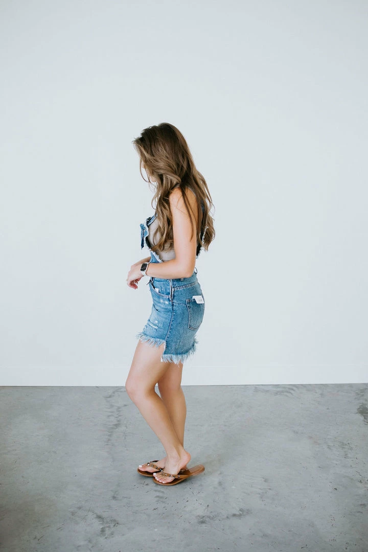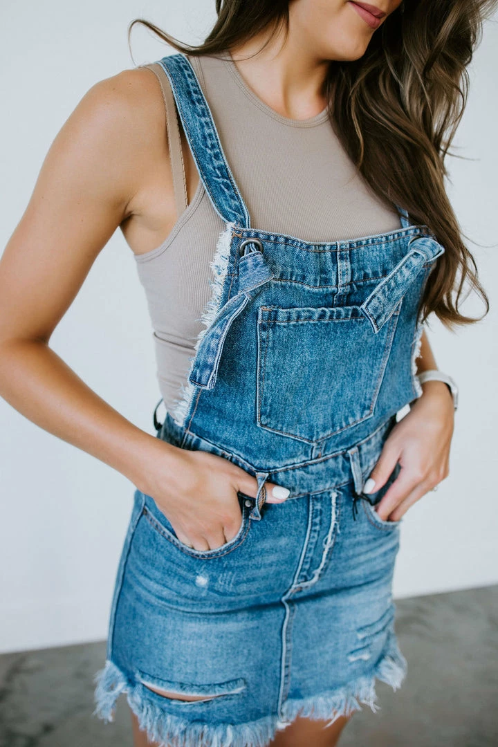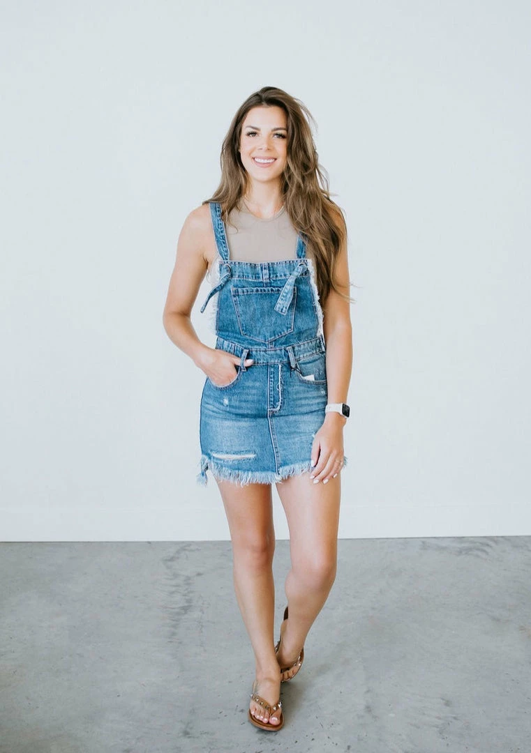 This old trend is making a comeback! Be the first one to style your new overalls with the Ginnie Denim Overall Skirt. Features a frayed hemline, side zippers for comfort, and self-tie shoulder straps. Complete with a high-rise and elastic waistband. Pair over a white blouse for a summer outfit you’re sure to fall in love with! Side pockets and front pouch pocket. Kara is wearing a small.