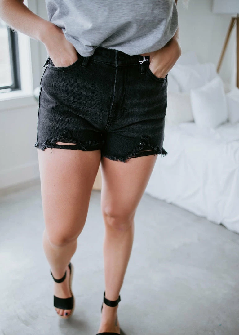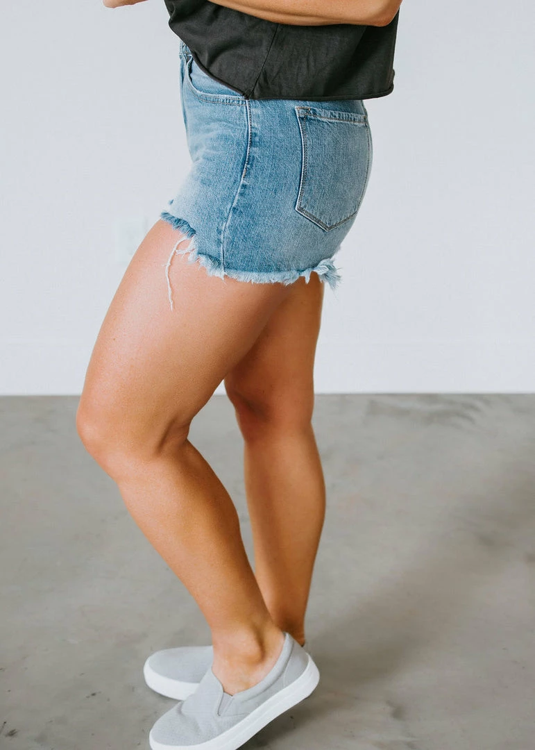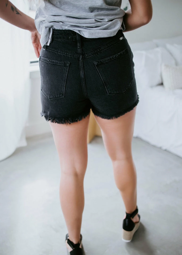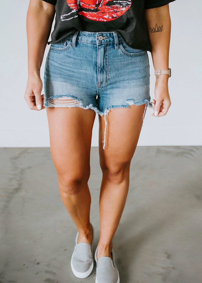 Our Priya High Rise Shorts from KanCan come in a lightweight denim fabrication with fading and whiskering. The raw hem and distressed style give it an edgy vibe that’s perfect for everyday wear. Pair with casual tees or crop tops for a comfortably chic look. Laurie is wearing a size 5 and Kaylor is wearing a size 9. (Dark wash dropping soon.)