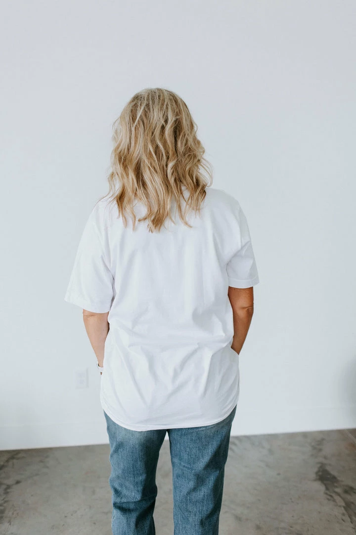 Stay golden, ladies! This essential tee features sunflowers and graphic text atop a soft cotton base. Features an oversized fit with dropped shoulders and short sleeves. This relaxed tee comes with a classic crew neck and a straight hemline. Wear it tucked into your favorite jeans or wear it layered over biker shorts for a sunny day look. Jenn is wearing a size S-M.