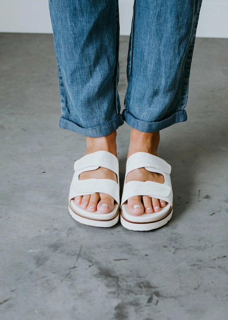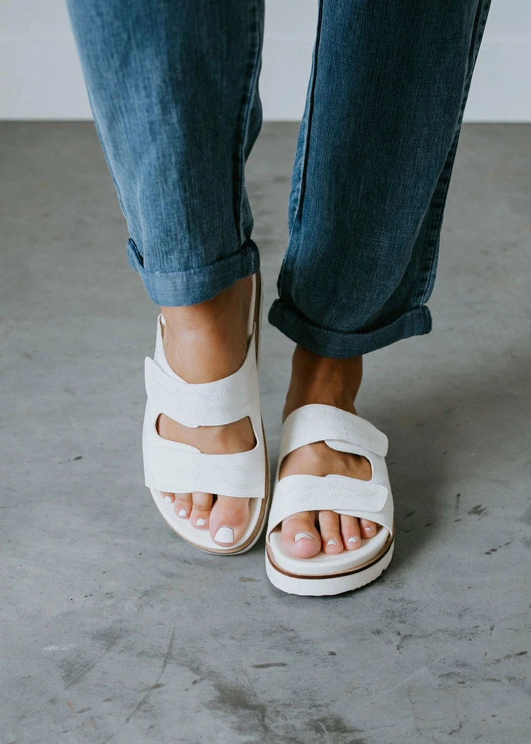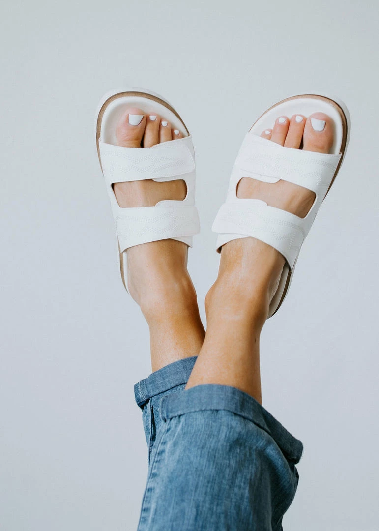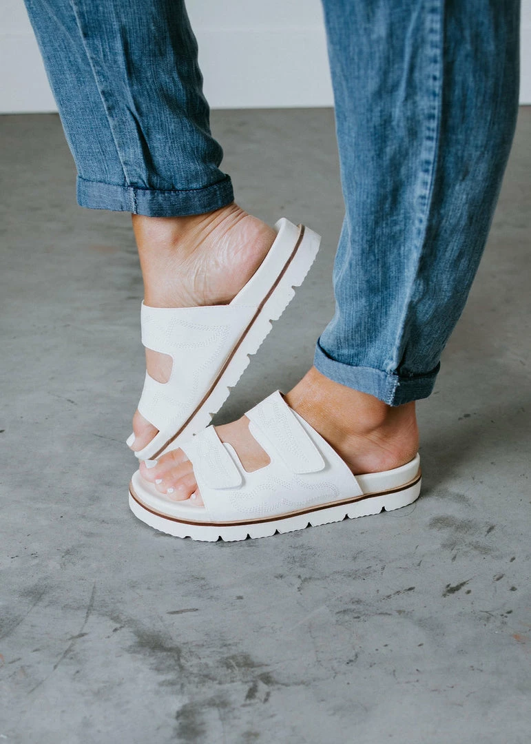 The Blissed Out Slide Sandal is a wear-with-everything style! Featured in a two-strap design that comes with a sporty sole, stitch detailing, and velcro closure.